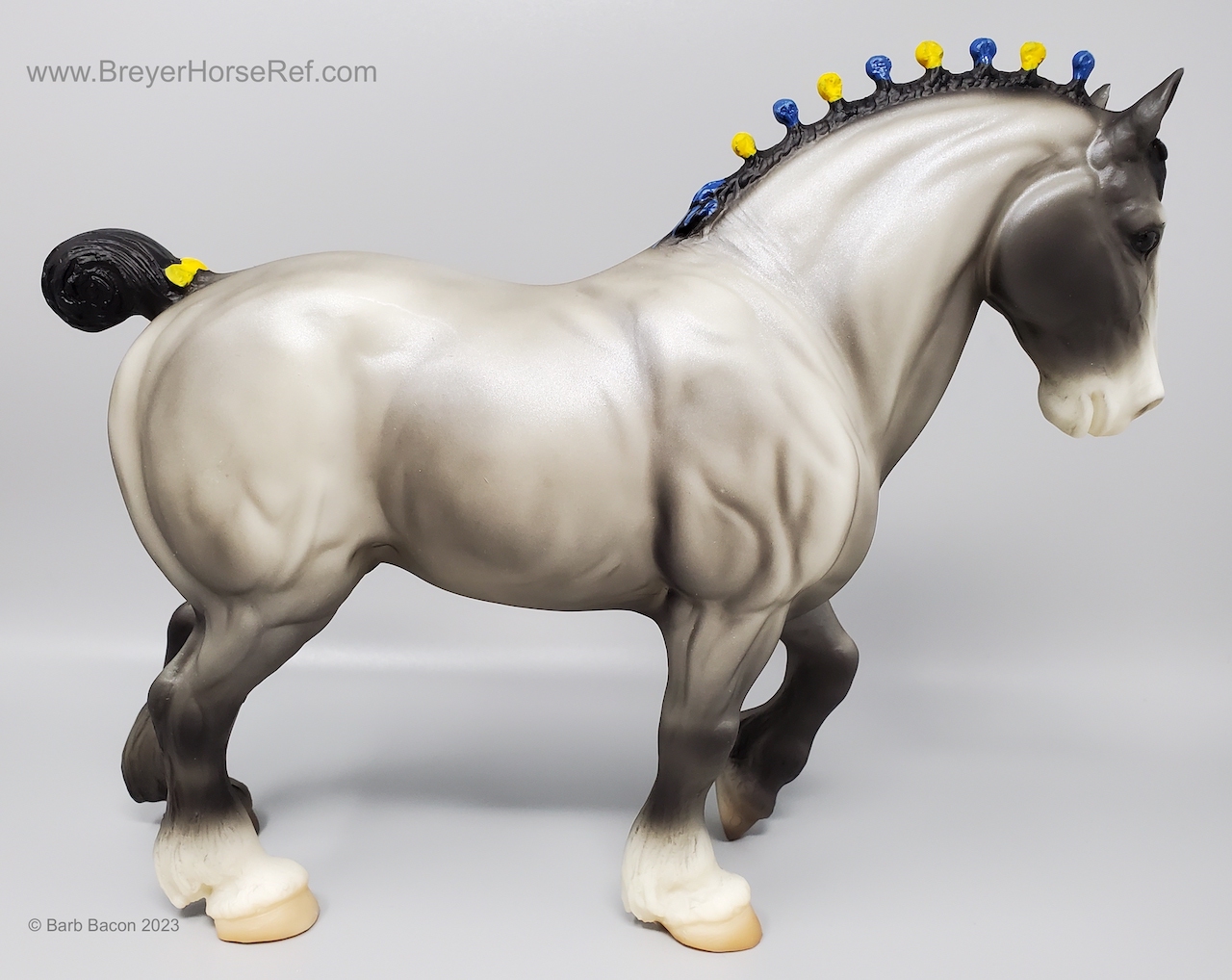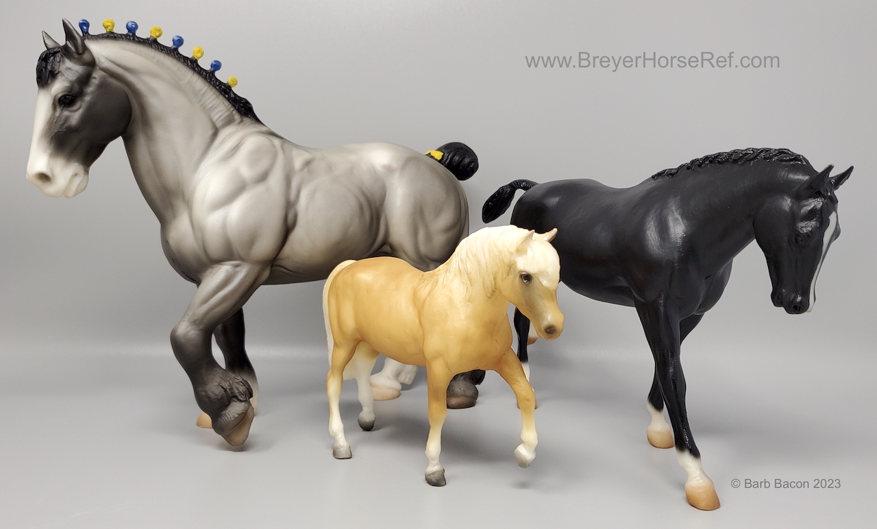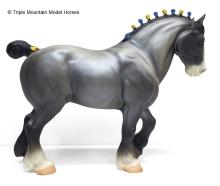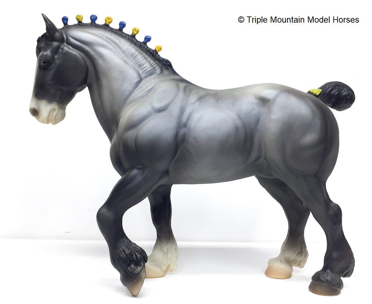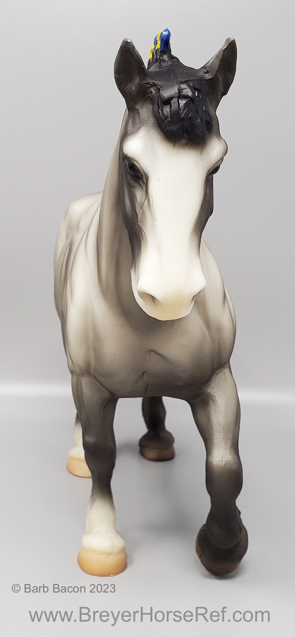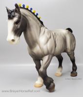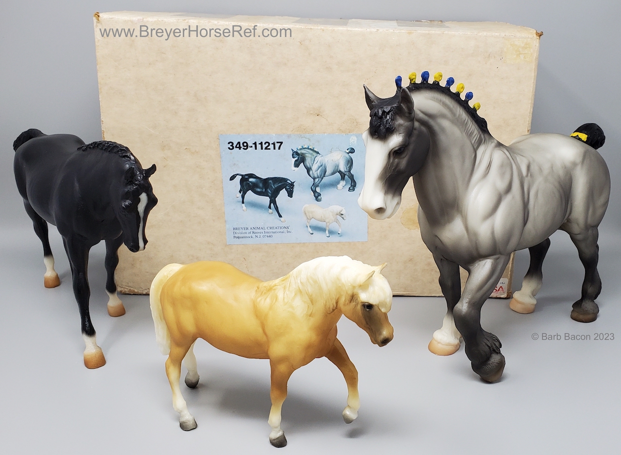 In a set with a Palomino Merrylegs, Black Cantering Welsh Pony and a Grullo Clydesdale Stallion. Yellow and Blue Bobs and Yellow Tail Ribbon. Advertised as a Grulla color, but more of a dark grey. Has no primitive markings. Sears Exclusive.