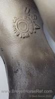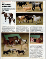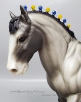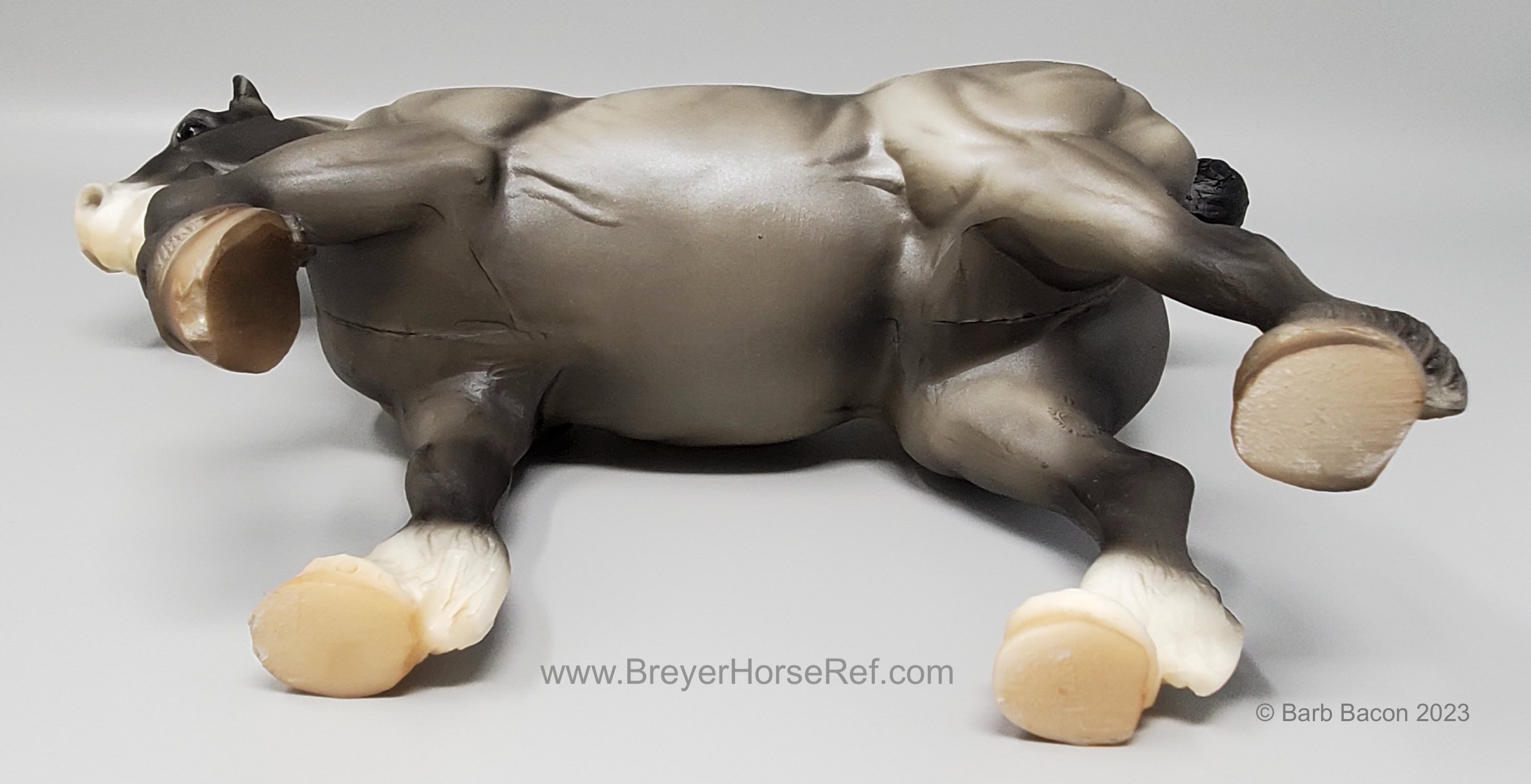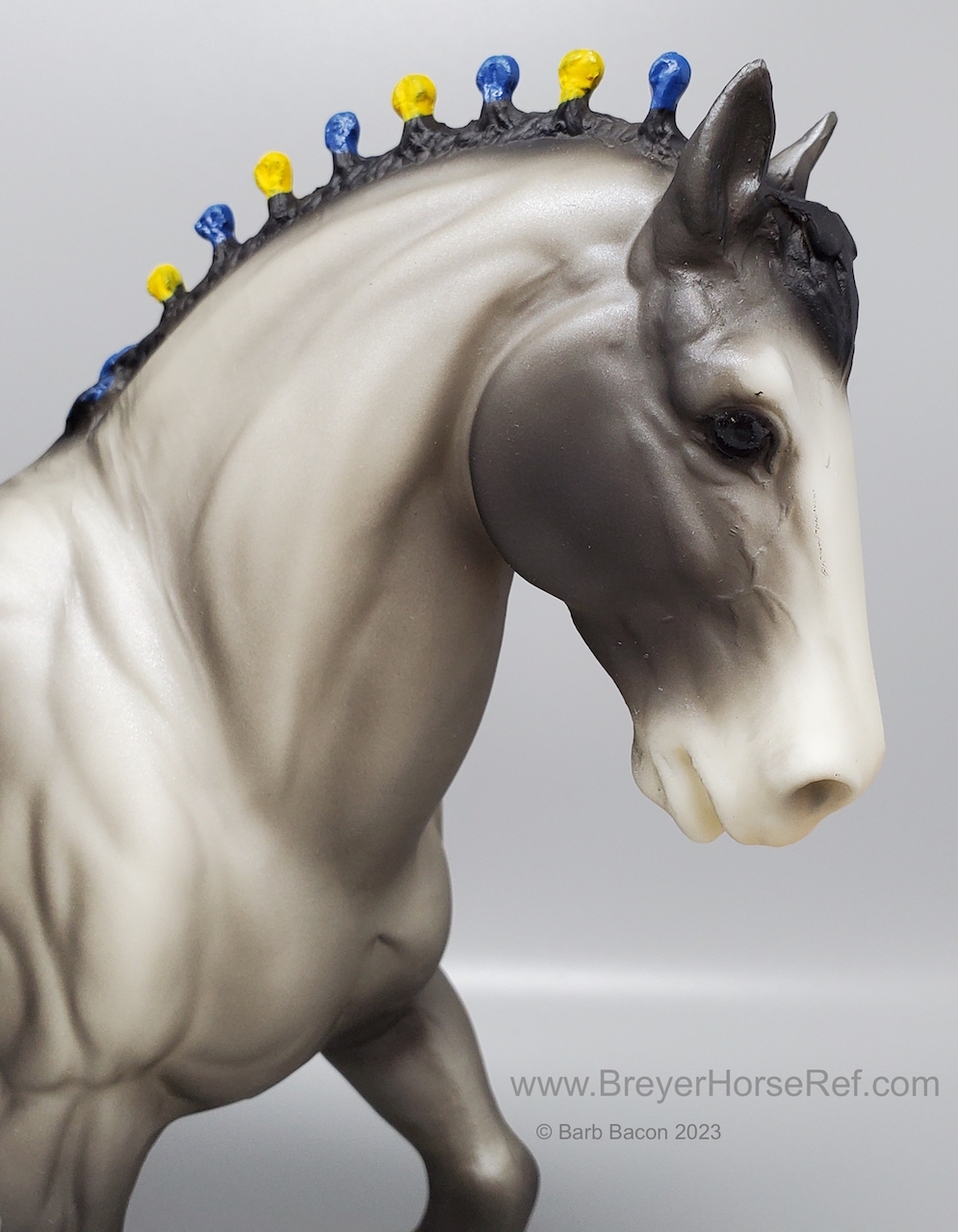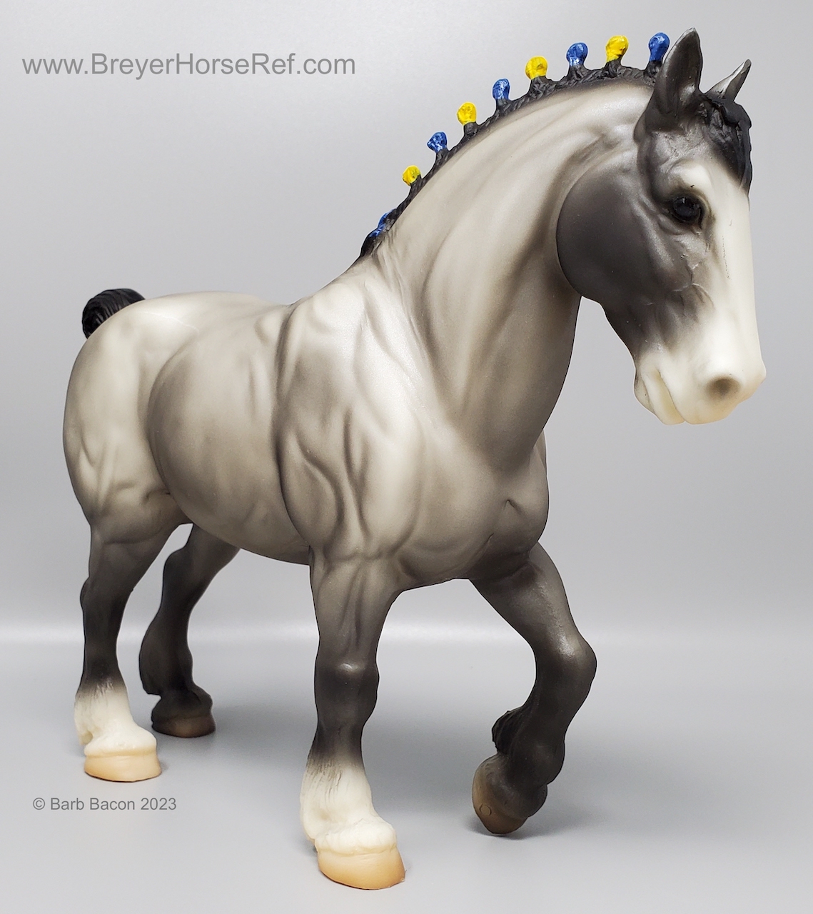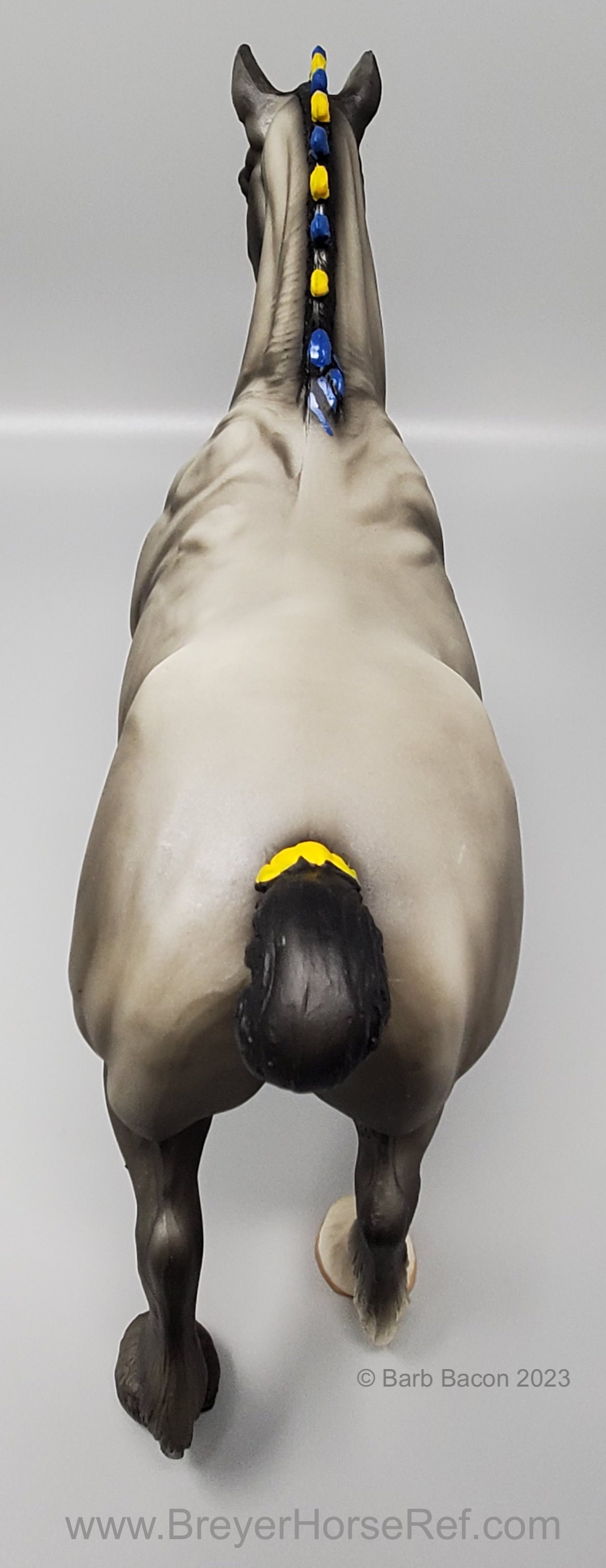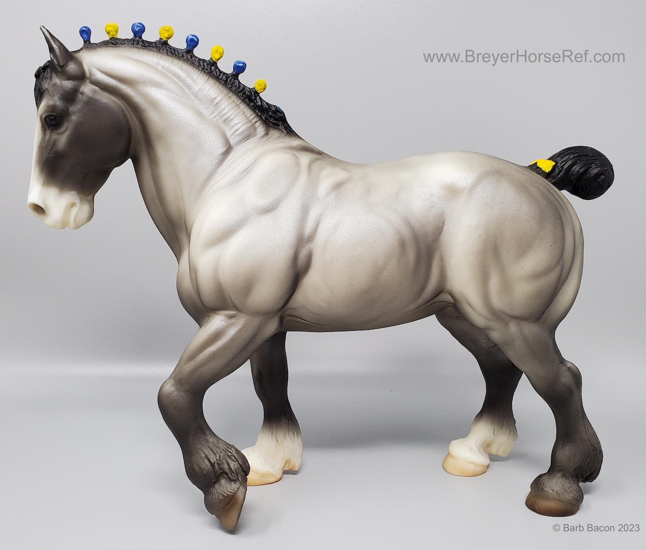 In a set with a Palomino Merrylegs, Black Cantering Welsh Pony and a Grullo Clydesdale Stallion. Yellow and Blue Bobs and Yellow Tail Ribbon. Advertised as a Grulla color, but more of a dark grey. Has no primitive markings. Sears Exclusive.