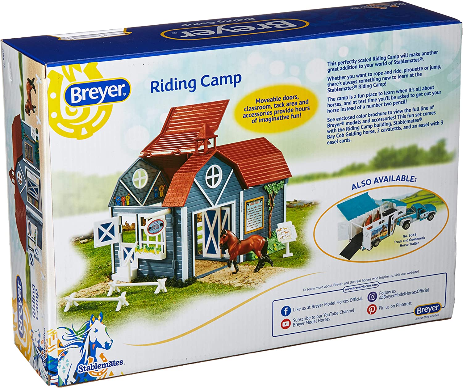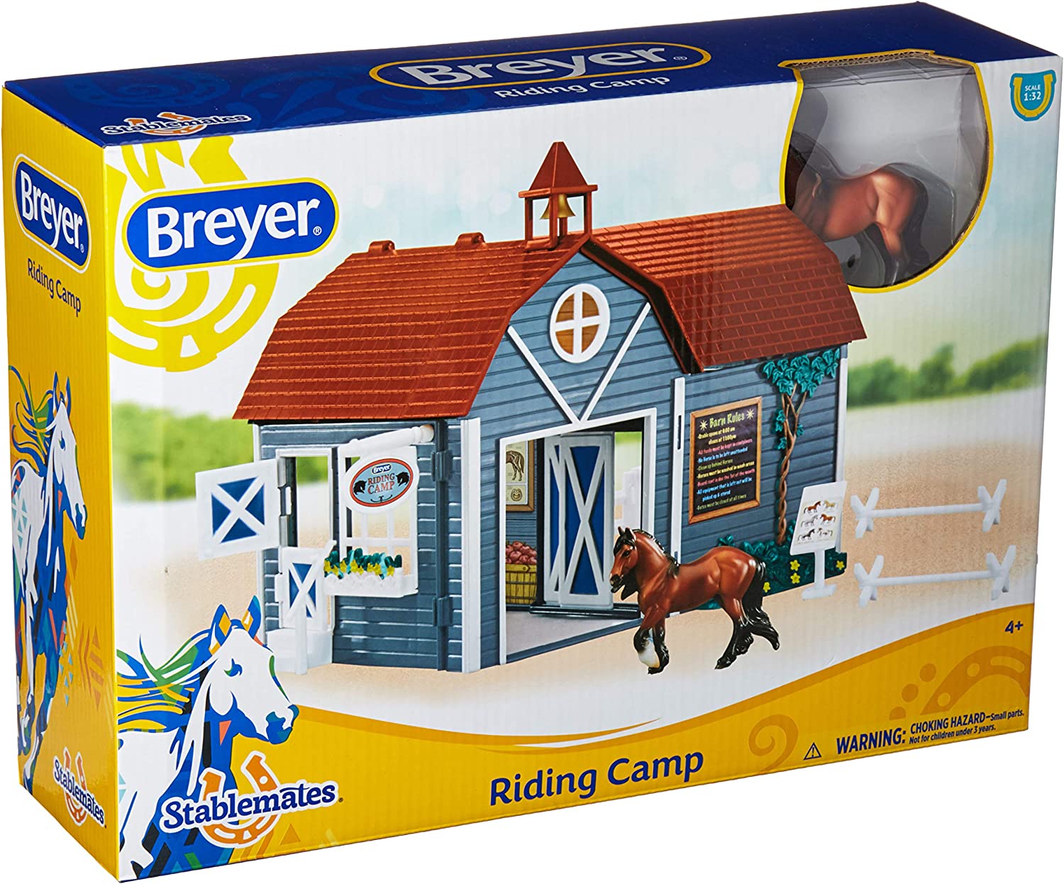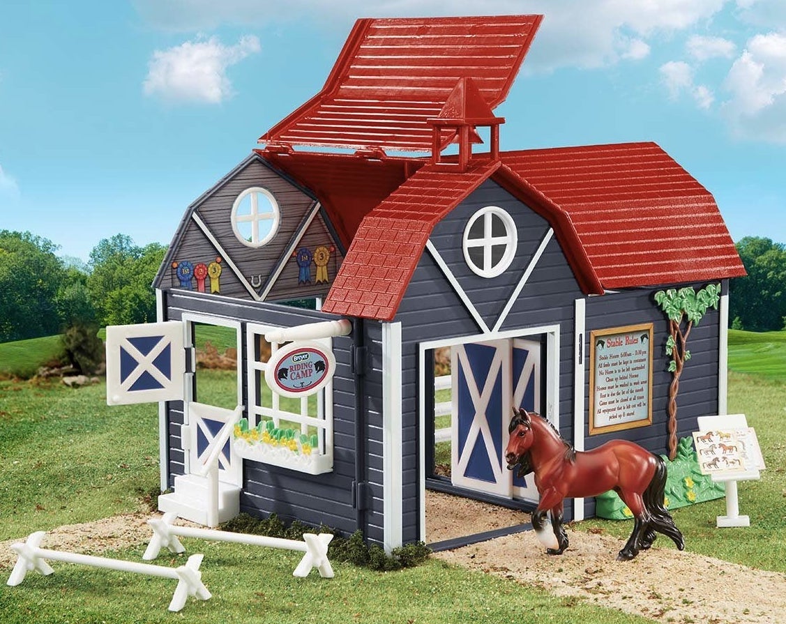 "The stable has 2 hinged roof sections for easy access to the interior, and working doors. Includes: barn, Stablemates Cob horse, 2 cavalettis, easel and 3 easel cards." www.breyerhorses.com.