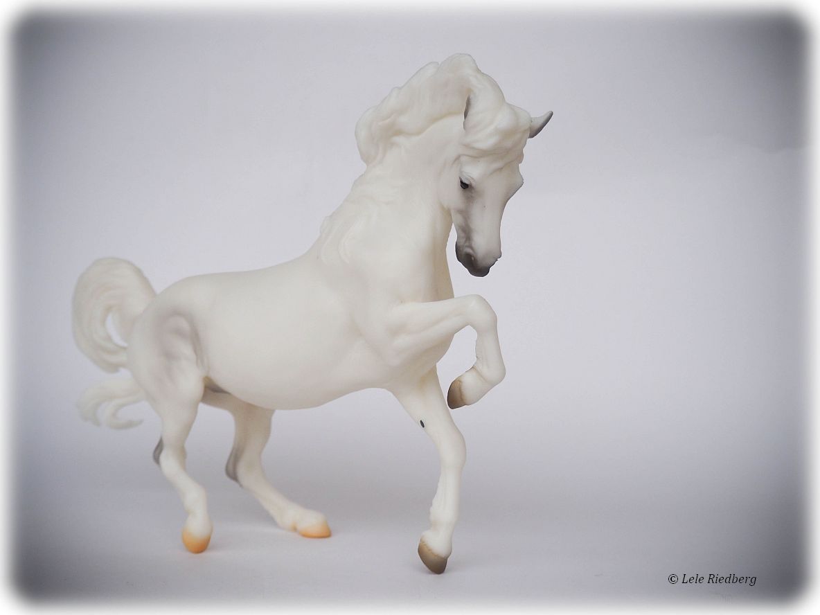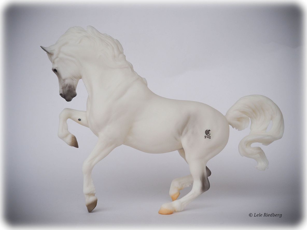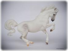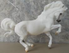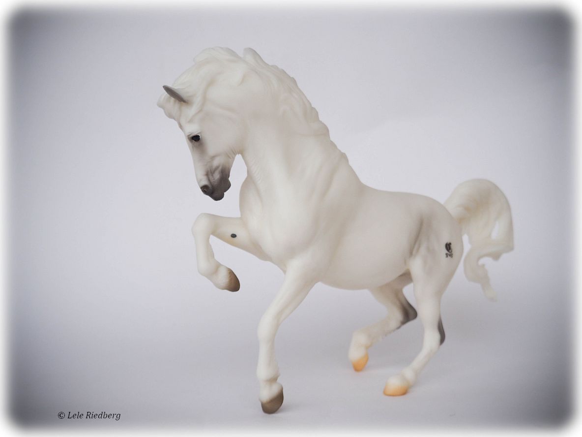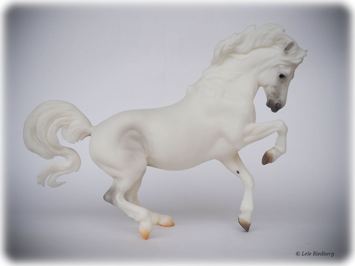 "Foaled in Denmark, this Connemara mare is a grand-daughter of the great Irish Connemara stud Oxenholme Marble. With owner Sean Sunner of Garryhinch Stud, she won numerous in-hand Supreme Championships. "Banks" was then acquired by Noel Noonan at Manor Connemara Ponies, who teamed her with rider Samantha Roberts. The striking snow-white grey won 12 major championships in one year culminating in victories at two of England's most iconic shows, the Horse of the Year and Olympia. With nothing left to prove, Banks was retired as a broodmare, in Connemara, at last." www.breyerhorses.com.