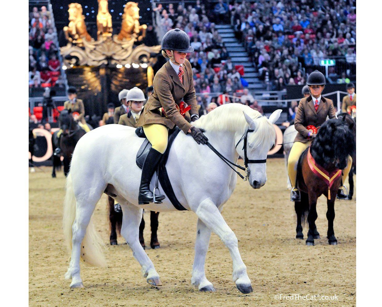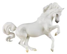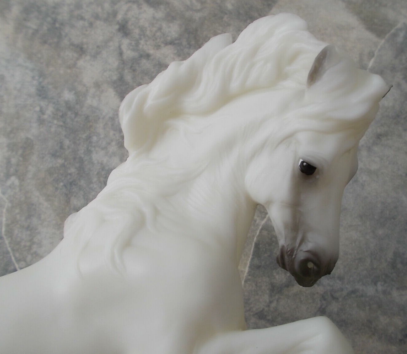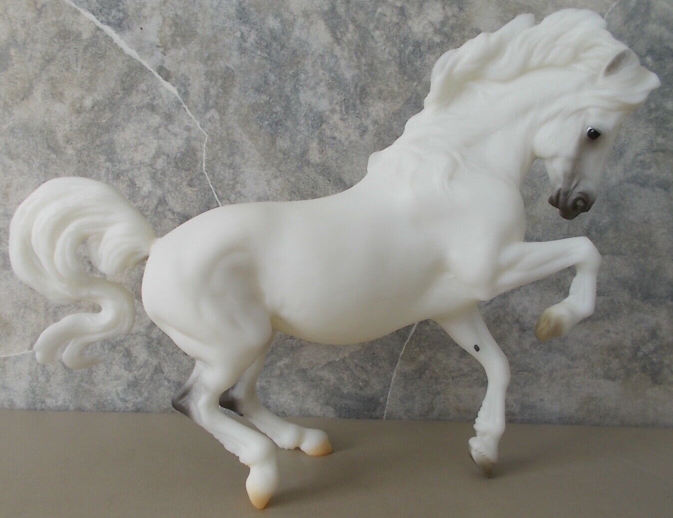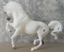 "Foaled in Denmark, this Connemara mare is a grand-daughter of the great Irish Connemara stud Oxenholme Marble. With owner Sean Sunner of Garryhinch Stud, she won numerous in-hand Supreme Championships. "Banks" was then acquired by Noel Noonan at Manor Connemara Ponies, who teamed her with rider Samantha Roberts. The striking snow-white grey won 12 major championships in one year culminating in victories at two of England's most iconic shows, the Horse of the Year and Olympia. With nothing left to prove, Banks was retired as a broodmare, in Connemara, at last." www.breyerhorses.com.
