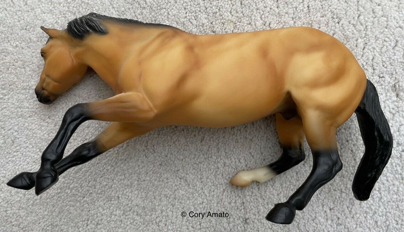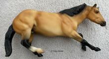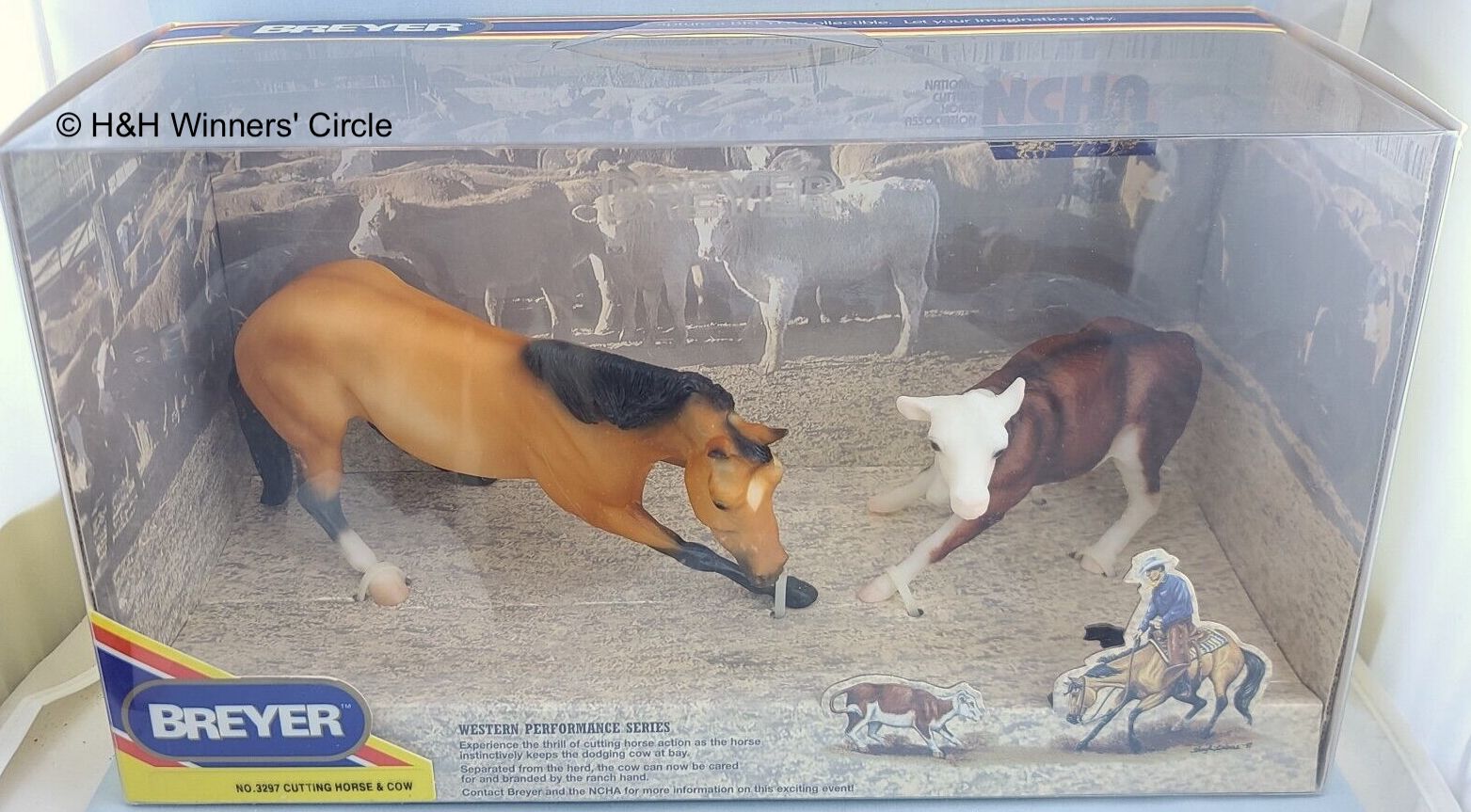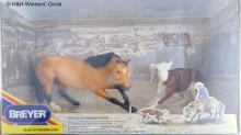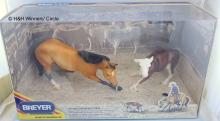 Buckskin with black points, dorsal stripe, back right stocking, and a star. Included a reddish brown and white Cutting Calf. Original sets were released during BreyerFest 1997 where Carol Herden was available to sign models. This set was also available through Sears in 1997. On the 1999 Retired List. Sheryl Leisure did the artwork of the cutter and calf on the box. These models did not have the bicolor eyes found on early 1997 releases, as these were released after that timeframe.