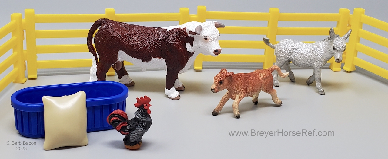 Ranch Friends Set #5366 released 2013-2014. Donkey is a very silvery grey color. Set also included a Bull, Rooster, Calf, 4 Pieces of Fence, Water Trough, and Oat Bag. On the 2014 Retired List, but still shown in the 2014/2015 catalog. These animals are made of a heavier plastic than the typical ABS Stablemate plastic. See separate records for more photos of the animals.