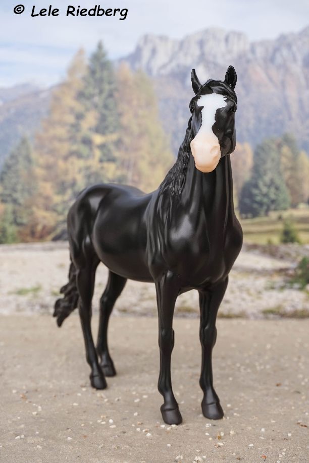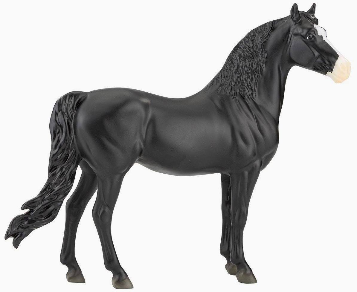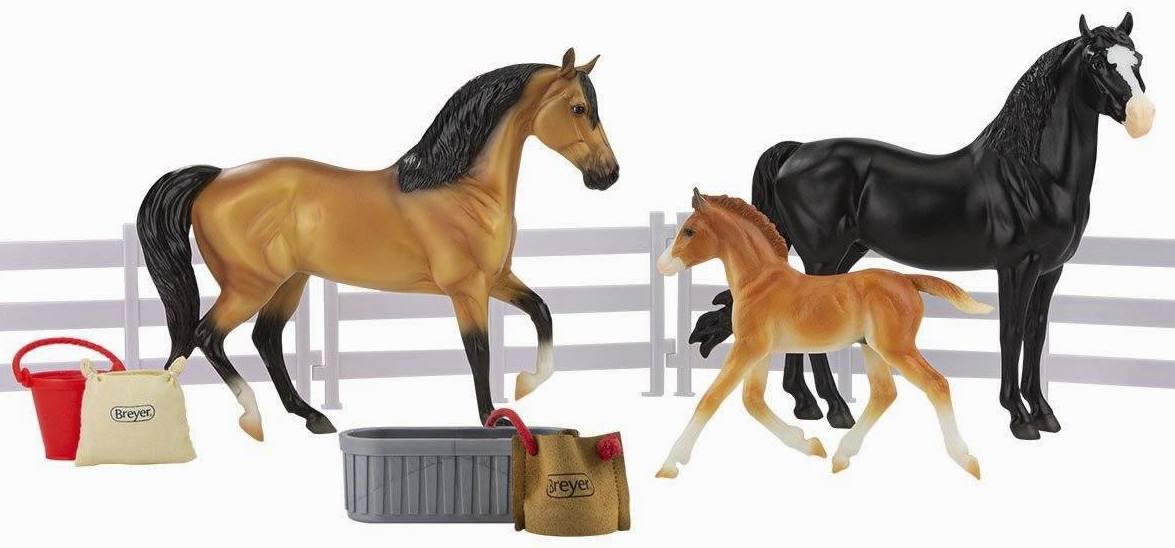"The Spanish Mustang is descended from the horses brought to the Americas by Spanish explorers. While they’re found in almost every color and pattern, a common characteristic is that their heads usually have a Spanish-type straight or convex profile. While small in stature, the Spanish Mustang is known for being hardy, having strong hooves, and being intelligent. This new set includes Stallion, Mare, Foal, 6 pieces of fencing, water trough, water bucket, feed bag, and bag of feed." www.breyerhorses.com. Set included Fairfax, Mariah and the Haflinger Foal. On the 2024 Retired List.