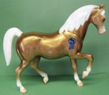 "Ali, The Third Release in the 2017 Vintage Club. The charming prancing Family Arabian Stallion was sculpted by Chris Hess and originally released in 1959. This sentimental favorite has been released in many colors and finishes over the years, but never before in the classic decorator colors of the 1960s. Ali comes in either Gold Charm, Florentine, Wedgewood, or Copenhagen, a true throwback to the vintage style of the sixties era. In keeping with vintage tradition, the box features a gold sticker indicating which color is inside." www.breyerhorses.com. 2017 Vintage Collectors Club Stamp on belly.