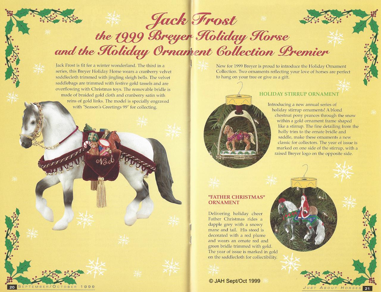 Season’s Greetings 1999 Stamp on belly. Also available through JC Penney in 1999. Third in the Holiday Horse Series. On the 1999 Retired List.