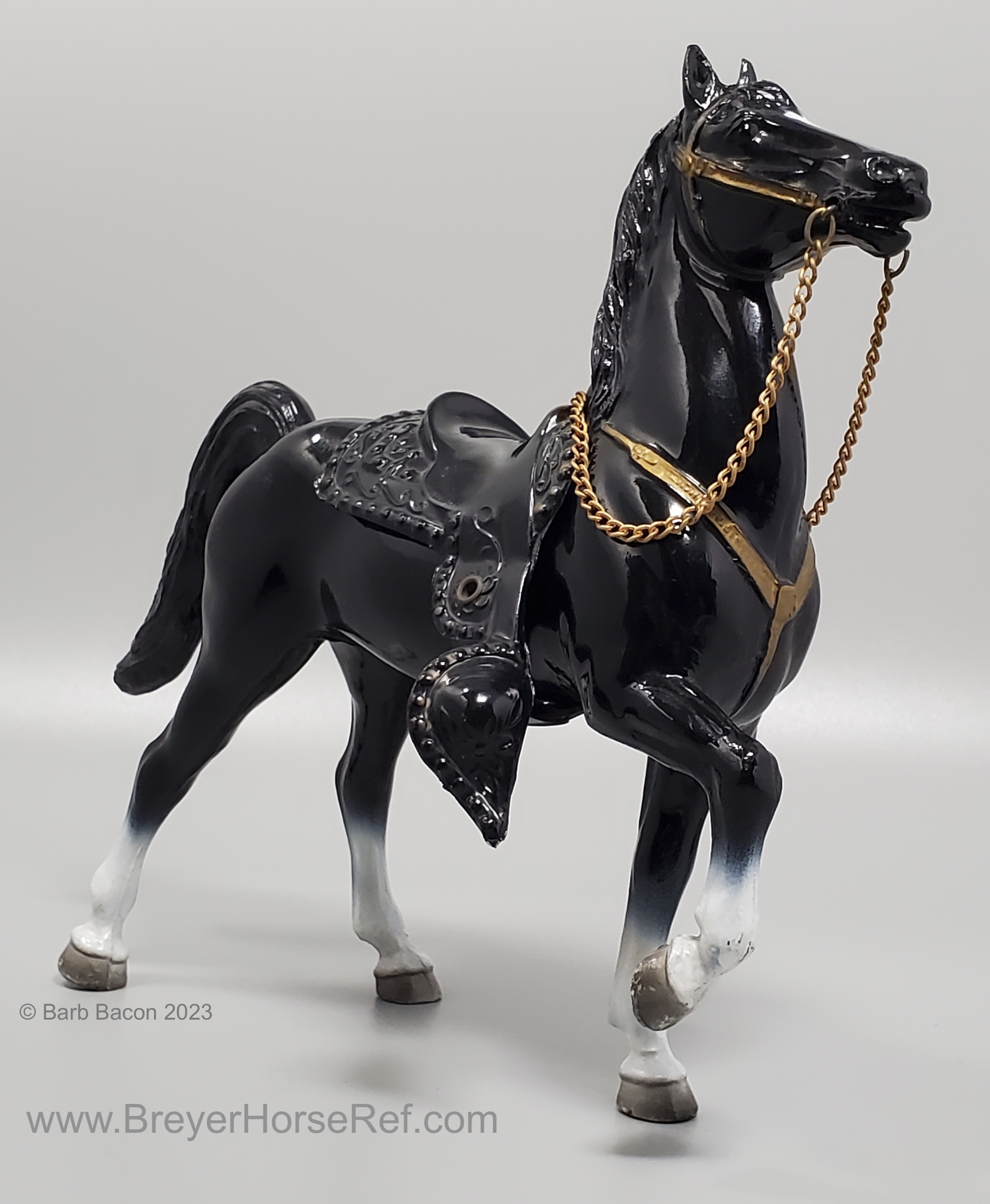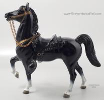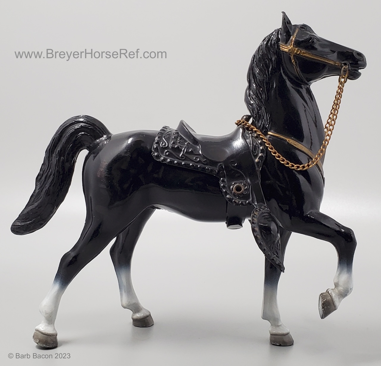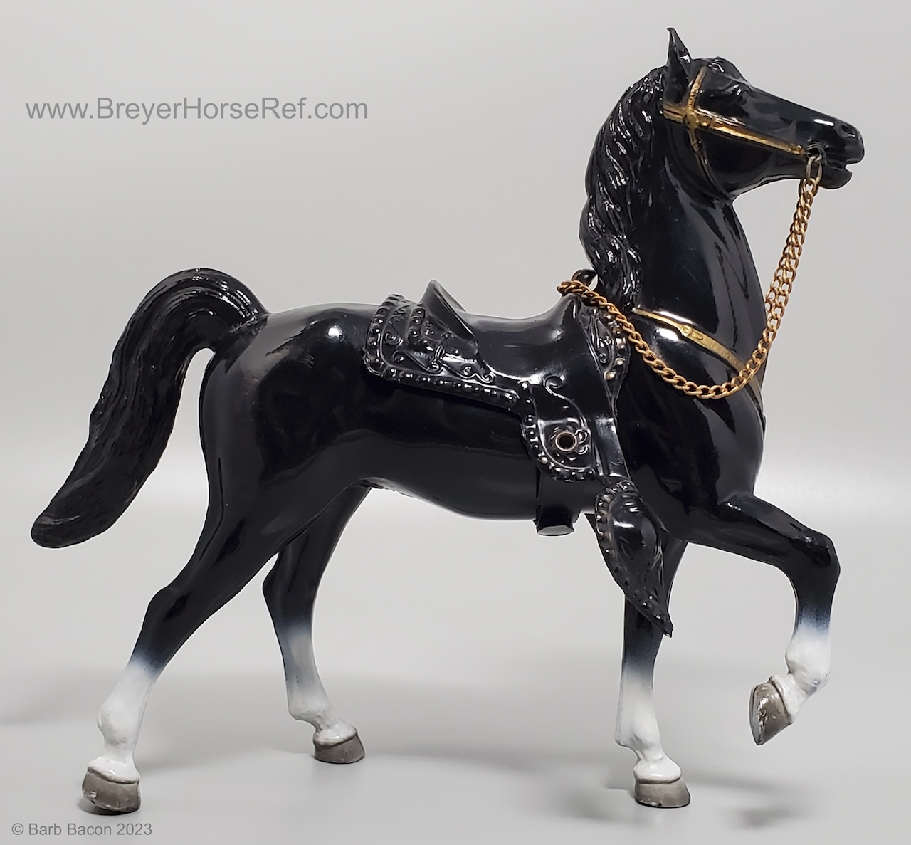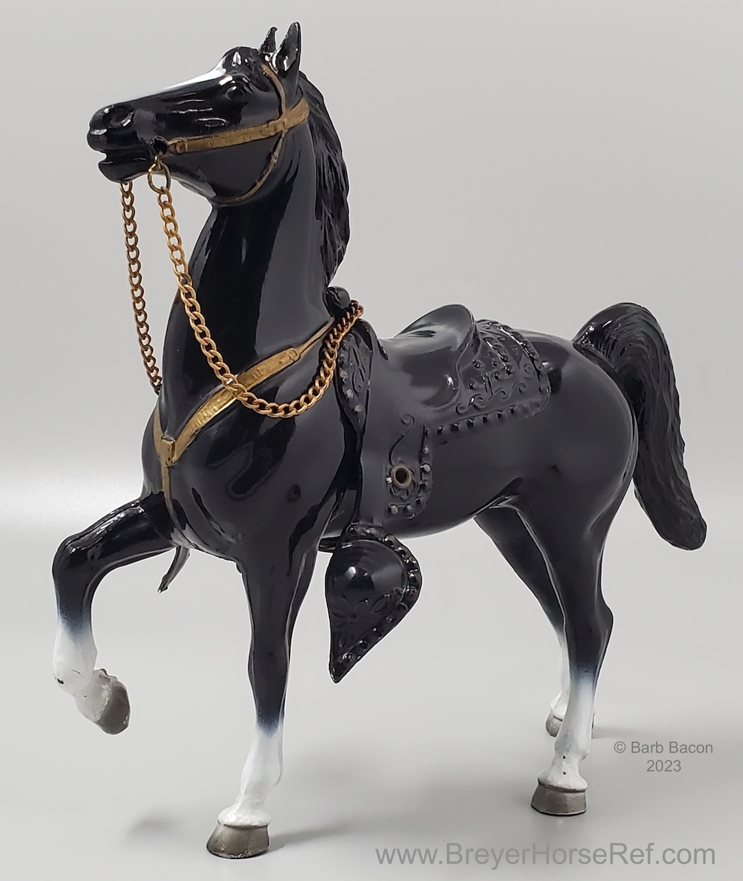 These models were all made from either white, black or dark brown plastic and had a glossy appearance. The four socks were usually painted on, but some could be unpainted white plastic, and could have black, grey or white hooves. The face has a stenciled V-shaped star or blaze, or an un-stenciled bald face. The mane and tail were the same color as the body, but the tail could be white tipped. The breast collar, saddle trim, and bridle could be silver or gold with brass chain reins. This rider-less release had a black hard plastic Western saddle with tapaderos. This saddle had either the high or low grommet snap-on cinch. In 1956-1957, a brown hard plastic English saddle with removable red saddle blanket was available.
