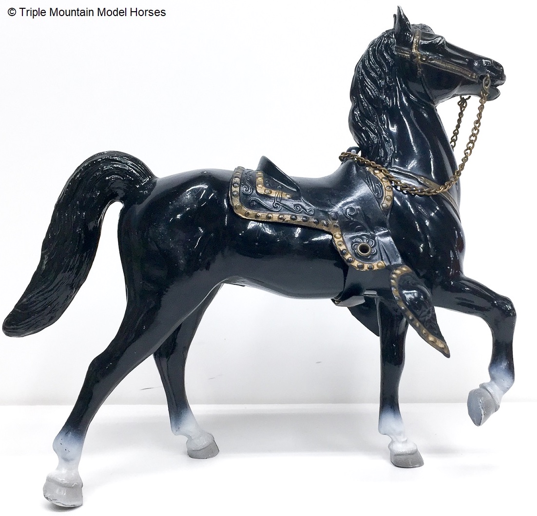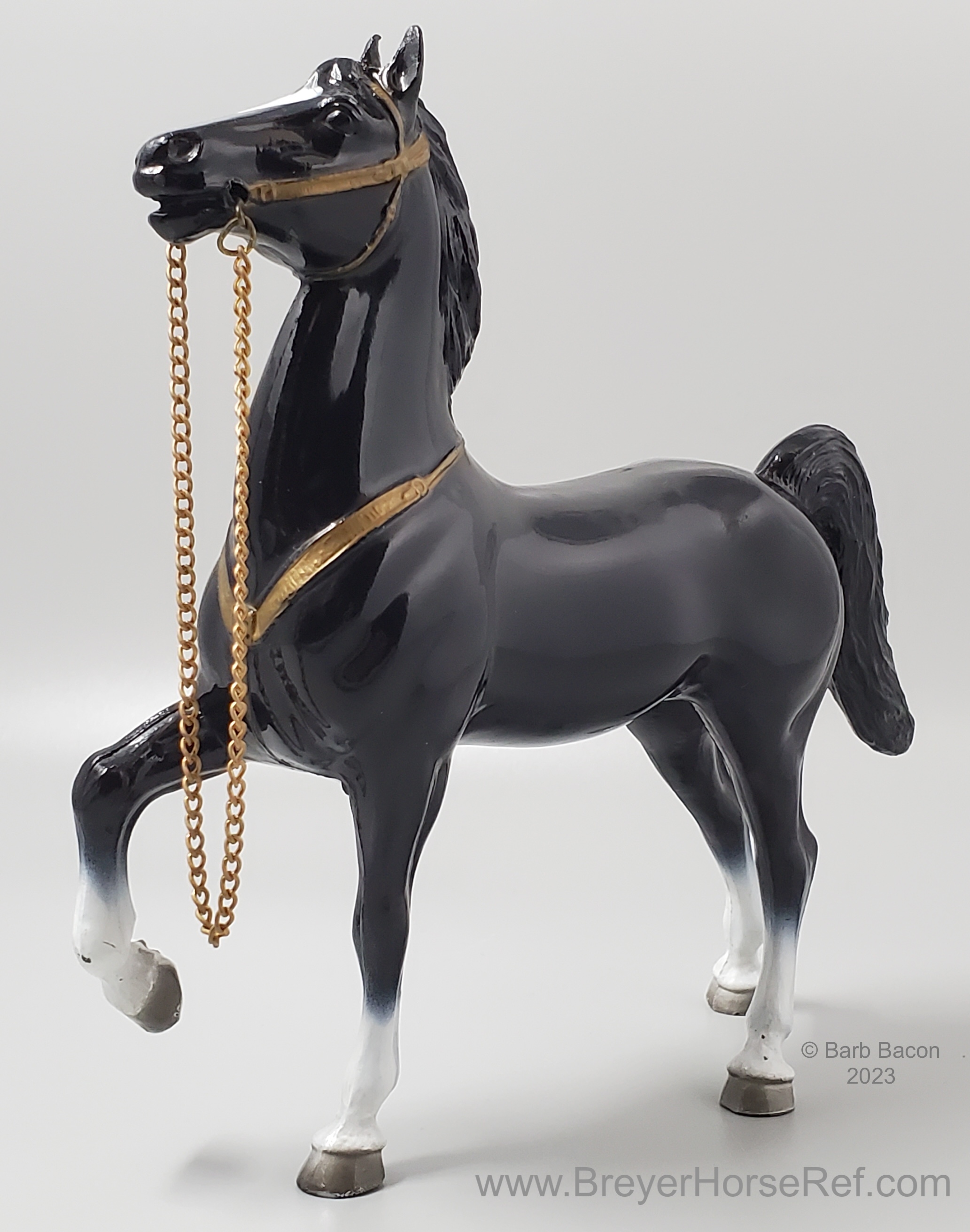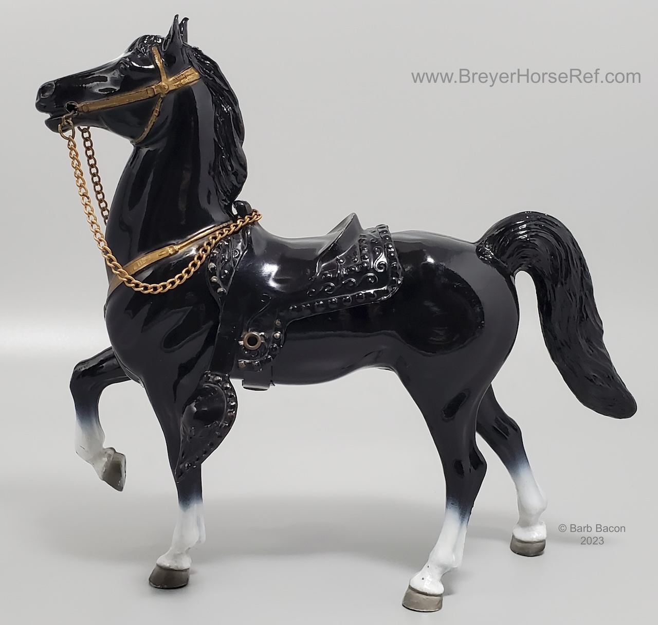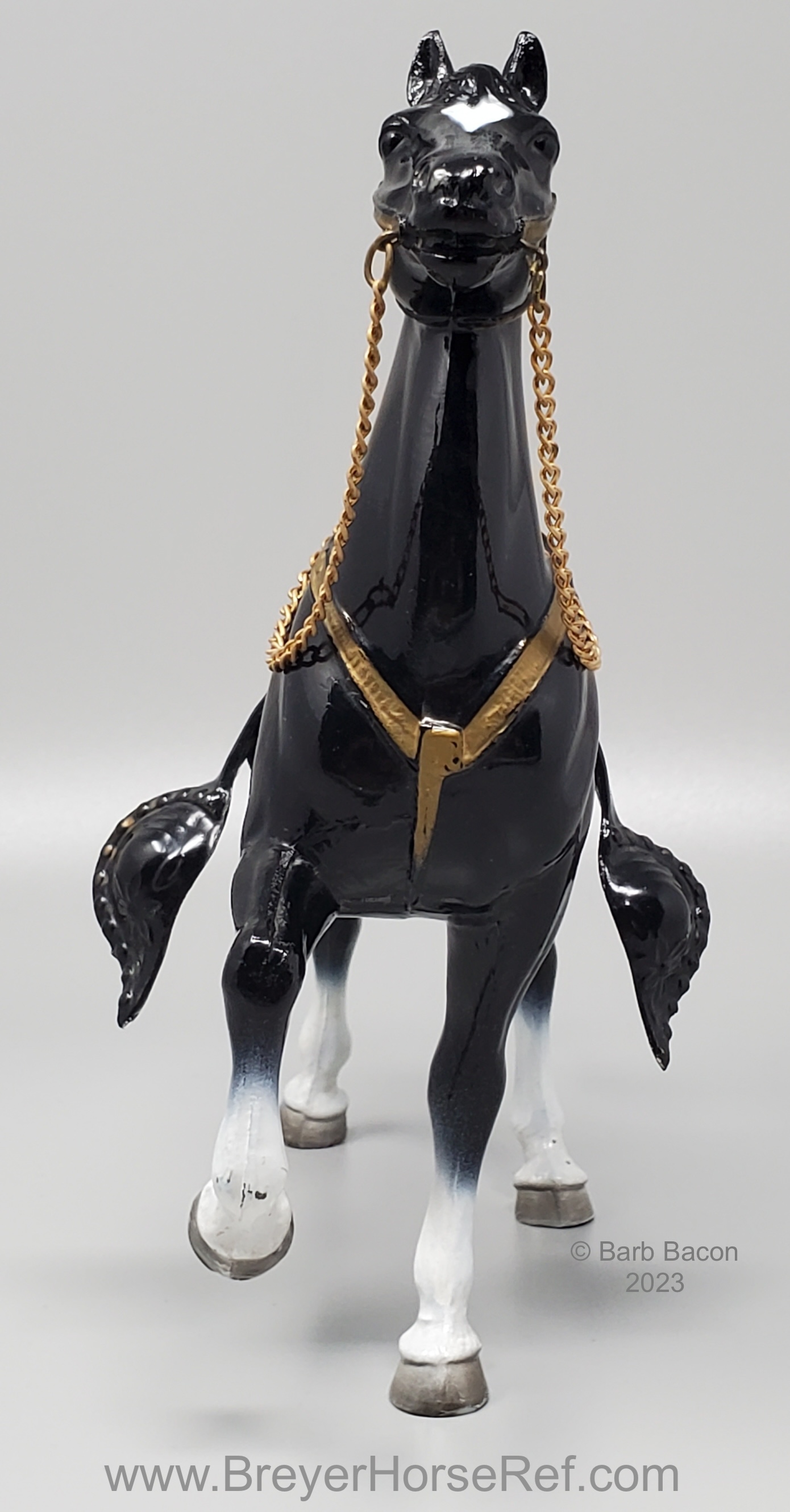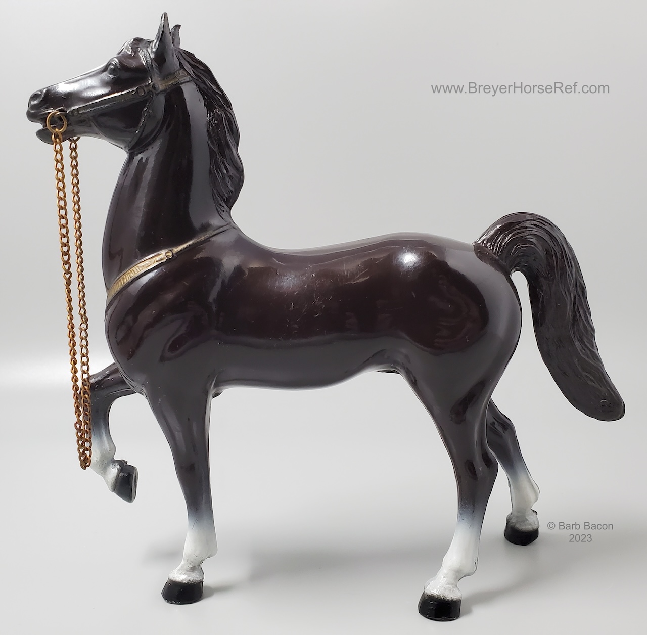 These models were all made from either white, black or dark brown plastic and had a glossy appearance. The four socks were usually painted on, but some could be unpainted white plastic, and could have black, grey or white hooves. The face has a stenciled V-shaped star or blaze, or an un-stenciled bald face. The mane and tail were the same color as the body, but the tail could be white tipped. The breast collar, saddle trim, and bridle could be silver or gold with brass chain reins. This rider-less release had a black hard plastic Western saddle with tapaderos. This saddle had either the high or low grommet snap-on cinch. In 1956-1957, a brown hard plastic English saddle with removable red saddle blanket was available.