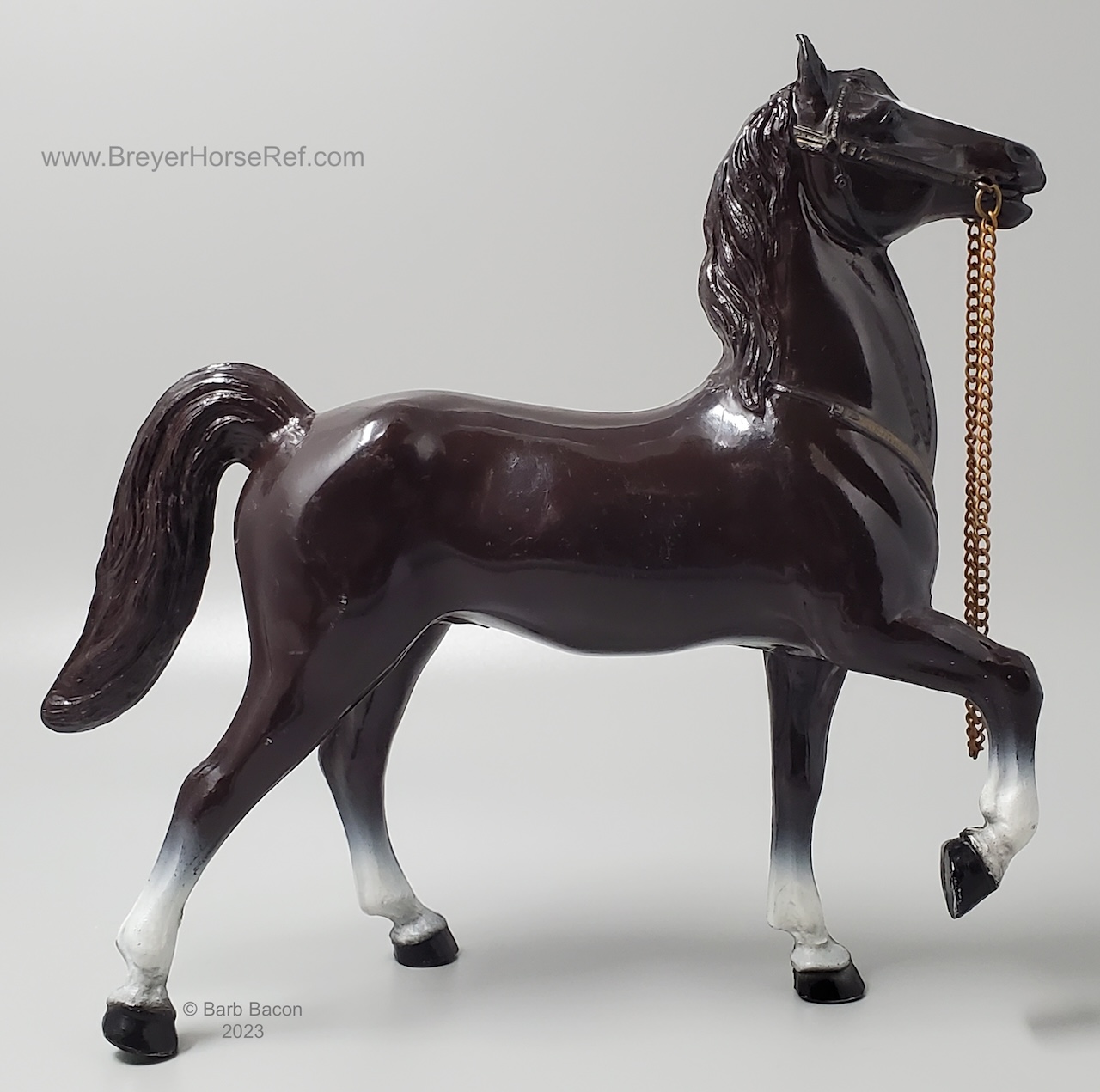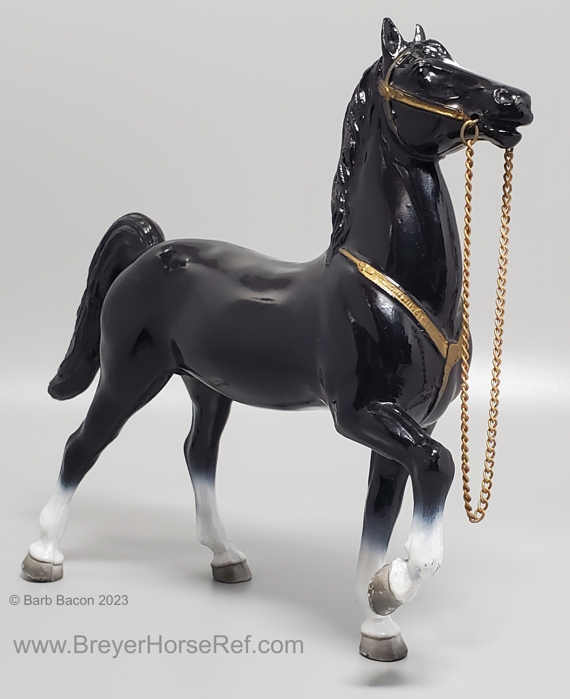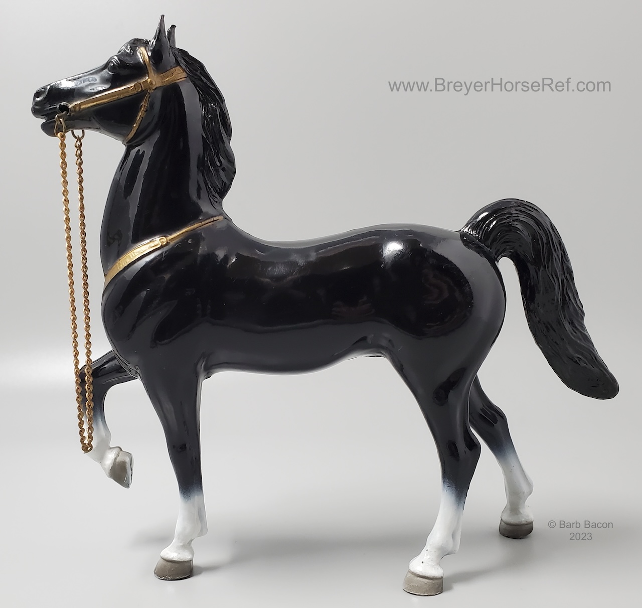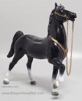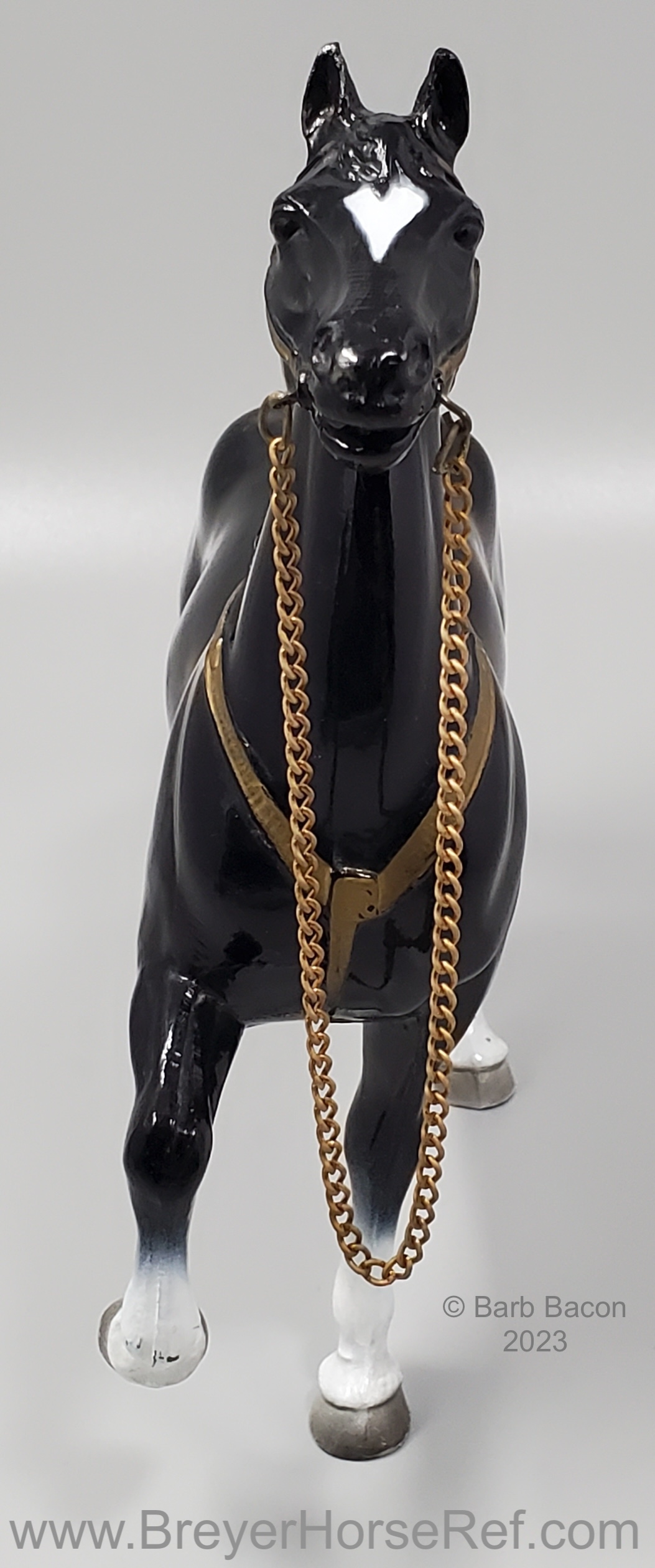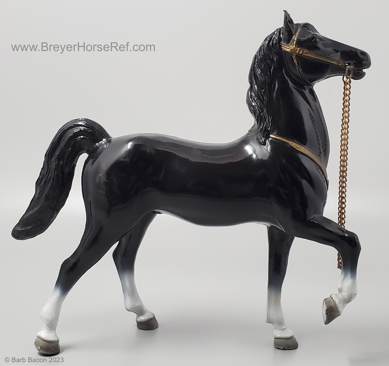 These models were all made from either white, black or dark brown plastic and had a glossy appearance. The four socks were usually painted on, but some could be unpainted white plastic, and could have black, grey or white hooves. The face has a stenciled V-shaped star or blaze, or an un-stenciled bald face. The mane and tail were the same color as the body, but the tail could be white tipped. The breast collar, saddle trim, and bridle could be silver or gold with brass chain reins. This rider-less release had a black hard plastic Western saddle with tapaderos. This saddle had either the high or low grommet snap-on cinch. In 1956-1957, a brown hard plastic English saddle with removable red saddle blanket was available.