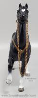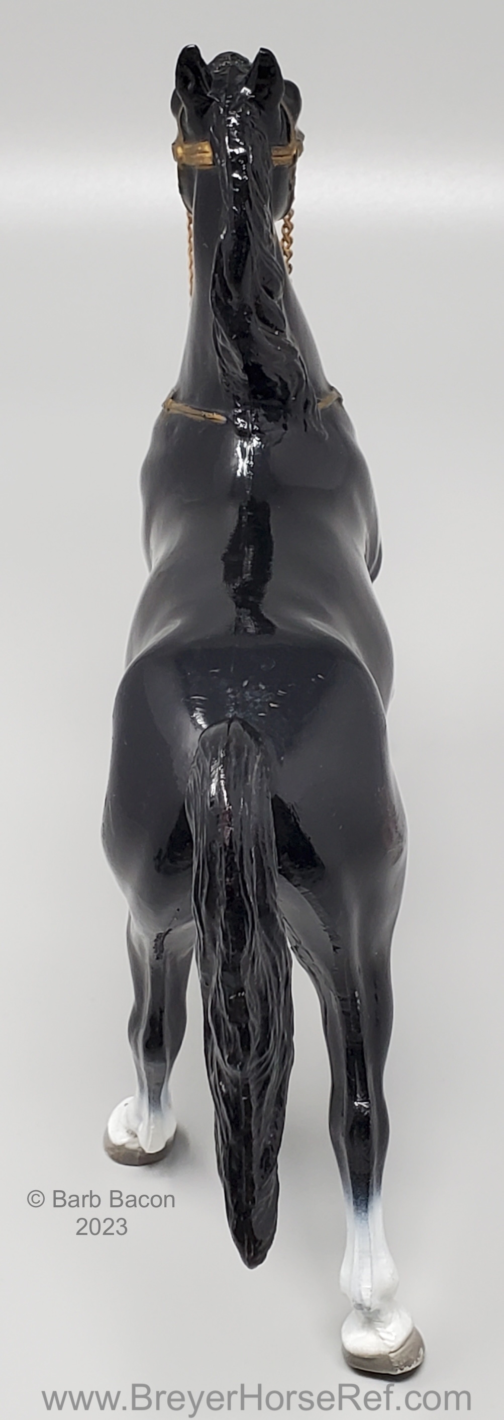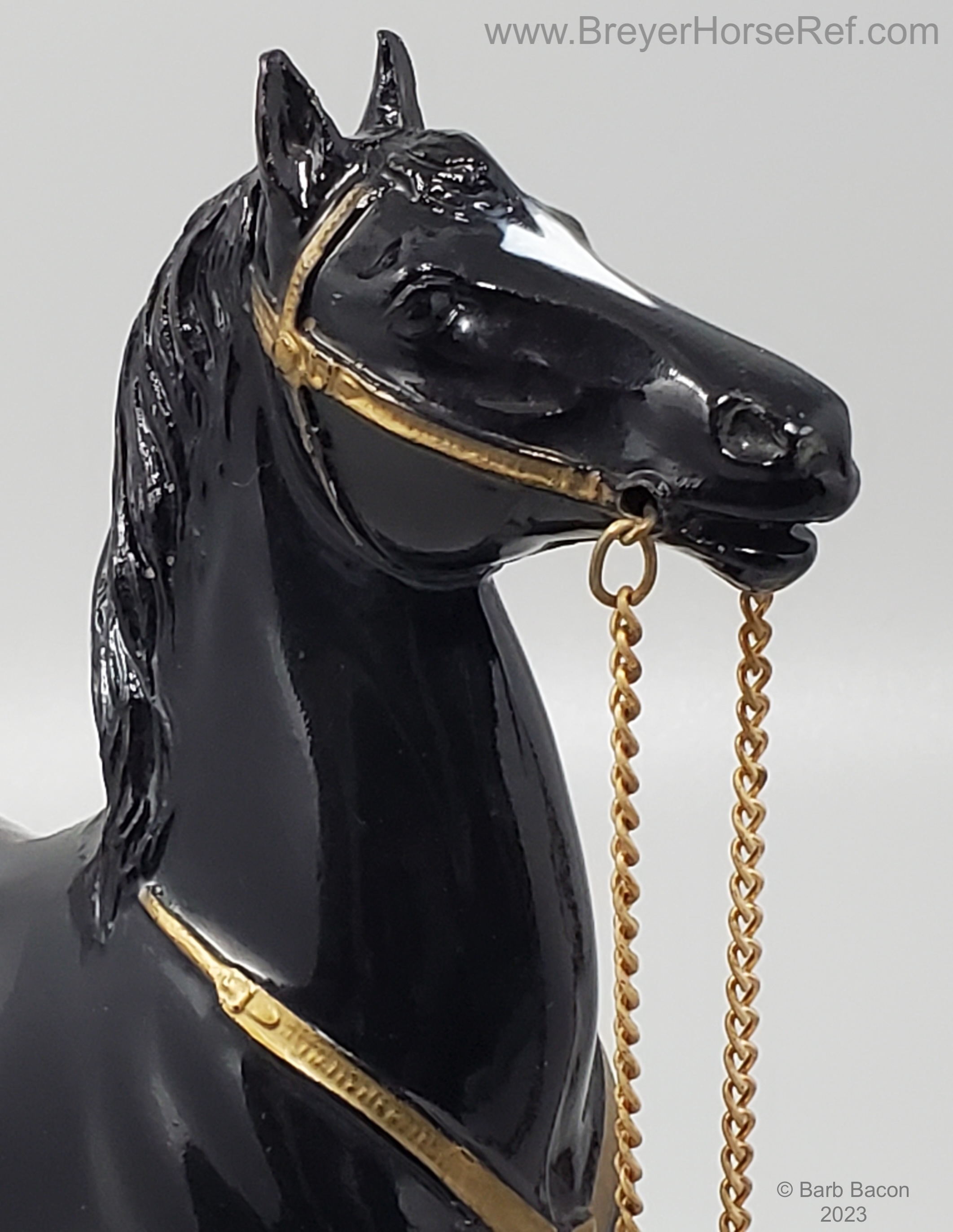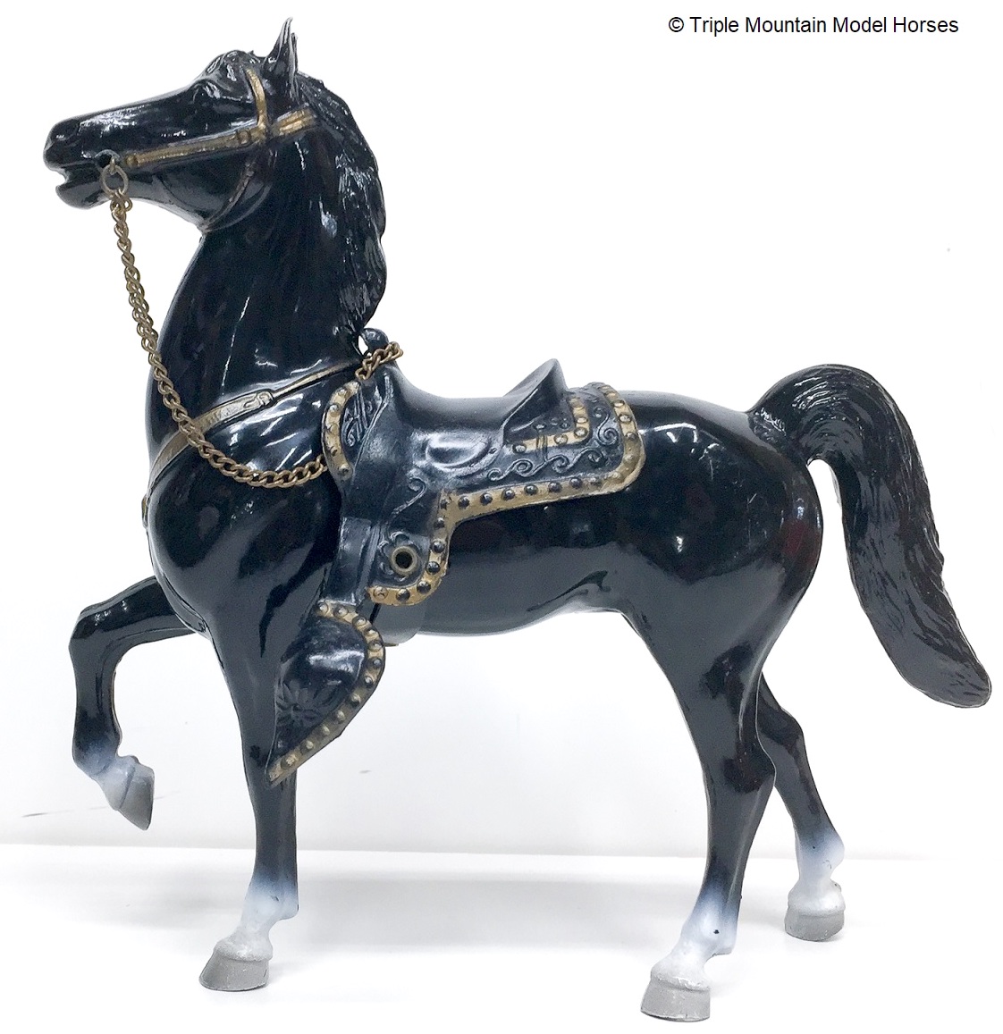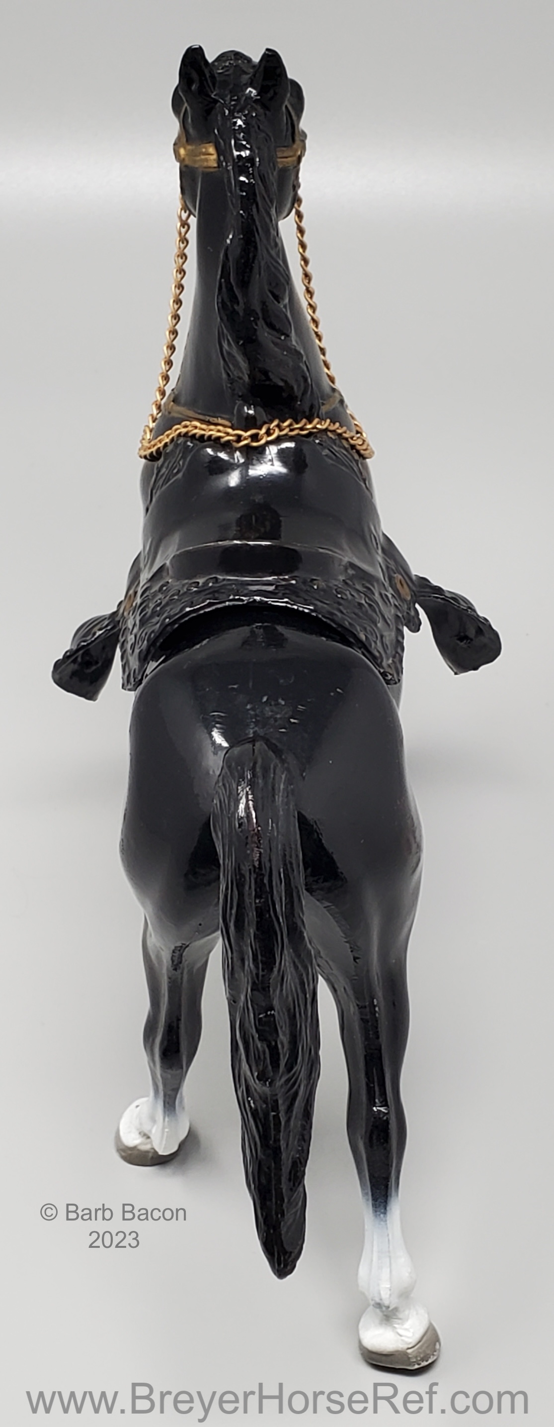 These models were all made from either white, black or dark brown plastic and had a glossy appearance. The four socks were usually painted on, but some could be unpainted white plastic, and could have black, grey or white hooves. The face has a stenciled V-shaped star or blaze, or an un-stenciled bald face. The mane and tail were the same color as the body, but the tail could be white tipped. The breast collar, saddle trim, and bridle could be silver or gold with brass chain reins. This rider-less release had a black hard plastic Western saddle with tapaderos. This saddle had either the high or low grommet snap-on cinch. In 1956-1957, a brown hard plastic English saddle with removable red saddle blanket was available.