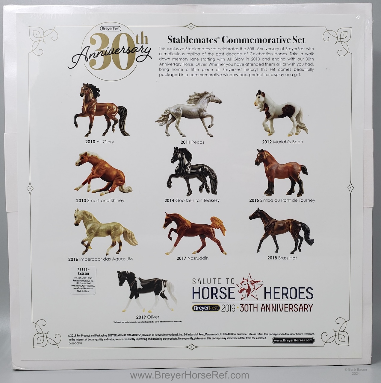 "To celebrate our 30th Anniversary, we’ve created this adorable 10-piece set of the last ten years’ worth of Celebration Horses, all in miniature. You might remember that for our 20th Birthday Bash, we did a set of the first 20 years of Celebration Models in a similar fashion, but this year’s set boasts beautifully updated pearlescent packaging." www.breyerhorses.com. Set included the Prancing Morgan, Walking TB, Friesian, Paso Fino, Cob, Darley, Trotting Warmblood, Mirado, Drafter and Reining Horse.
