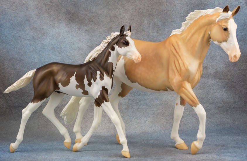 "Giselle and Gilen were sculpted by Brigitte Eberl, and made their BreyerFest debut back in 2010 as Stage Mom and Child Star. This time, Giselle is in a gorgeous chalky Soft Dapple Palomino Splash Pinto and Gilen is a chalky Silver Black Splash Pinto." www.breyerhorses.com.