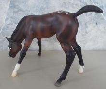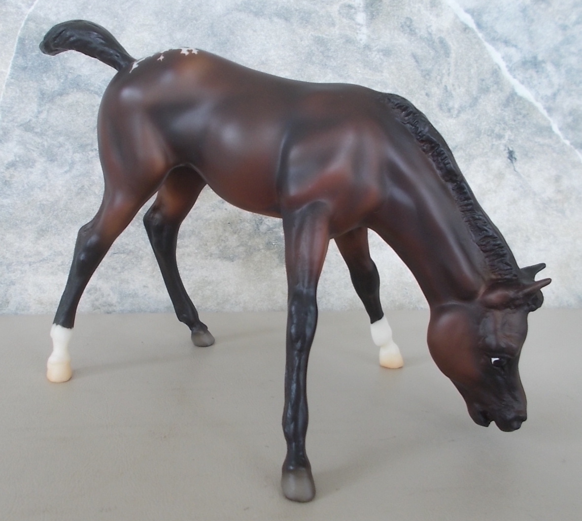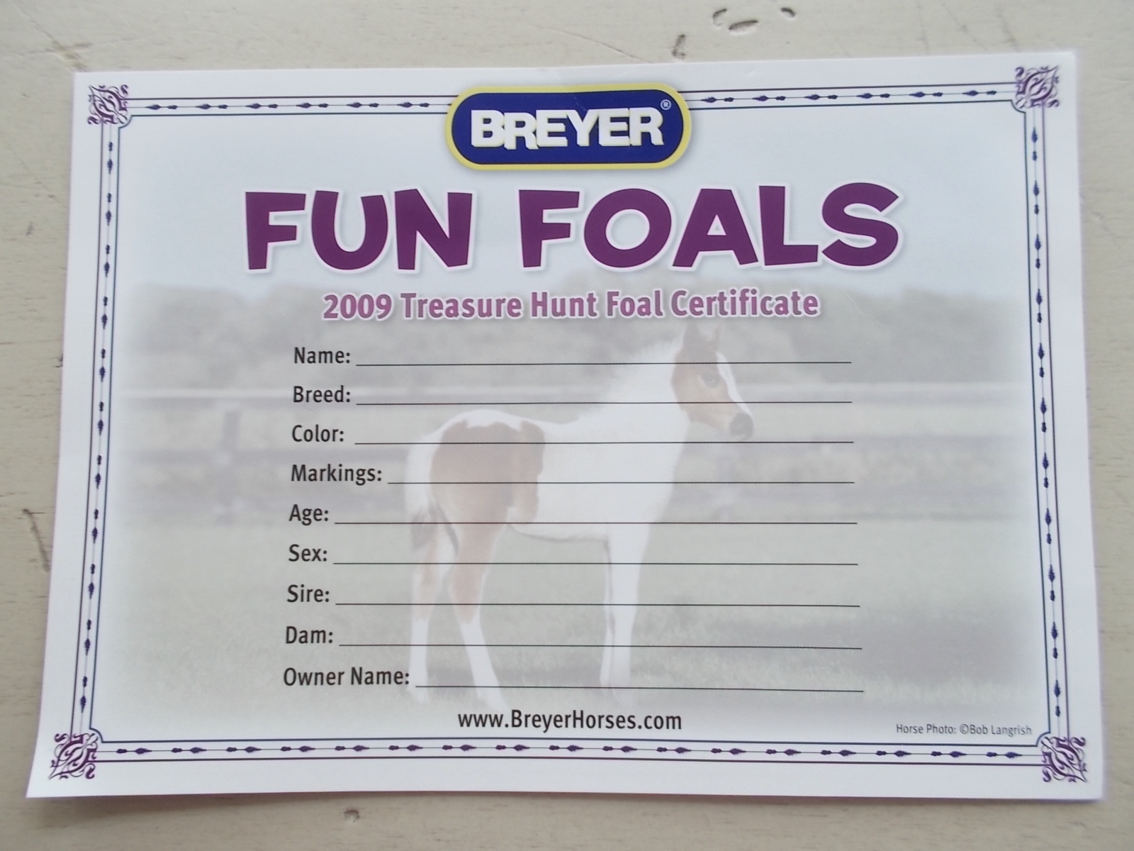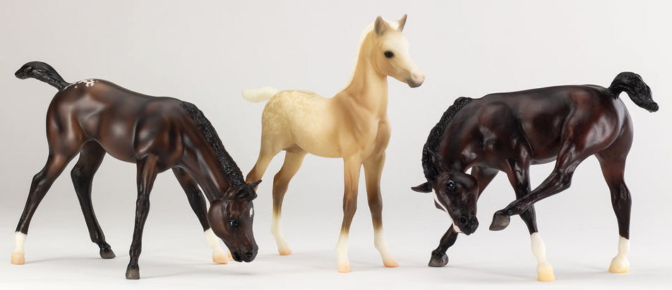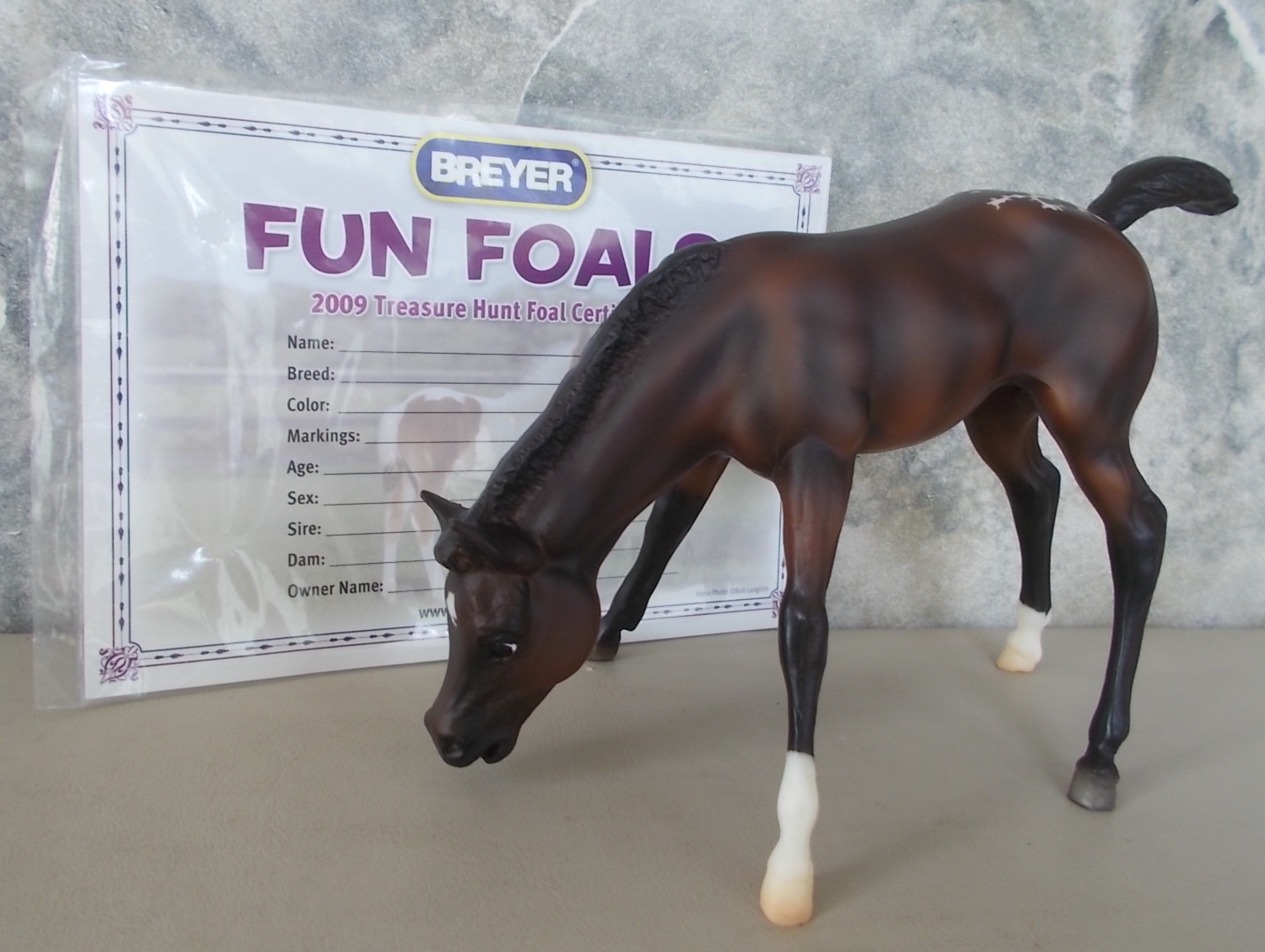 This Fun Foals Treasure Hunt consisted of two Mares and two Stallions, that when bred created a mystery foal. There was a Liver Chestnut (Non-Characteristic Appaloosa) Running Mare (#1372), a Strawberry Roan Wixom Mare (#1371), a Dapple Grey Mustang Stallion (#1373) and a Palomino Pinto Jumping Stallion (#1374).