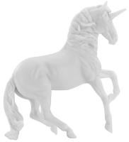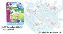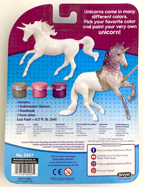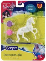 Unicorn Paint & Play #4217, 5457, 4227, 4279/W4279 released 2018-2026. "There are four different unicorn models - each ready to paint. These models come on a blister card, and are complete with three paint pots of iridescent colors (silver, pink, and purple), as well as a paintbrush." www.breyerhorses.com. The four models included the Alborozo Unicorn, Magnolia Unicorn, Warmblood Mare Unicorn, and the Walking TB Unicorn. These models were released under several different item numbers over the years. #W4279 was referred to as Unicorn Paint & Play - Style B on the Breyer website. The assortment number for these models was #4233.
