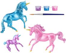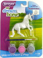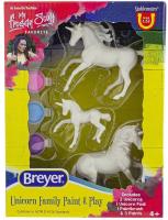 Unicorn Family Paint & Play #4262/W4262 released 2021-2024. "Unicorns come in many different colors, and this exciting activity set lets you decide what those colors can be. The complete set comes with everything you need to create a beautiful unicorn family, and includes 2 unpainted Stablemates unicorns and 1 Stablemates unicorn foal, 3 paint pots, and 1 paintbrush." www.breyerhorses.com. On the 2024 Retired List.