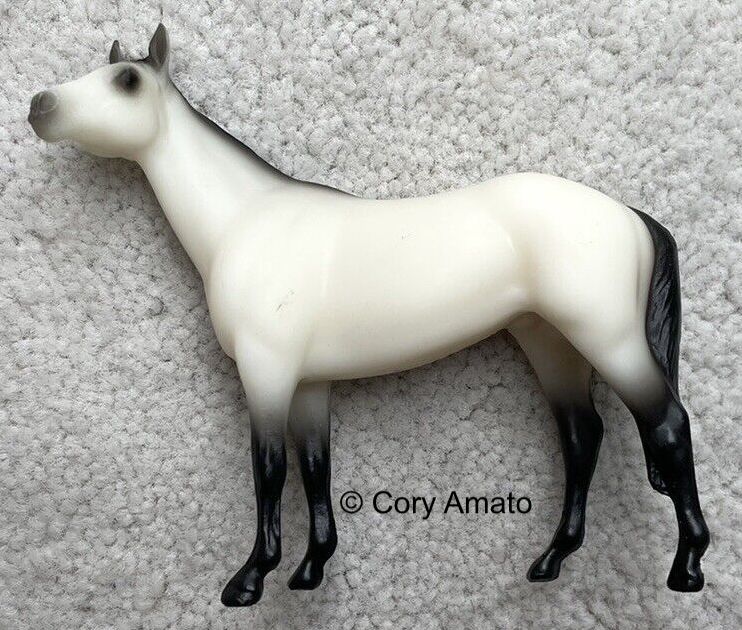 White with black points. Released through Sears in 1990 as the Stablemate Assortment II #495601. This set included a black Arabian Mare, buckskin Arabian Stallion, dusty chestnut Citation, black Draft Horse, chestnut Morgan Mare, dark red chestnut Morgan Stallion, white Native Dancer, palomino Seabiscuit, buckskin Silky Sullivan, rose grey Swaps, steel grey Swaps, and a red bay Thoroughbred Mare. These models were made from the heavier Cellulose Acetate plastic.