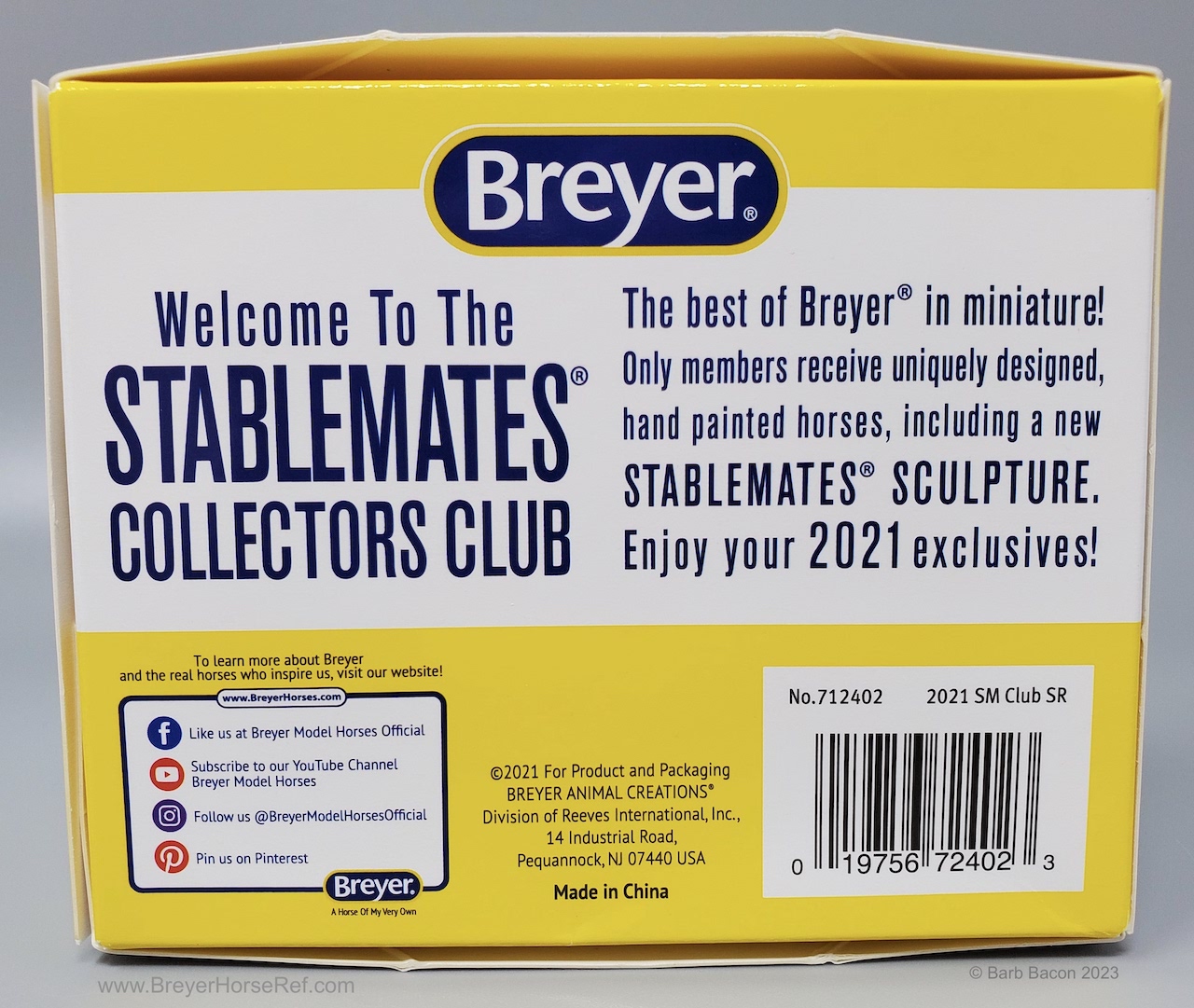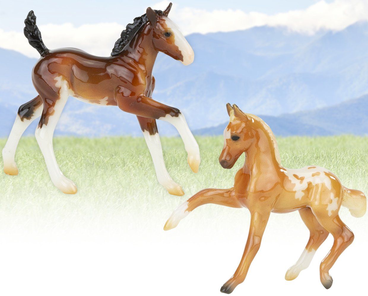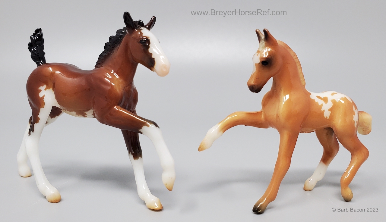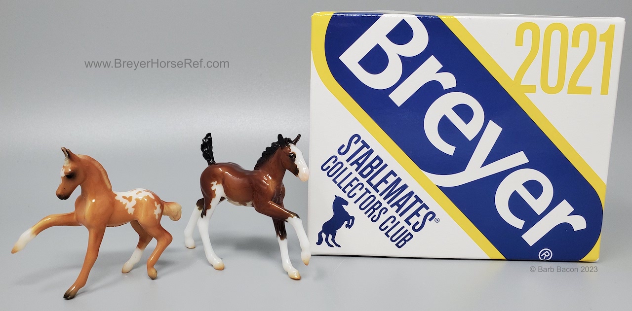 "Two is better than one! A Stablemates Club first, we’re offering up a set of foals as the Club’s special run. Perfect for pairing with previous Club releases, Leti and Addie are as detailed as they are adorable. Leti is a glossy bay pinto, and Addie is a glossy palomino Appaloosa. This playful pair comes in a mini hatbox." www.breyerhorses.com. These models were made from the heavier Cellulose Acetate plastic.