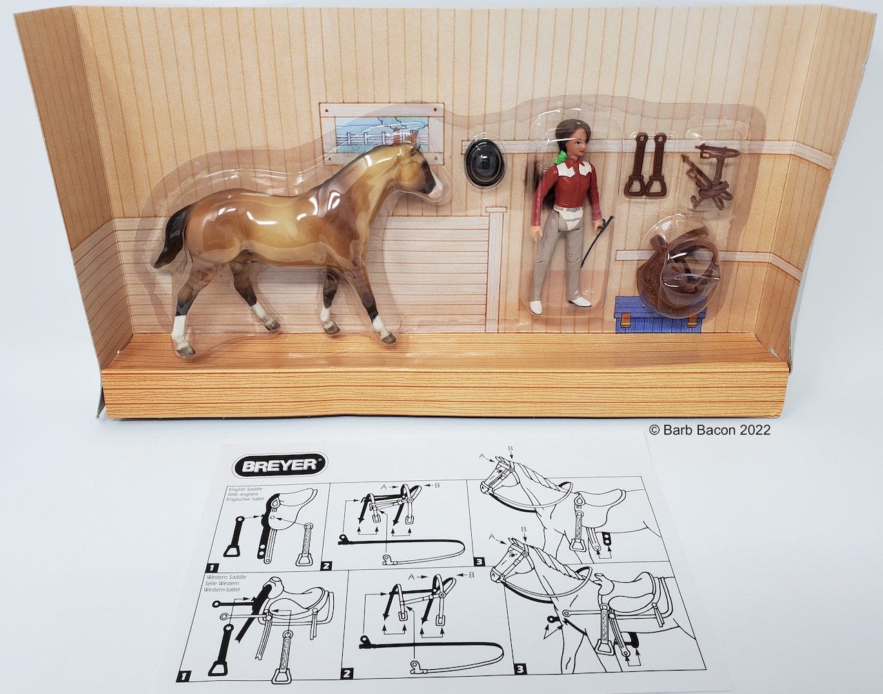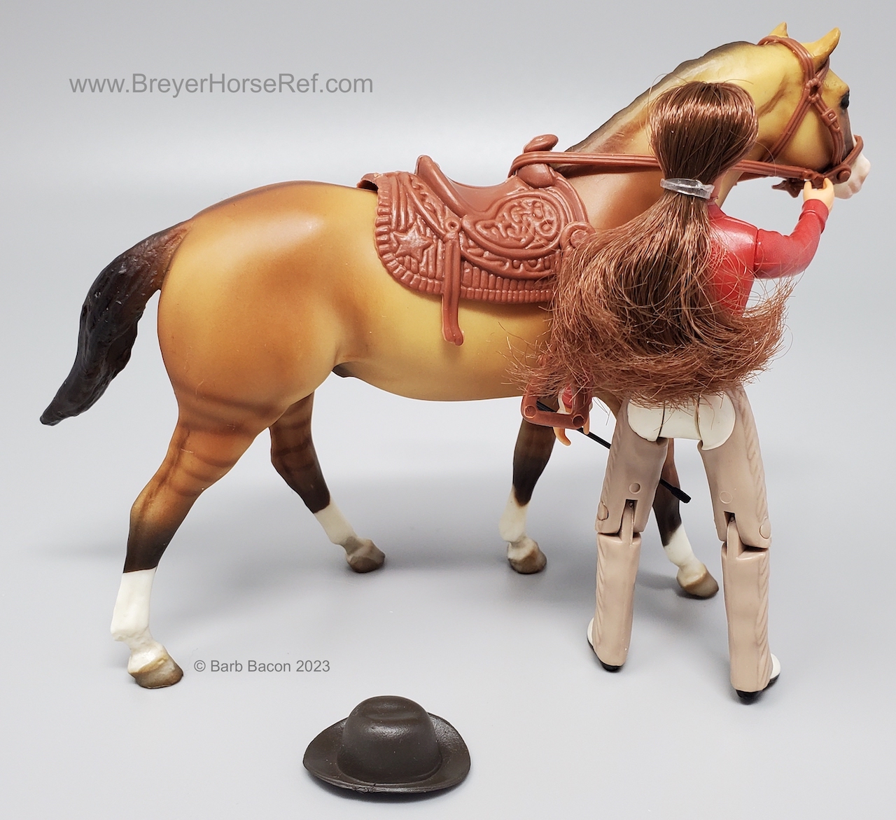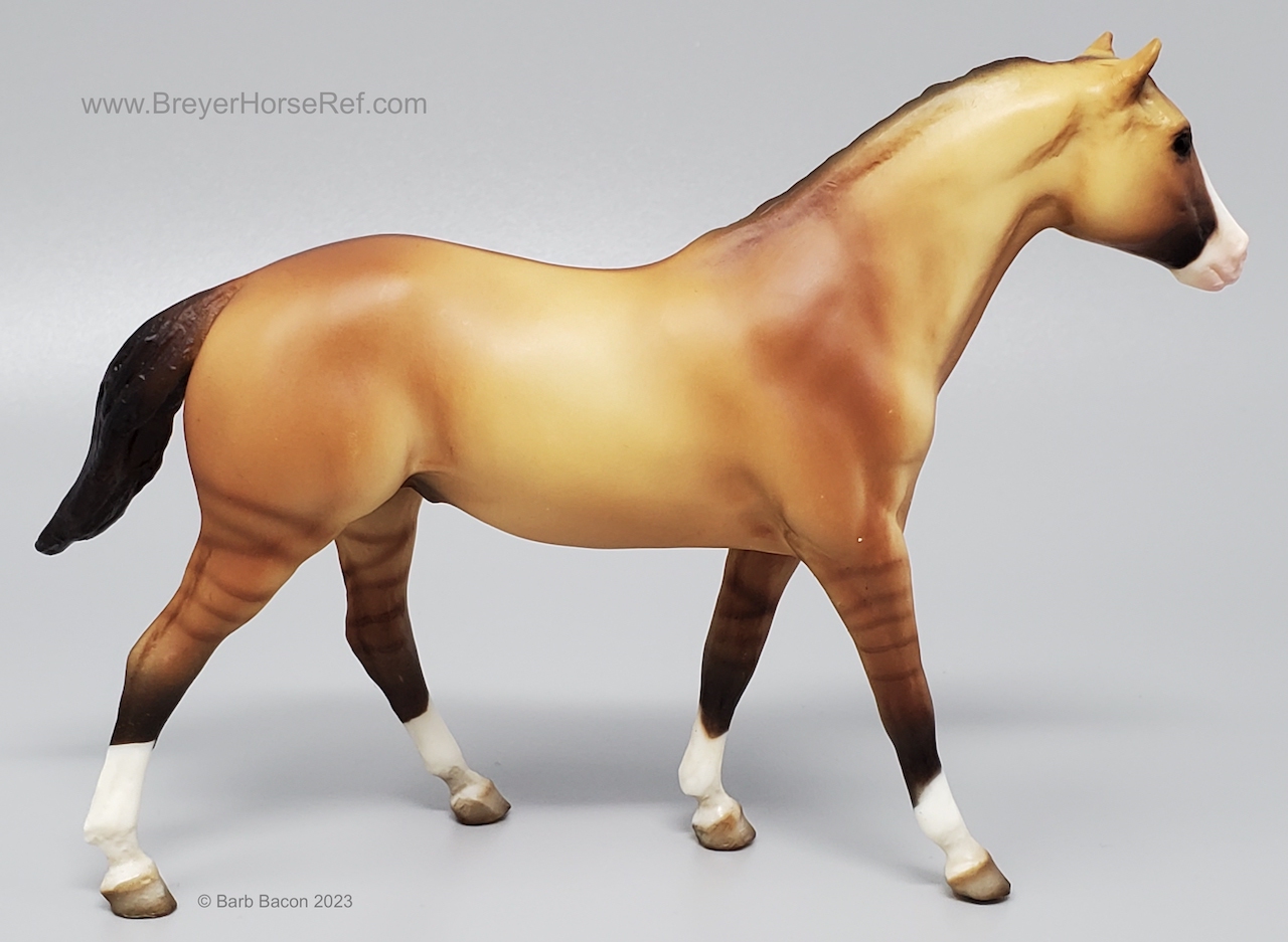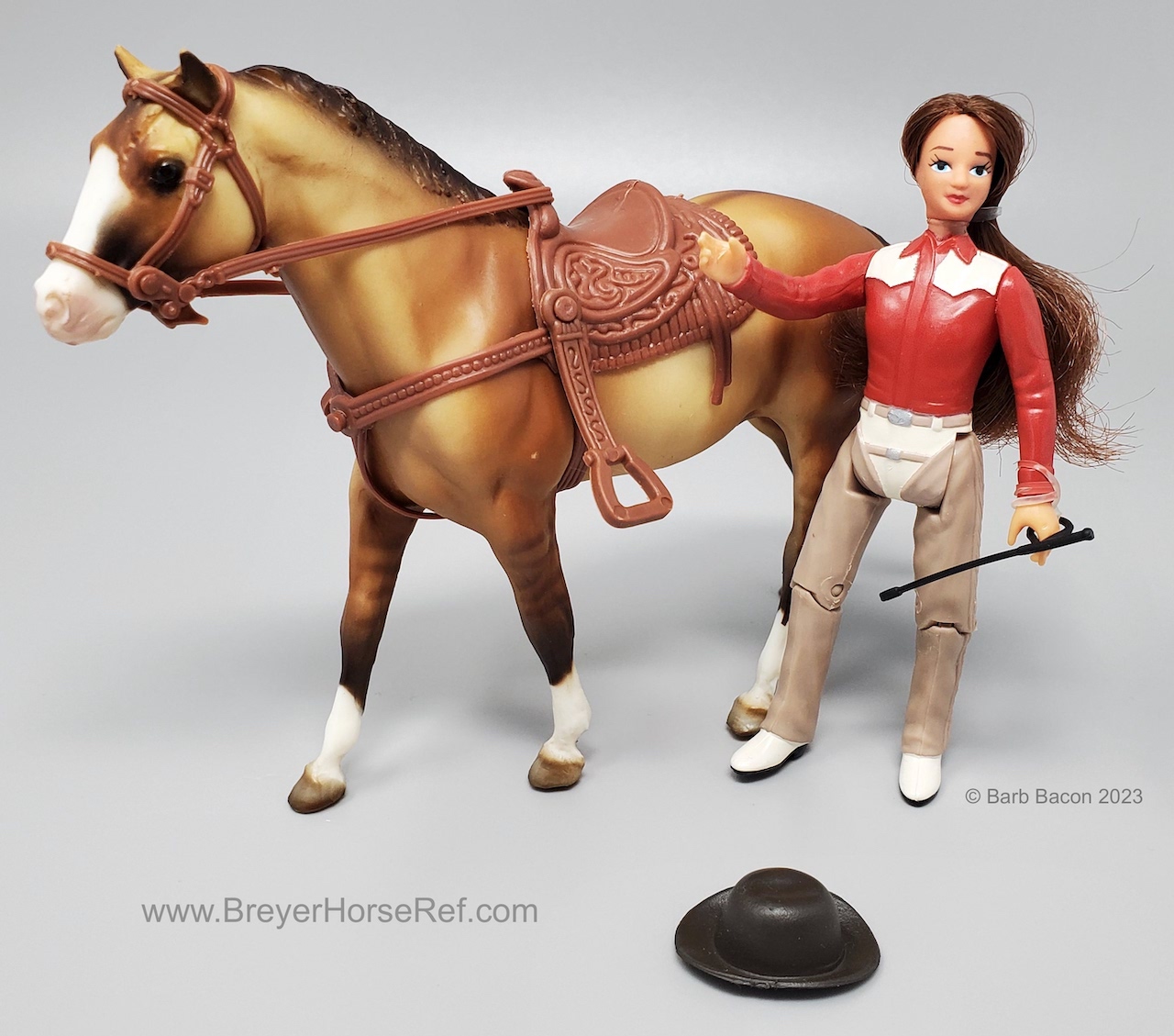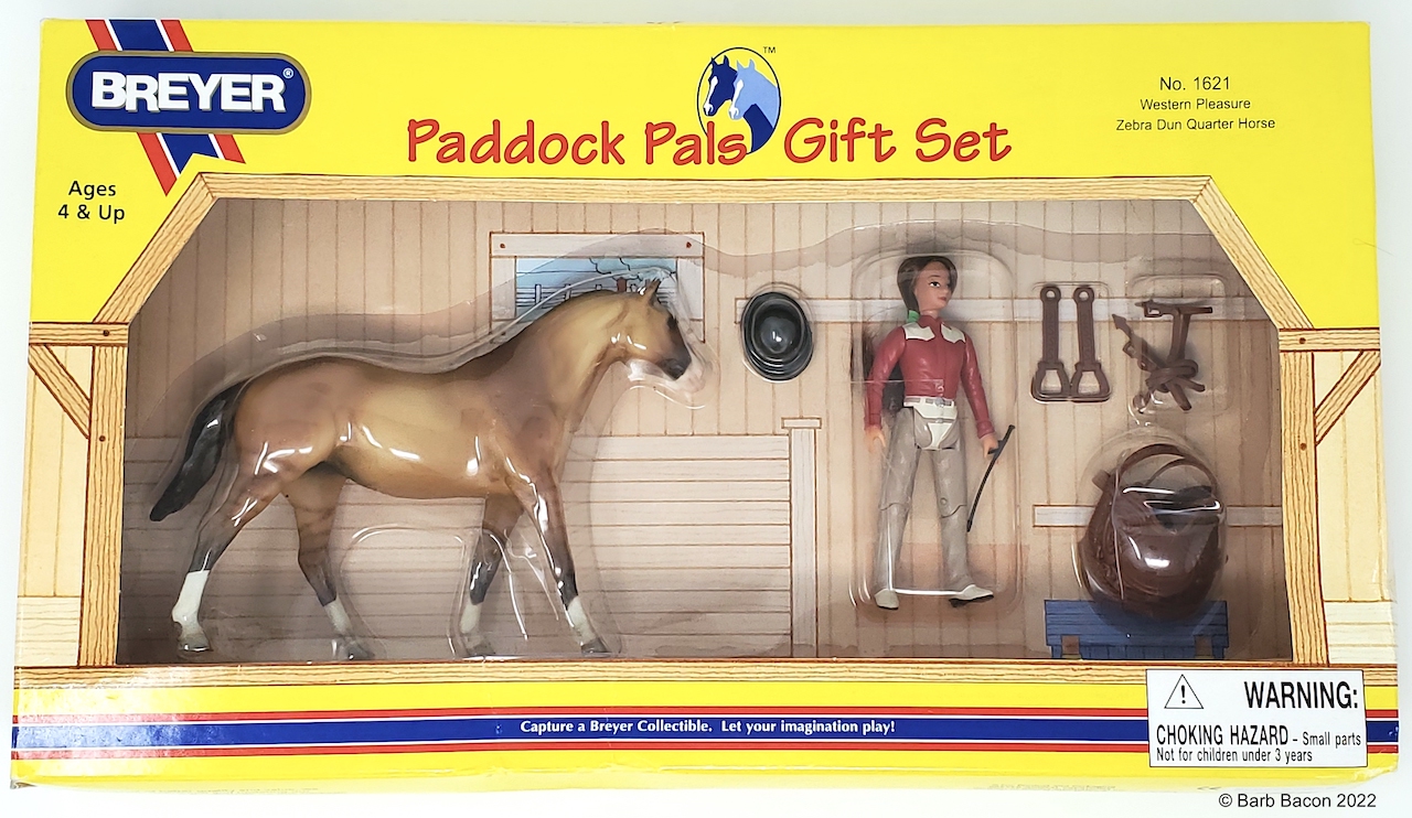 The Western Pleasure Horse & Rider Set #1621 was available 2001-2004. Set included doll with plastic Western tack, and a crop. Zebra Dun color. On the 2004 Retired List.