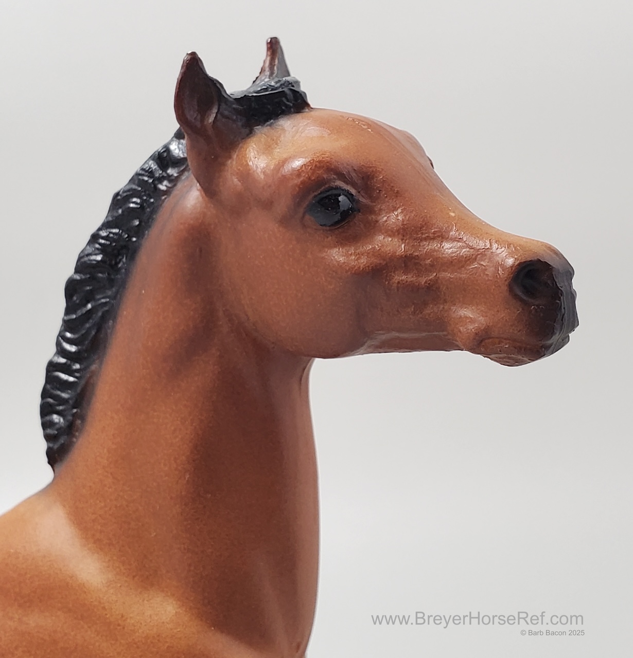 Dark bay with black points, dark grey hooves, solid face, and no white markings. Available through Sears with a matching Black Beauty, Running Mare and Running Foal. This model is very similar to #903 Little Bub, Young Justin Morgan, as they are both bay with black points and no white. The differences are kind of subtle - this model is more brown (less red) and typically has dark grey shading on the hooves, and perhaps no dark shading on the muzzle.