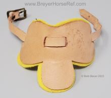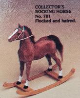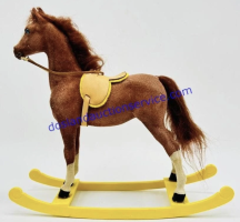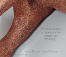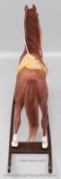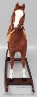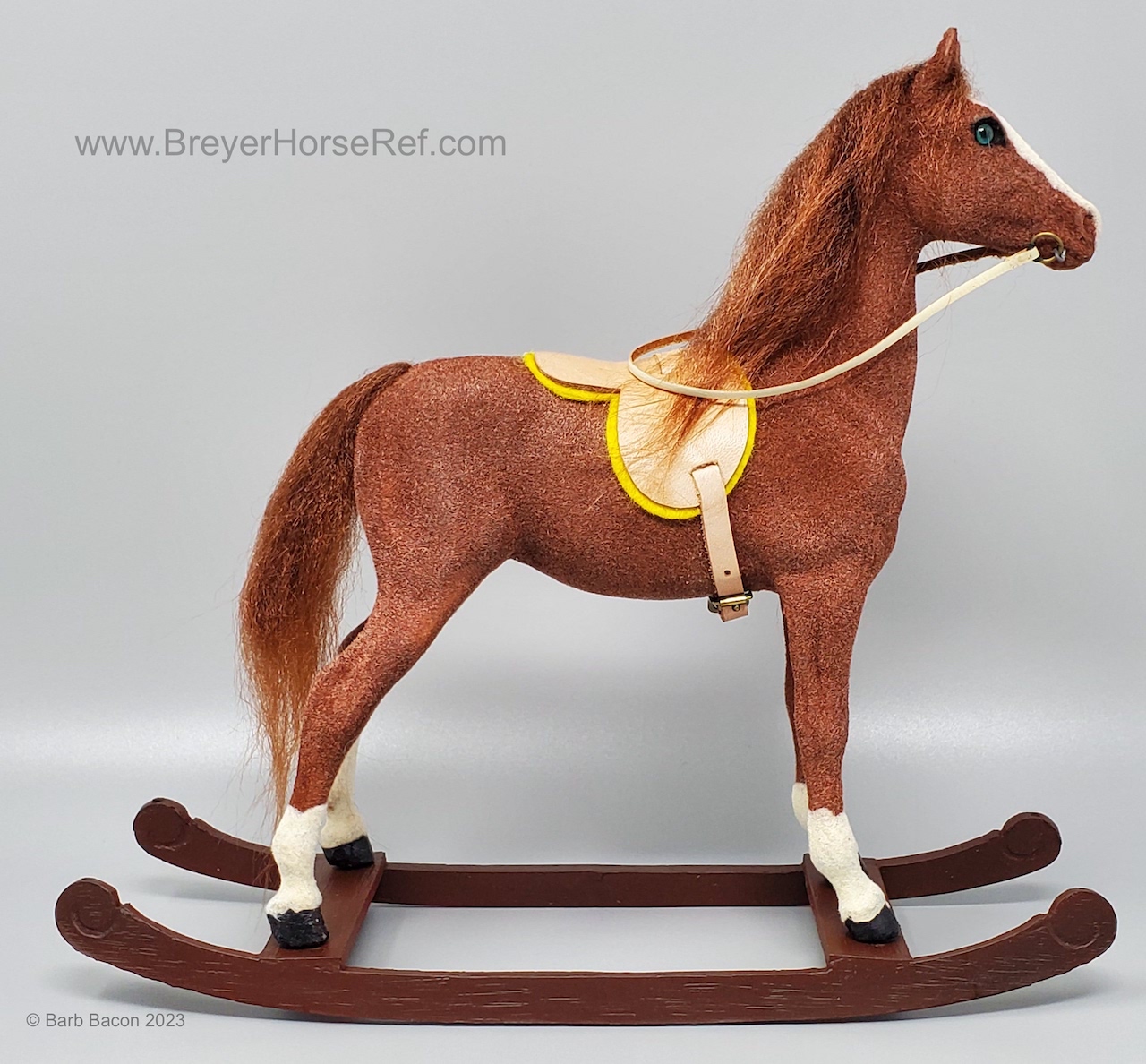 Chestnut flocking with chestnut faux hair mane and tail, 4 stockings with black painted hooves, blaze and blue or brown glass eyes. Model came with tan leather reins and saddle, yellow saddle pad, and a yellow or dark brown molded rocker. Flocked by Riegseckers.