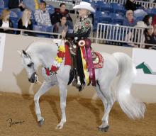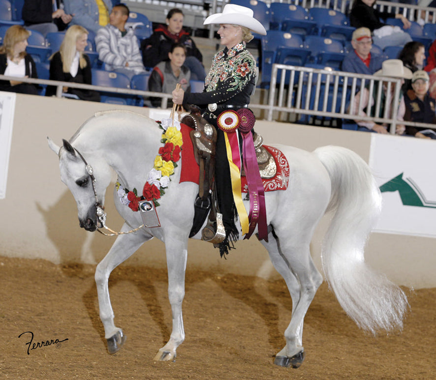 "At age three, a stunning Arabian named Sshameless++ was named the 1995 Reserve National Champion Futurity Colt. Fifteen years later, and at an age that most horses are considered to be “past their prime,” Sshameless++ returned to Nationals with his new amateur owner Lisa Shover. Showing against much younger horses (from 3- to 12-years-old), Sshameless++ was named the 2010 Reserve National Champion in Adult Amateur Owner to Handle (AAOTH) Arabian Stallion Halter and Reserve National Champion in Select Western. This achievement made Sshameless++ and Lisa the only team to ever win National titles in the performance and halter divisions at the same U.S. National Arabian Horse Show, and Sshameless++ the oldest Arabian to ever win National titles in performance and halter divisions! At the 2011 National Championships, Sshameless++ again was named the Reserve National Champion in AAOTH Stallion Halter. In addition to his show ring accomplishments, Sshameless++ also proved himself to be an outstanding sire. After earning his first National title in 1995, his first foal crop went on to dominate the National Show circuit, winning nine National Championships, three Reserve National titles and 16 Top 10s. Today, his offspring continue to win National and Regional Championships throughout the U.S., Canada and abroad.