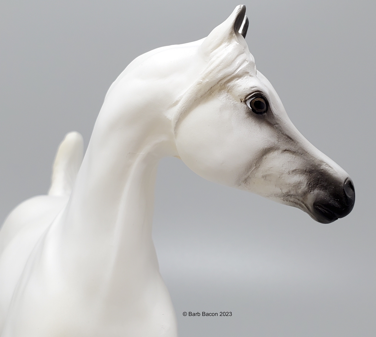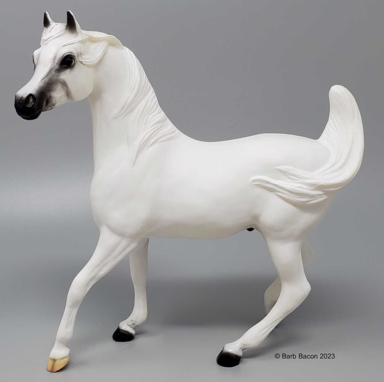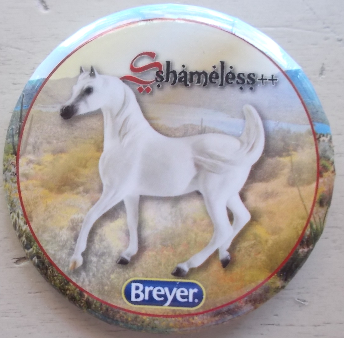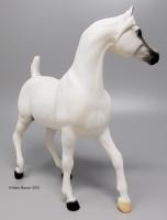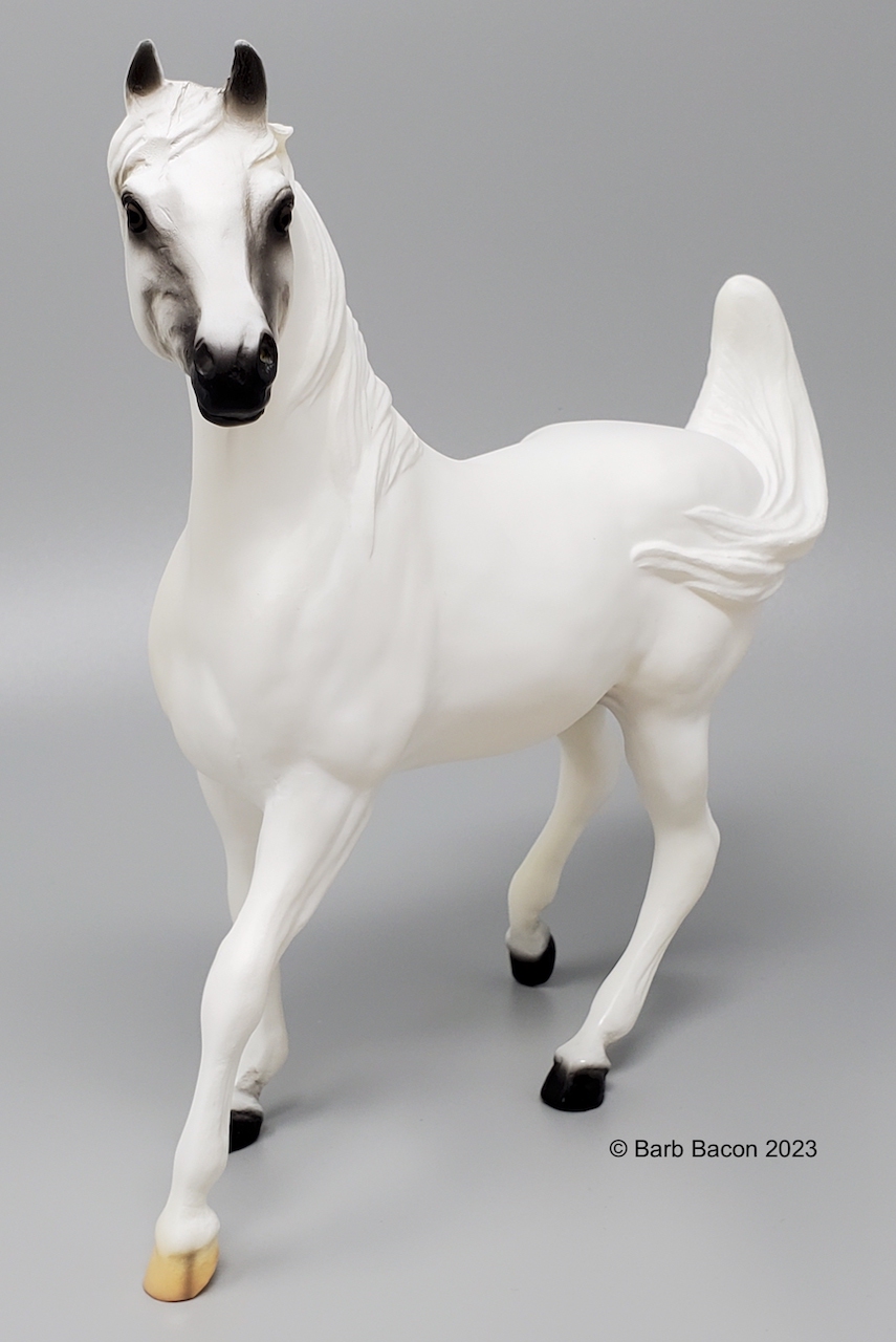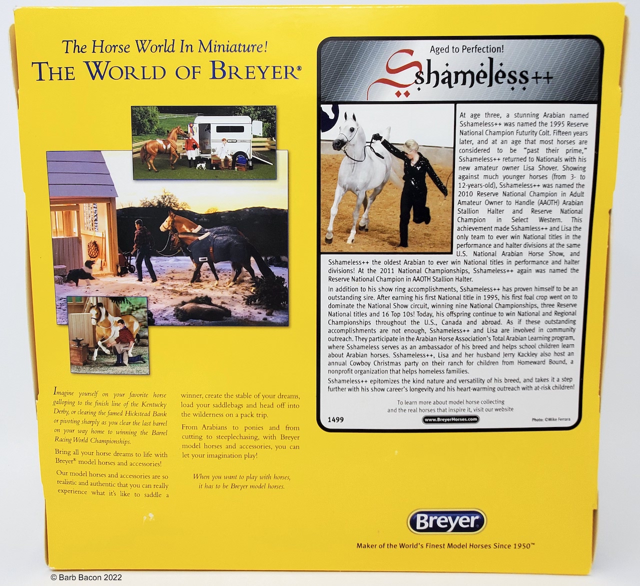 As if these outstanding accomplishments were not enough, Sshameless++ and Lisa were also invested in community outreach. They participated in the Arabian Horse Association’s Total Arabian Learning program, where Sshameless++ served as an ambassador of his breed and helped schoolchildren learn about Arabian horses. Sshameless++, Lisa and her husband Jerry Kackley also hosted an annual Cowboy Christmas party on their ranch for children from Homeward Bound, a nonprofit organization that helps homeless families. Sshameless++ epitomized the kind nature and versatility of his breed, and took things a step further with his show career’s longevity and his heartwarming outreach for at-risk children. Gone but not forgotten, Sshameless++ contunies to live on through his incredible offspring and Breyer portrait model." www.breyerhorses.com.