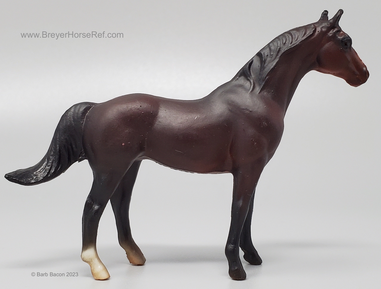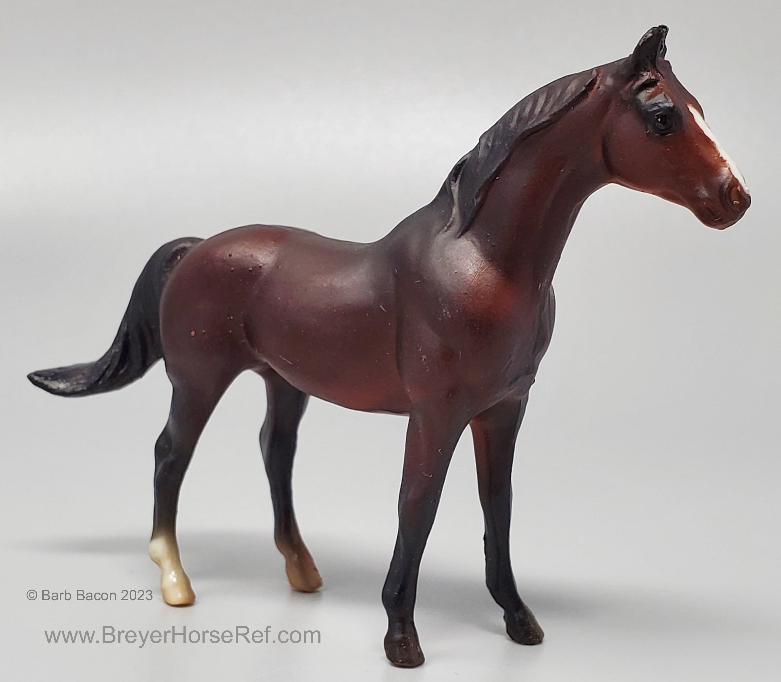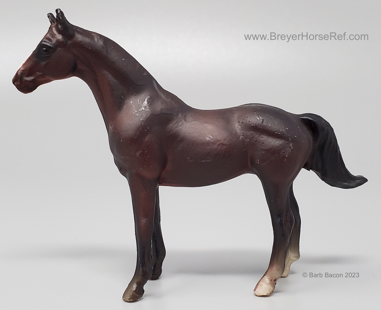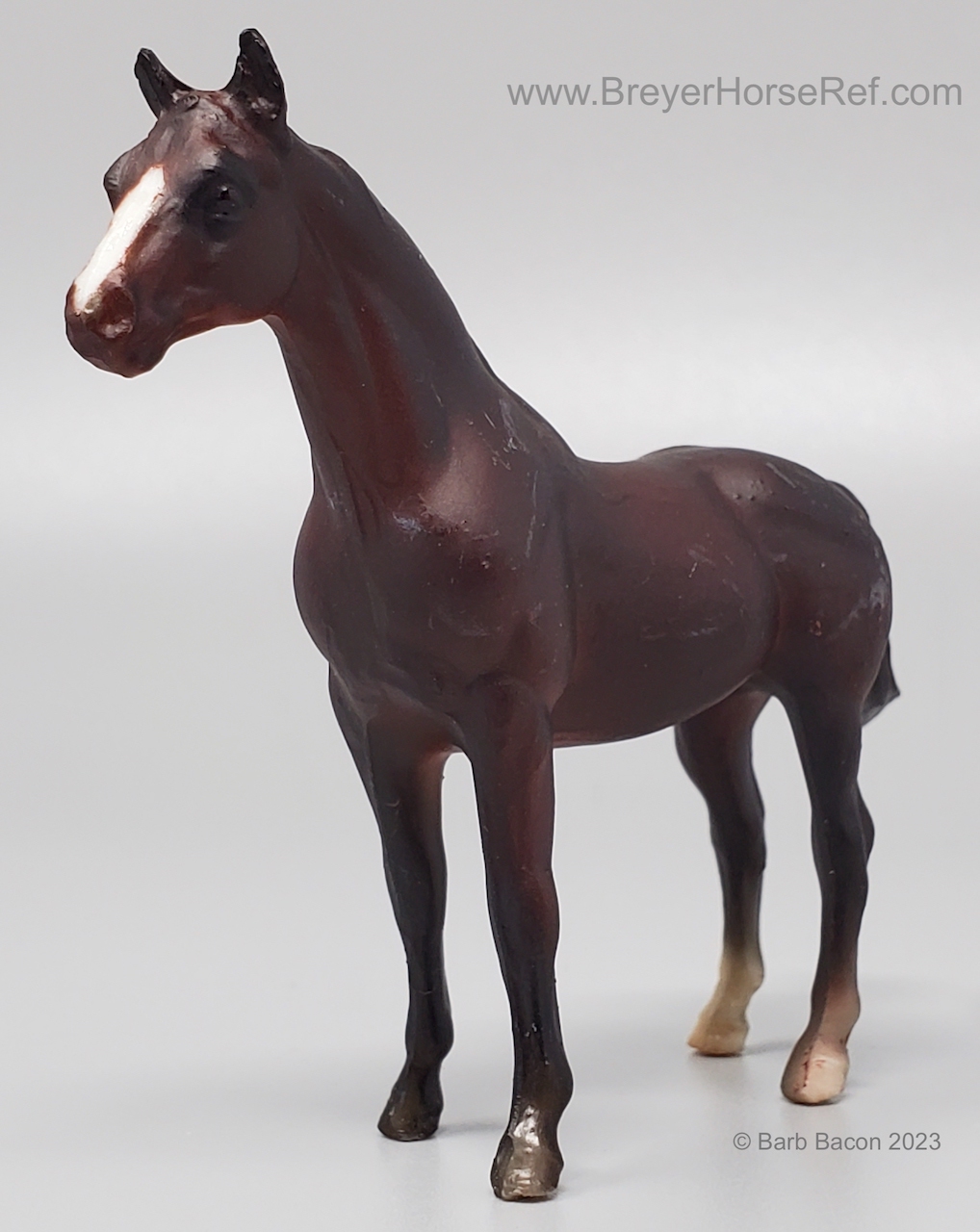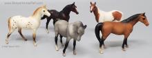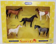 This was the second Saddle Club Collection #5650 (listed as 5650B in this database), produced 1995-1997, and included a dark grey Arabian Mare, sandy bay Citation, chestnut pinto Native Dancer, dark bay Silky Sullivan, and a chestnut leopard appaloosa Swaps. The first collection (see record #5650) was discontinued in 1995, and this set was released later that year. The first collection is the only set pictured in the catalogs from 1994-1997.