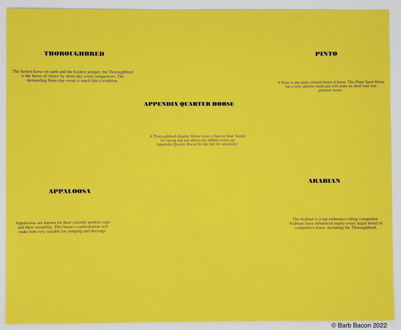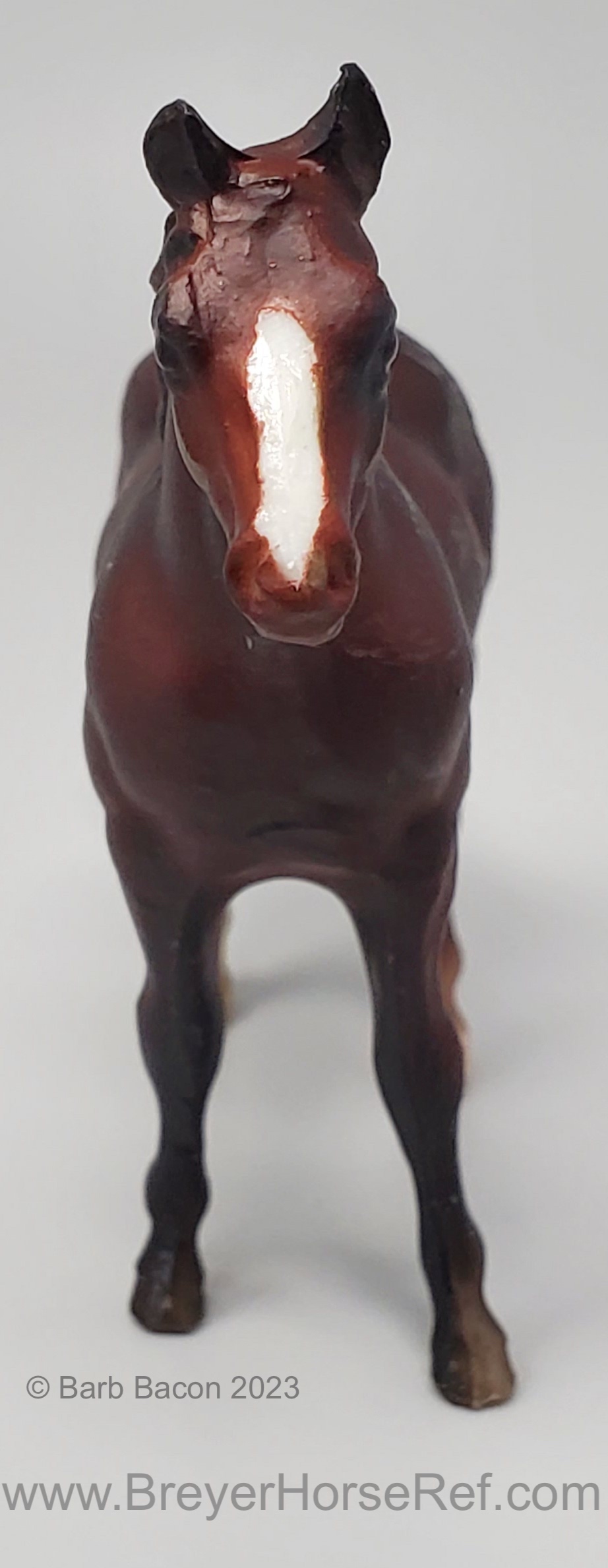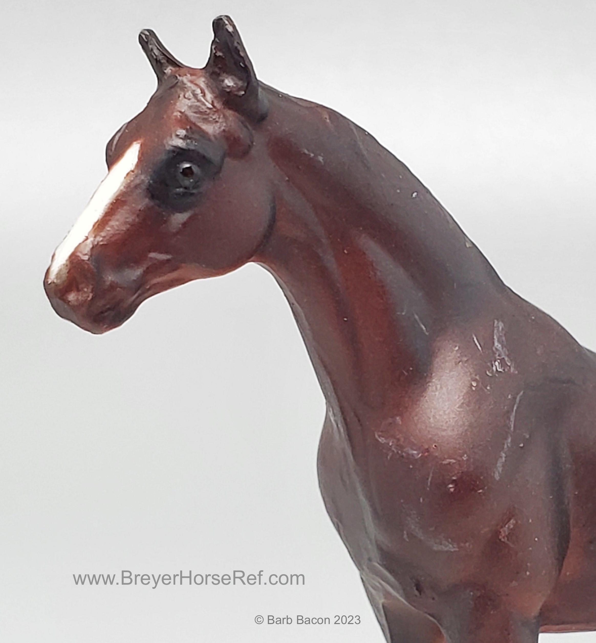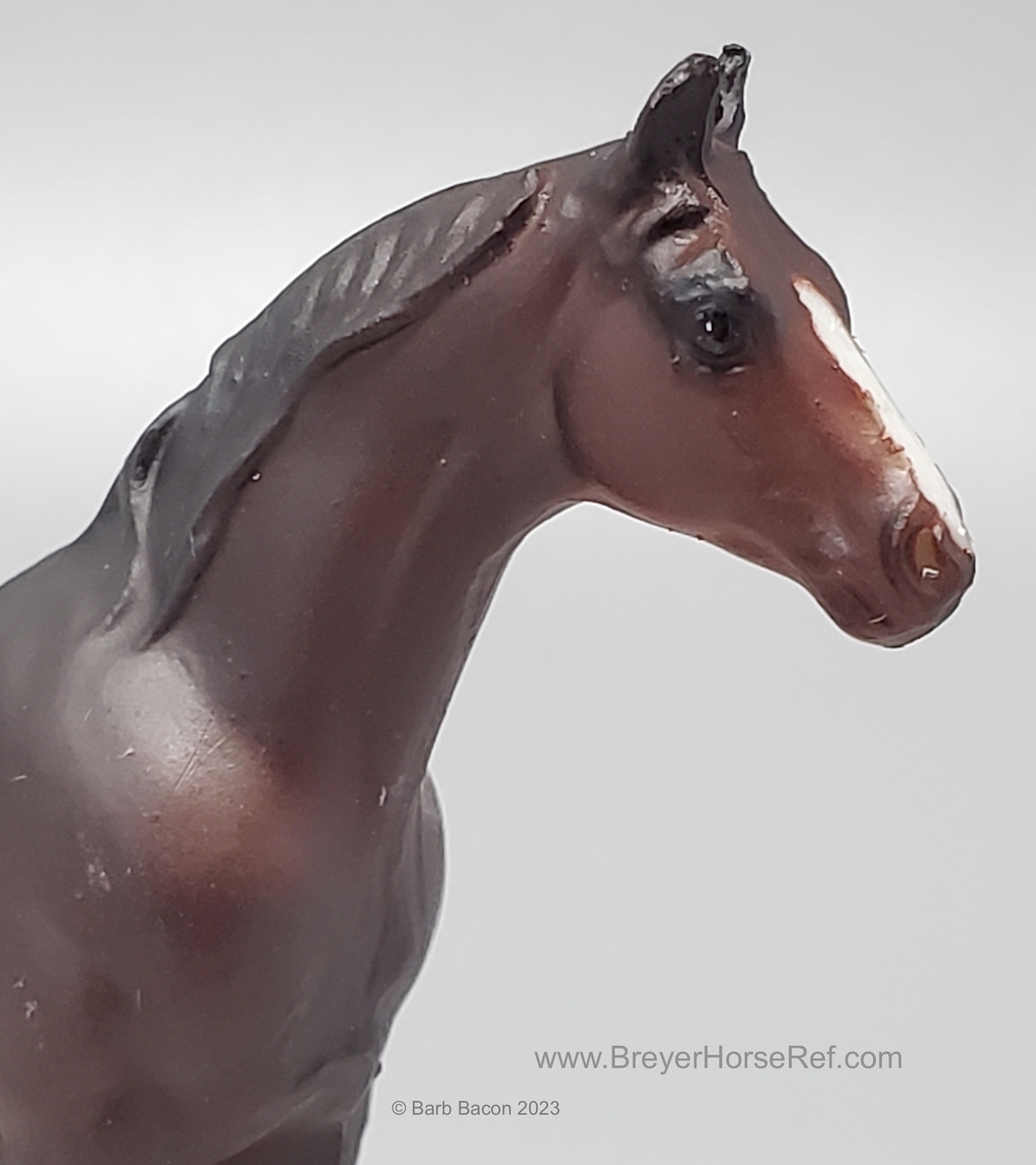 This was the second Saddle Club Collection #5650 (listed as 5650B in this database), produced 1995-1997, and included a dark grey Arabian Mare, sandy bay Citation, chestnut pinto Native Dancer, dark bay Silky Sullivan, and a chestnut leopard appaloosa Swaps. The first collection (see record #5650) was discontinued in 1995, and this set was released later that year. The first collection is the only set pictured in the catalogs from 1994-1997.