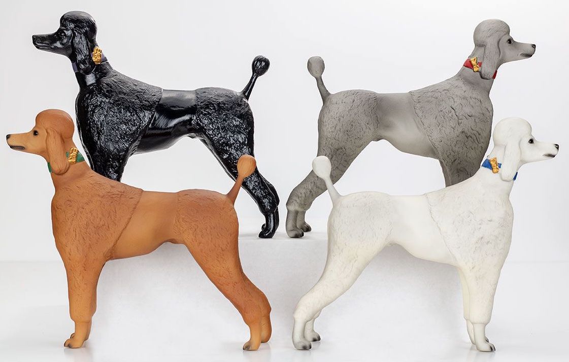 "First sculpted in the 1950s, as the Breyer Molding Company began shifting its focus toward animal models, the Small Poodle was ultimately shelved in favor of the larger Poodle mold. The mold's existence was only known because of a single salesman's sample painted blue-grey and white, which was acquired by a collector in 1996. After looking through old inventory lists, which listed molds for both a "large poodle" and "small poodle," the molding equipment was pulled out of storage and the mysterious dog was verified as a genuine Breyer model. At BreyerFest 1997, the Small Poodle would finally make its official debut. A surprise raffle was held on the Friday evening, and four sets of Small Poodles in glossy black, apricot, grey and white went home with lucky winners." www.breyerhorses.com.