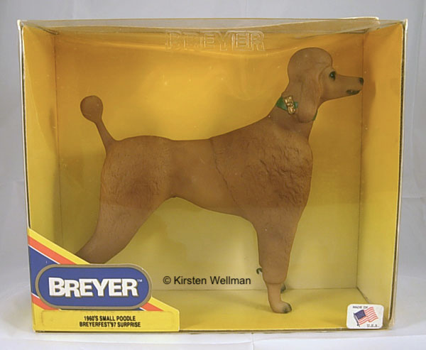 "First sculpted in the 1950s, as the Breyer Molding Company began shifting its focus toward animal models, the Small Poodle was ultimately shelved in favor of the larger Poodle mold. The mold's existence was only known because of a single salesman's sample painted blue-grey and white, which was acquired by a collector in 1996. After looking through old inventory lists, which listed molds for both a "large poodle" and "small poodle," the molding equipment was pulled out of storage and the mysterious dog was verified as a genuine Breyer model. At BreyerFest 1997, the Small Poodle would finally make its official debut. A surprise raffle was held on the Friday evening, and four sets of Small Poodles in glossy black, apricot, grey and white went home with lucky winners." www.breyerhorses.com.