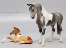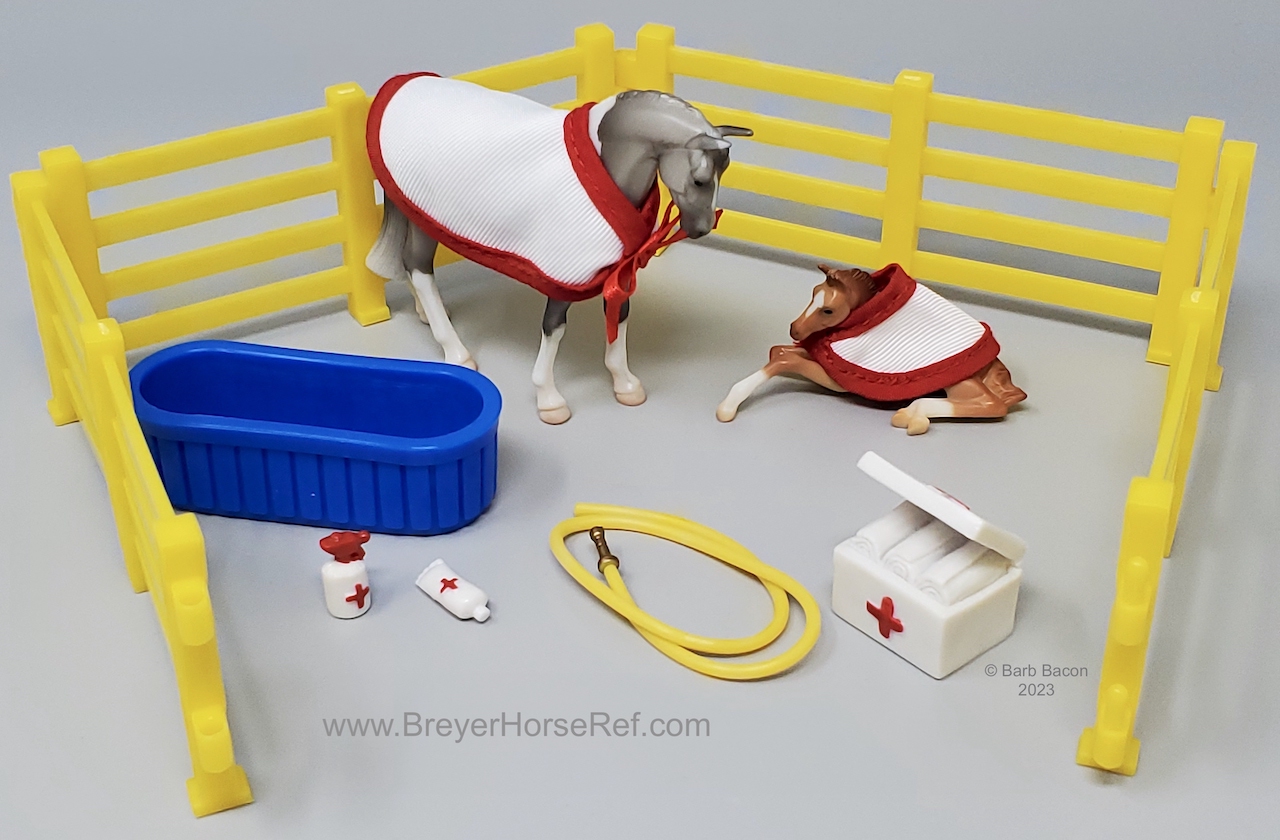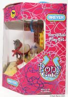 Set #720232 Pony Gals Horspital Play Set was only available through Target in 2009 and included a Grey Pinto Standing Thoroughbred and Chestnut Pinto Lying Foal, 2 Blankets, 4 Pieces of Fence, 1 First Aid Box, 1 First Aid Spray, 1 First Aid Tube, and 1 Water Trough.