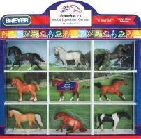 Set #9128 World Equestrian Games Stablemate Shadowbox included a bay Arabian, a dark grey Cantering Warmblood, a chestnut Drafter, a light grey Hanoverian, a black pinto Quarter Horse, a red roan Reining Horse, a flaxen chestnut Standing Thoroughbred, a palomino Trotting Warmblood, and a dark grey Warmblood Jumper. On the 2010 Retired List.