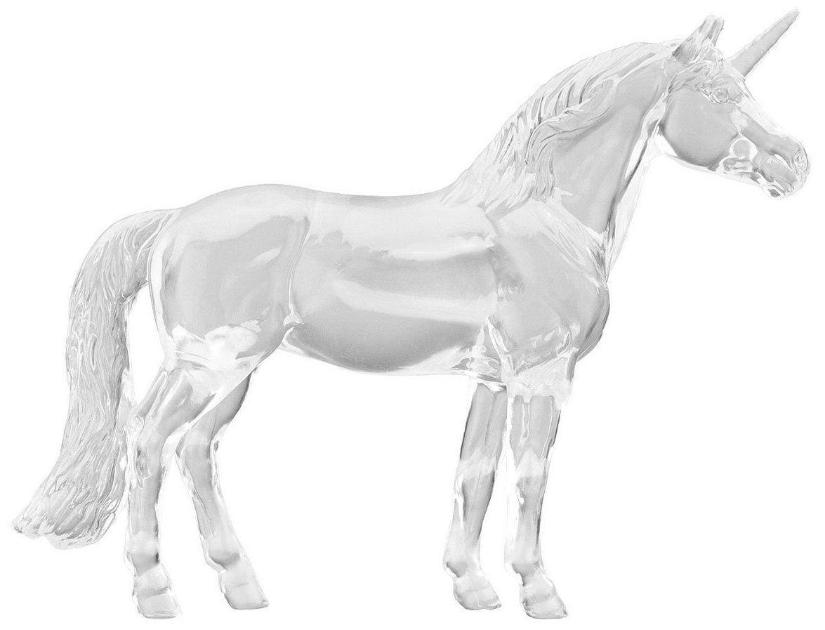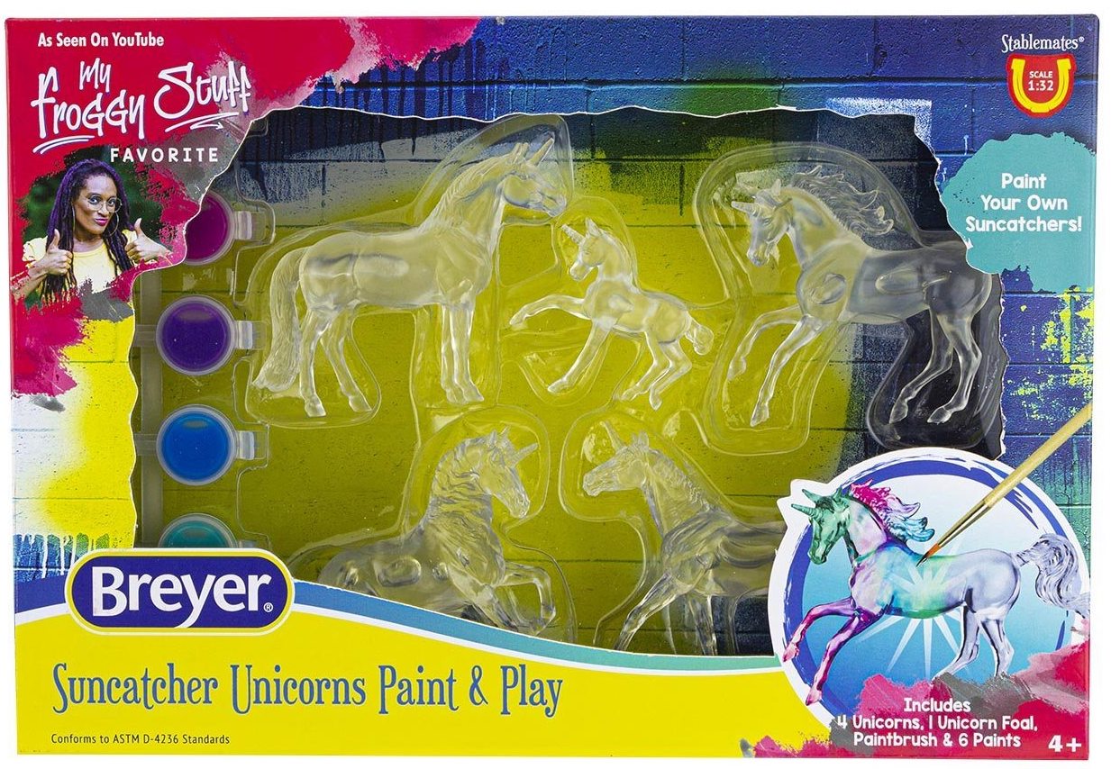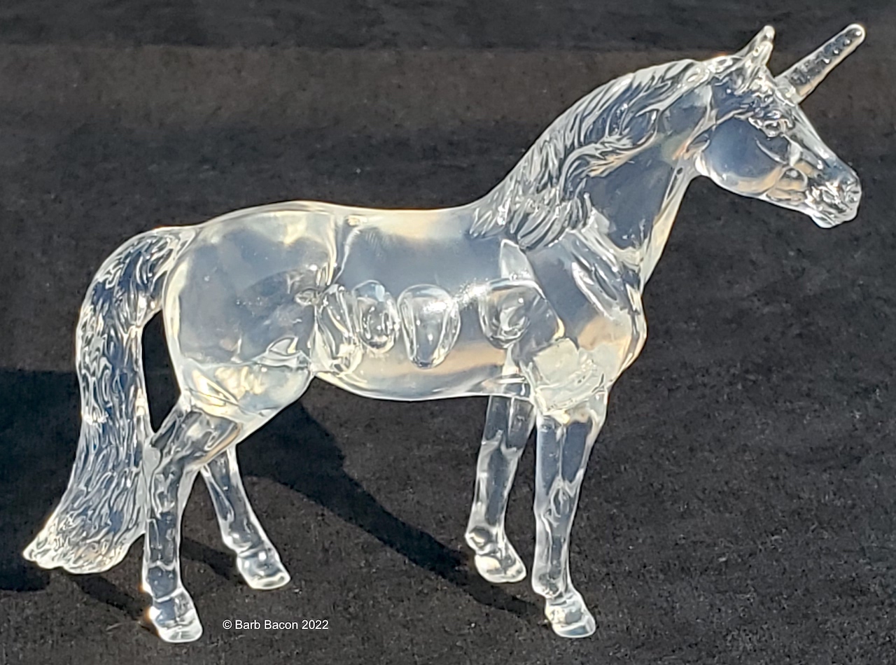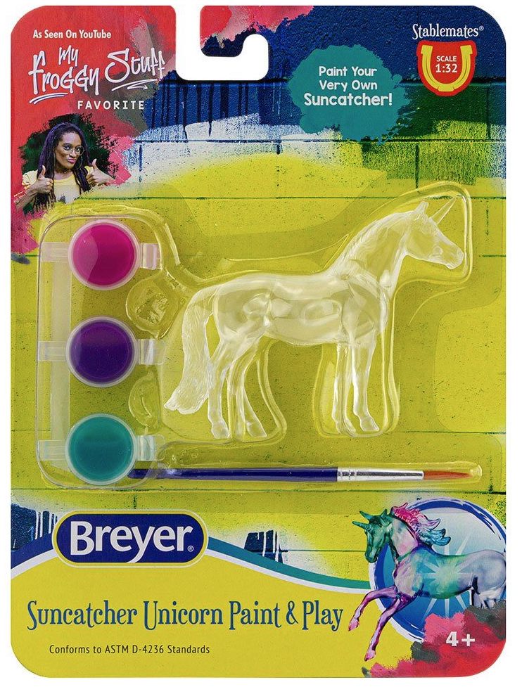 Released in the Suncatcher Unicorns Paint & Play Set #4220/W4238 from 2020-2026. "These Stablemate unicorns are clear, and when painted with the special included translucent paint, they become dazzling in the sunlight – just like a suncatcher! This set includes 5 clear Stablemates unicorns, 1 paintbrush, and 6 fantasy-colored paint pots." www.breyerhorses.com. Kit included Alborozo, Frisky Foal, Magnolia, Walking TB, and Warmblood Mare.