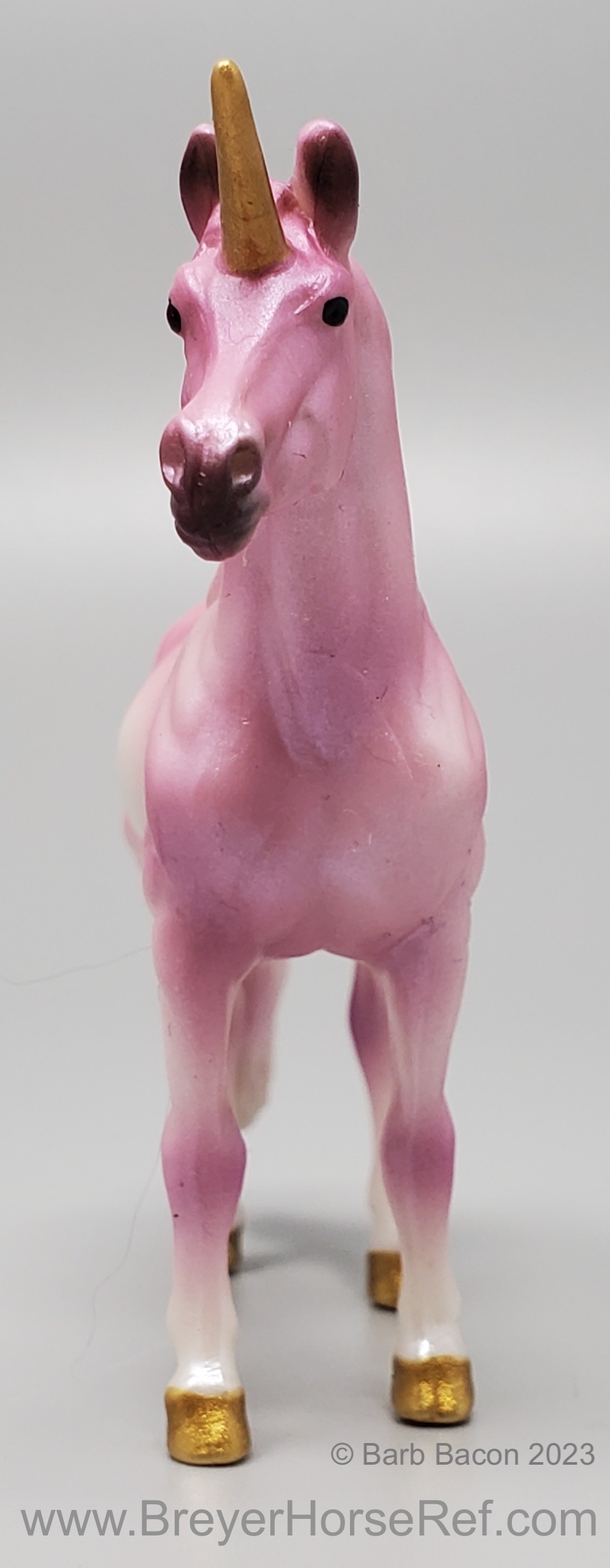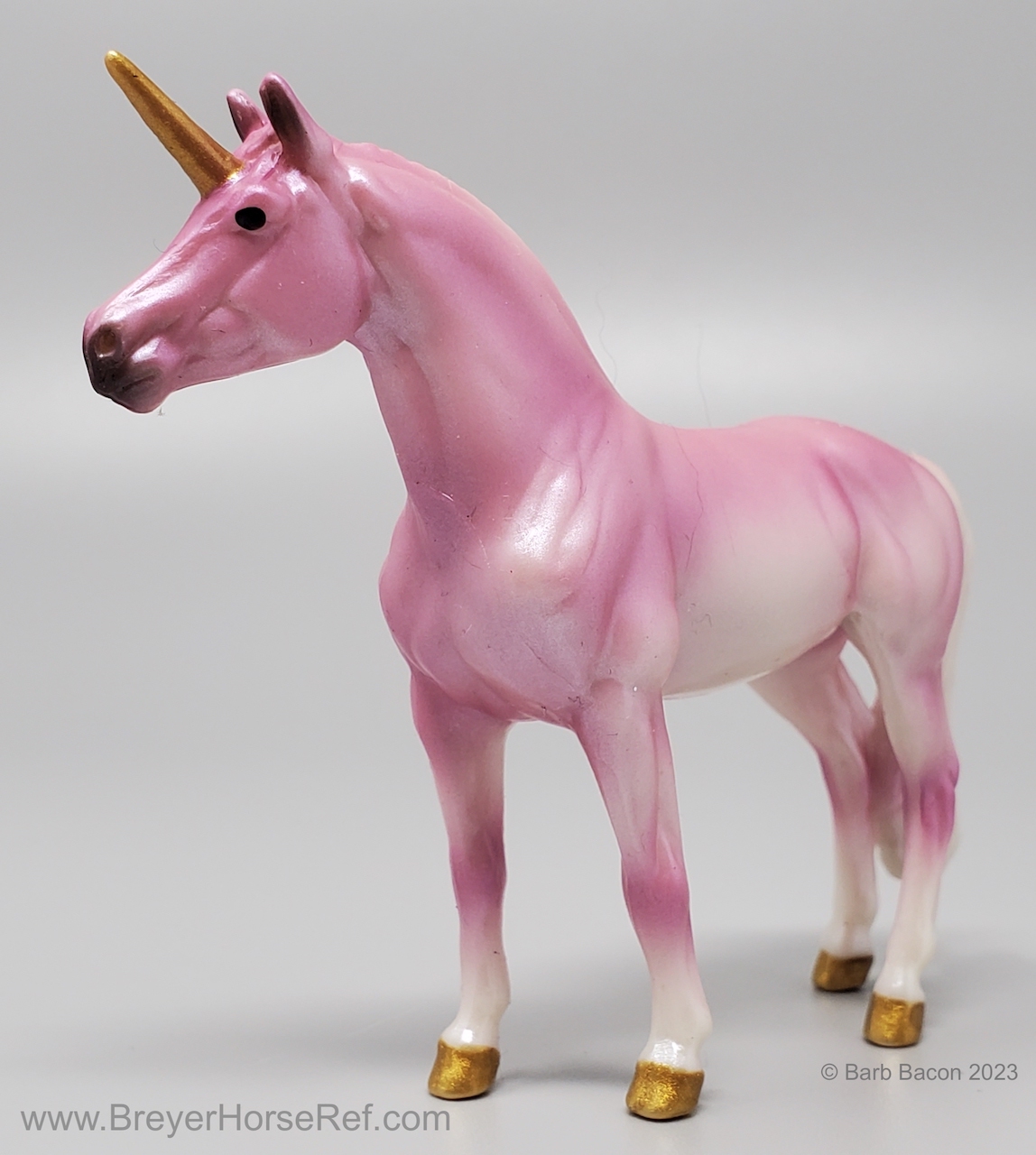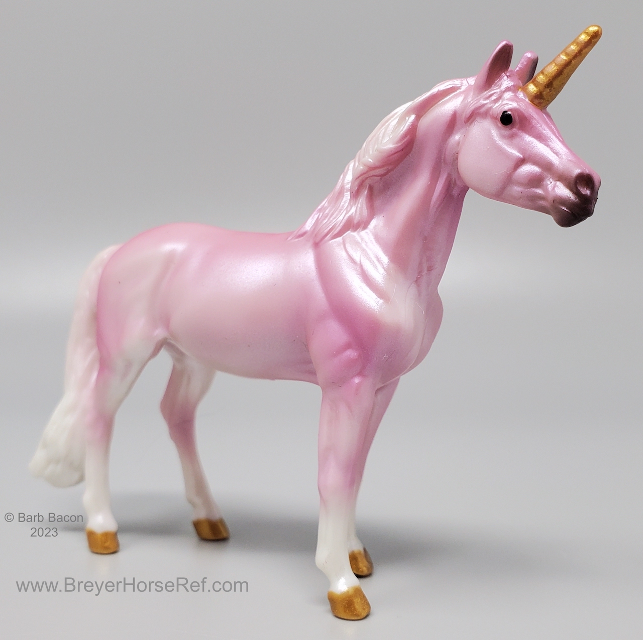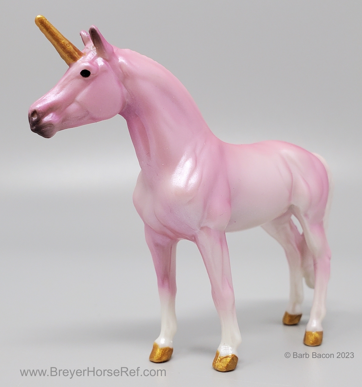 Also in 2023, this model was released in the Stablemates Unicorn Foal Surprise #5549 - Lilac Meadow Family. This set included a purple Fireheart, a pink Warmblood Mare and a purple Standing Foal.
