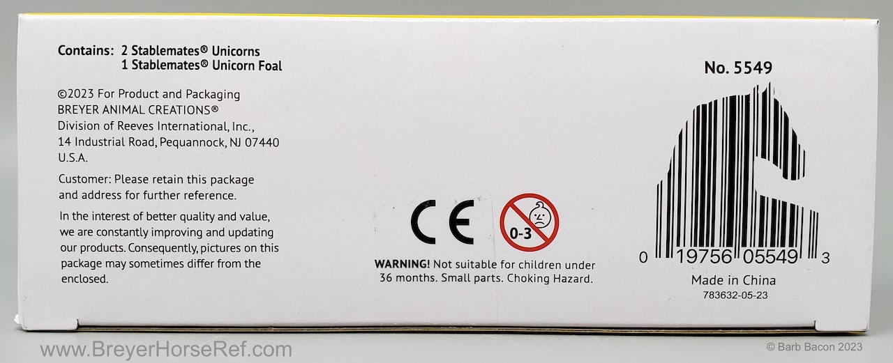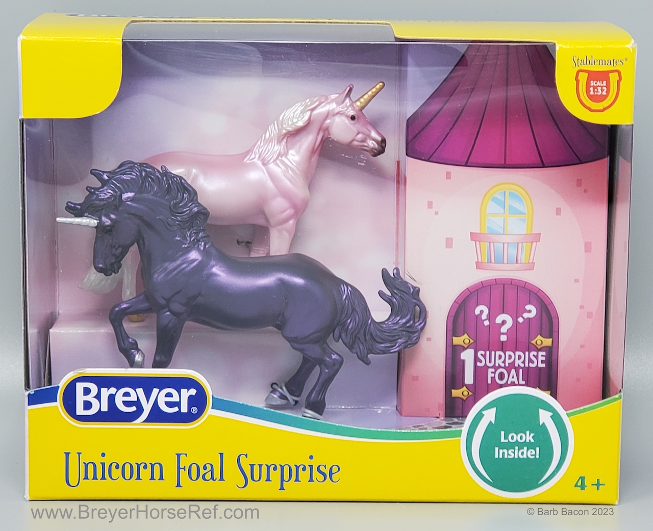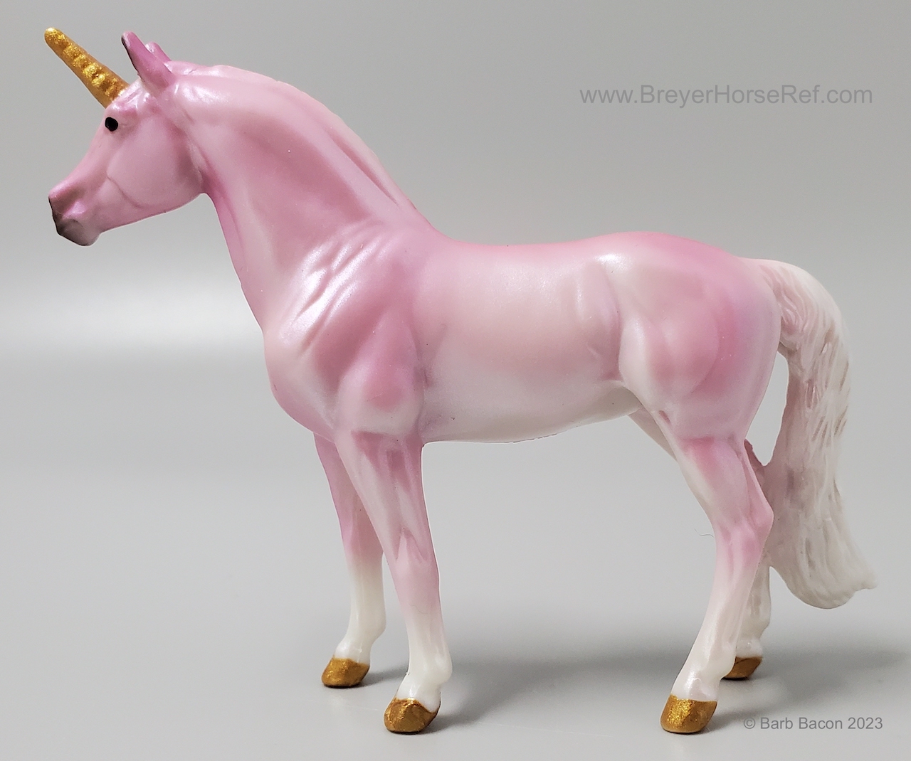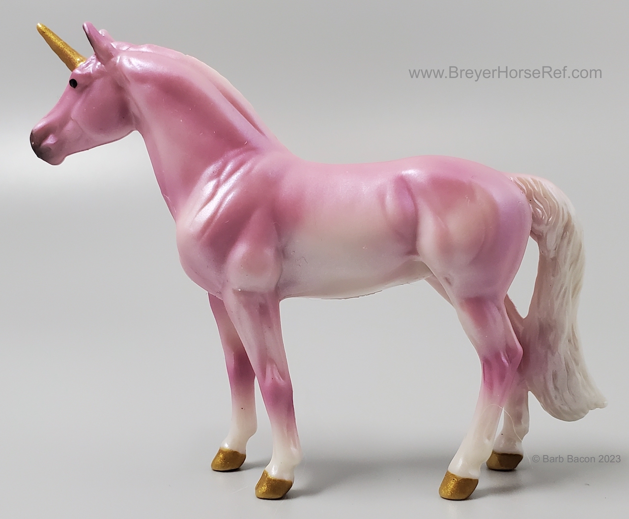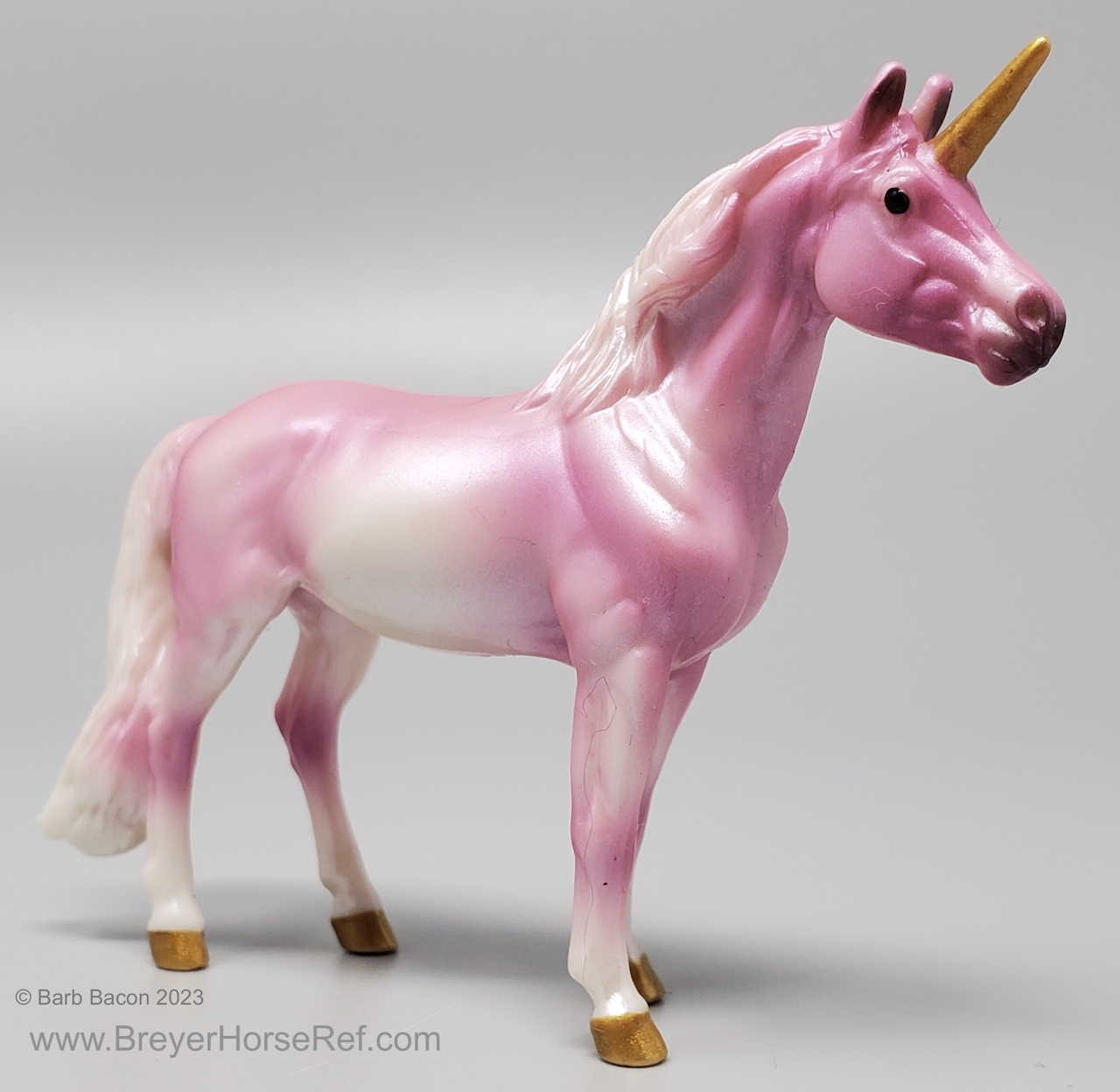 Also in 2023, this model was released in the Stablemates Unicorn Foal Surprise #5549 - Lilac Meadow Family. This set included a purple Fireheart, a pink Warmblood Mare and a purple Standing Foal.