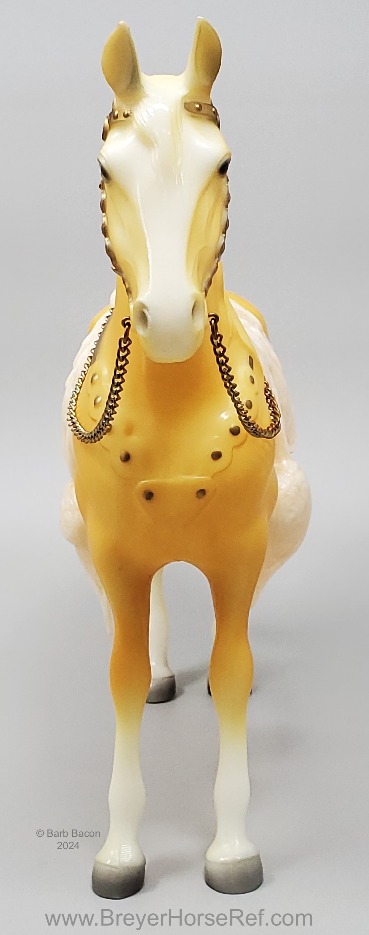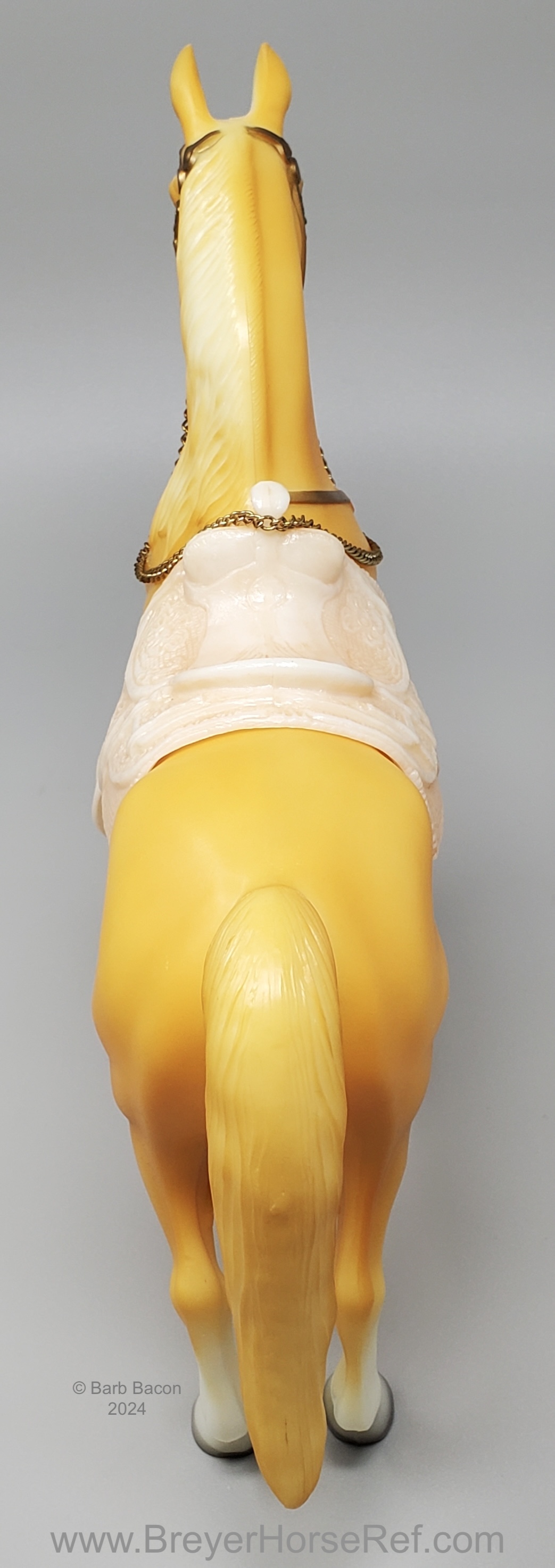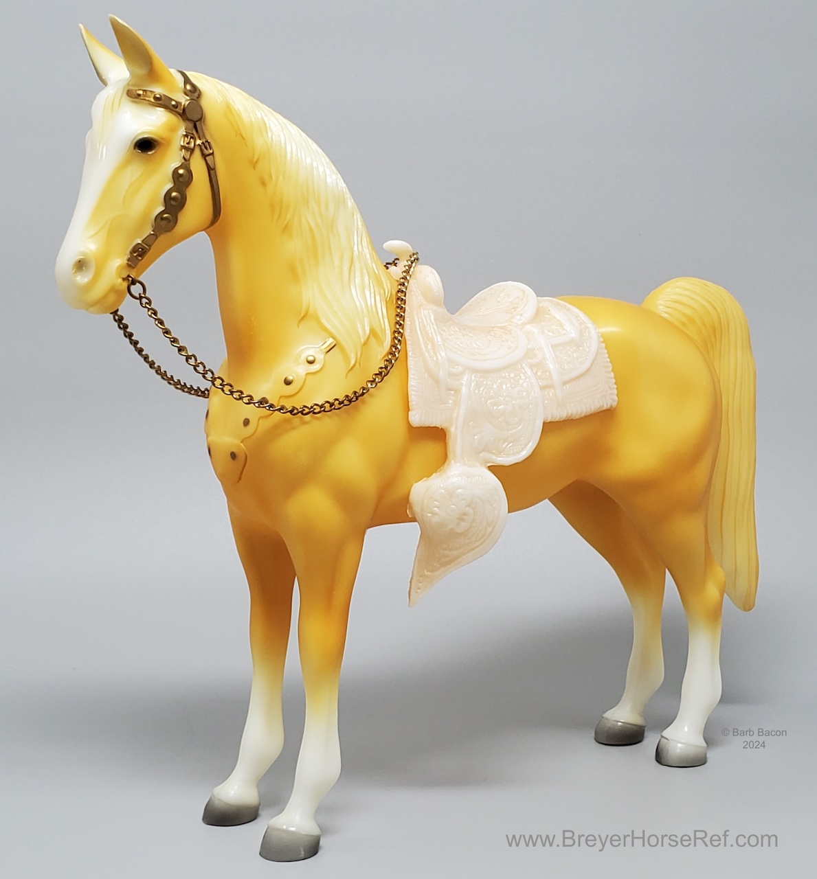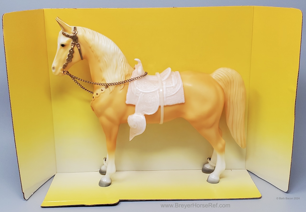 Palomino with bald face and four stockings with white or palomino shaded mane and tail. This model is identical to later releases of #57 but updated with a ’95 stamp on the inner back right leg. Some models were released without the '95 stamp and are indistinguishable from the regular run.