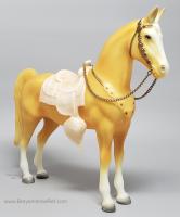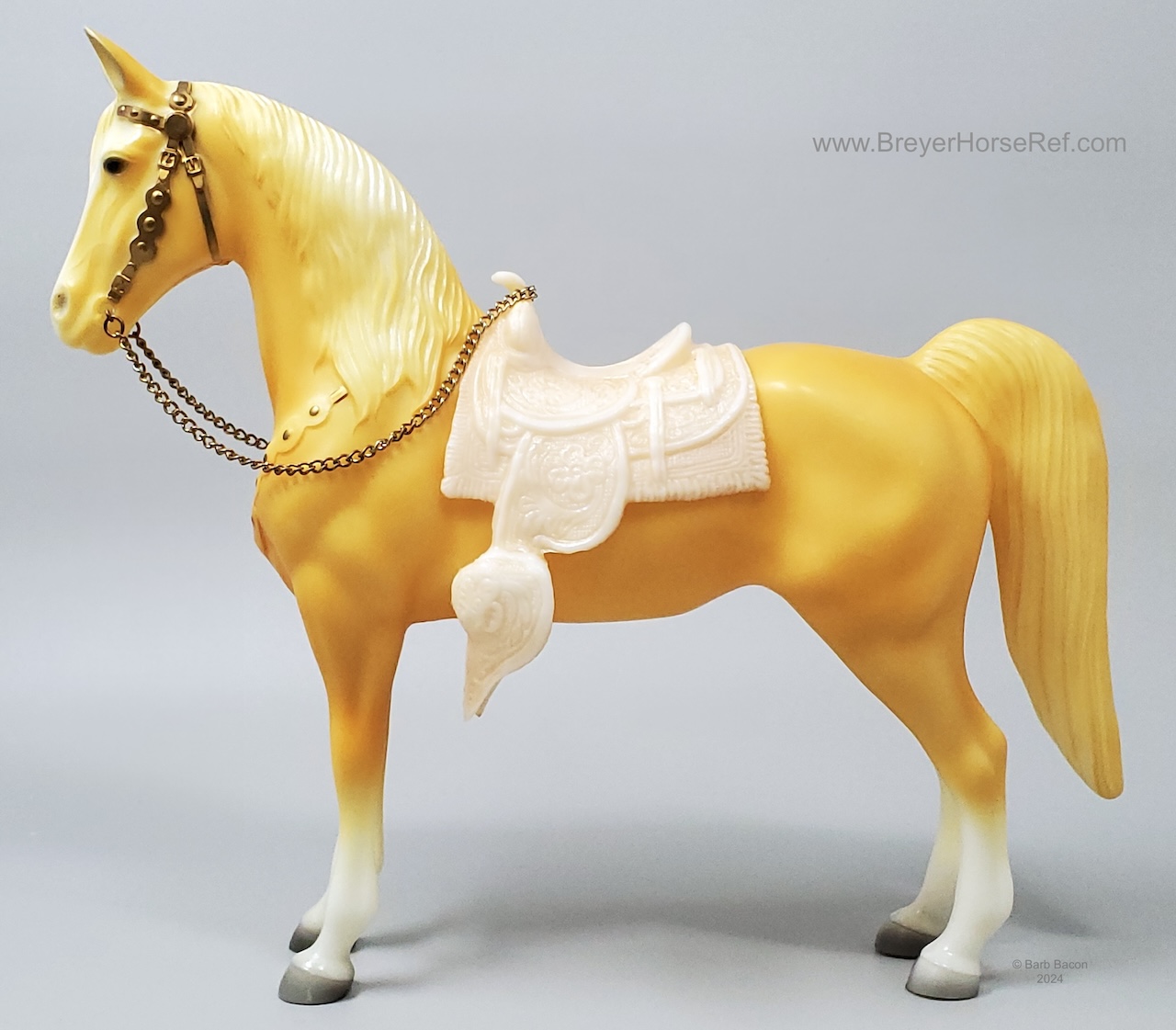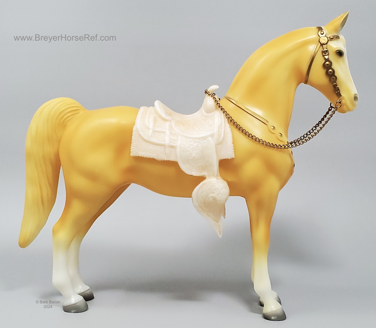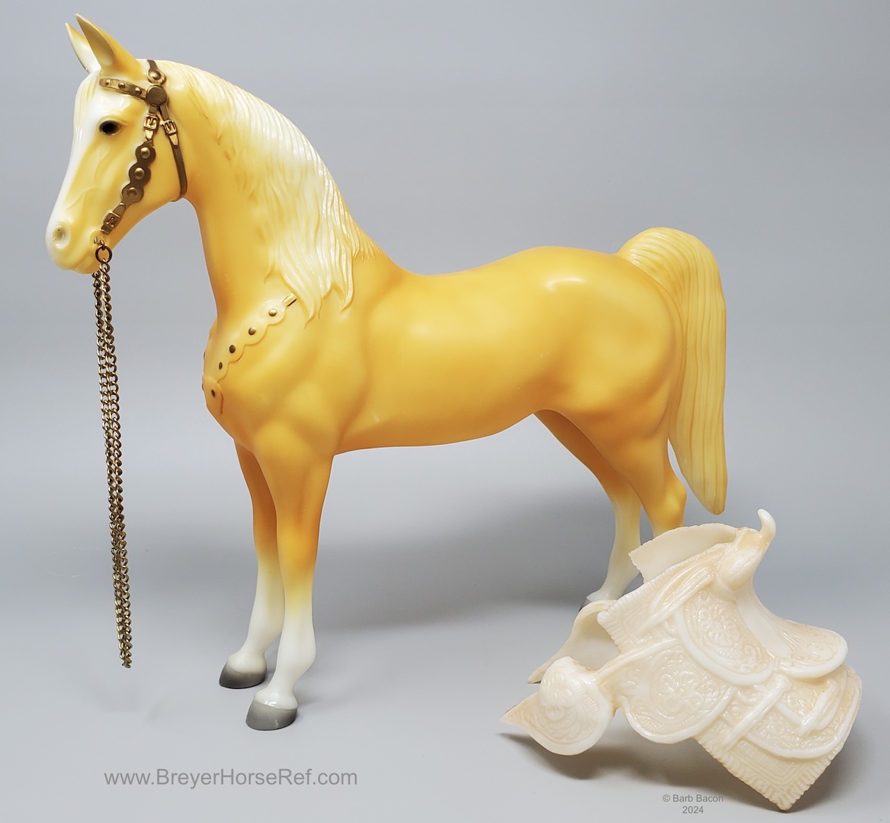 Palomino with bald face and four stockings with white or palomino shaded mane and tail. This model is identical to later releases of #57 but updated with a ’95 stamp on the inner back right leg. Some models were released without the '95 stamp and are indistinguishable from the regular run.
