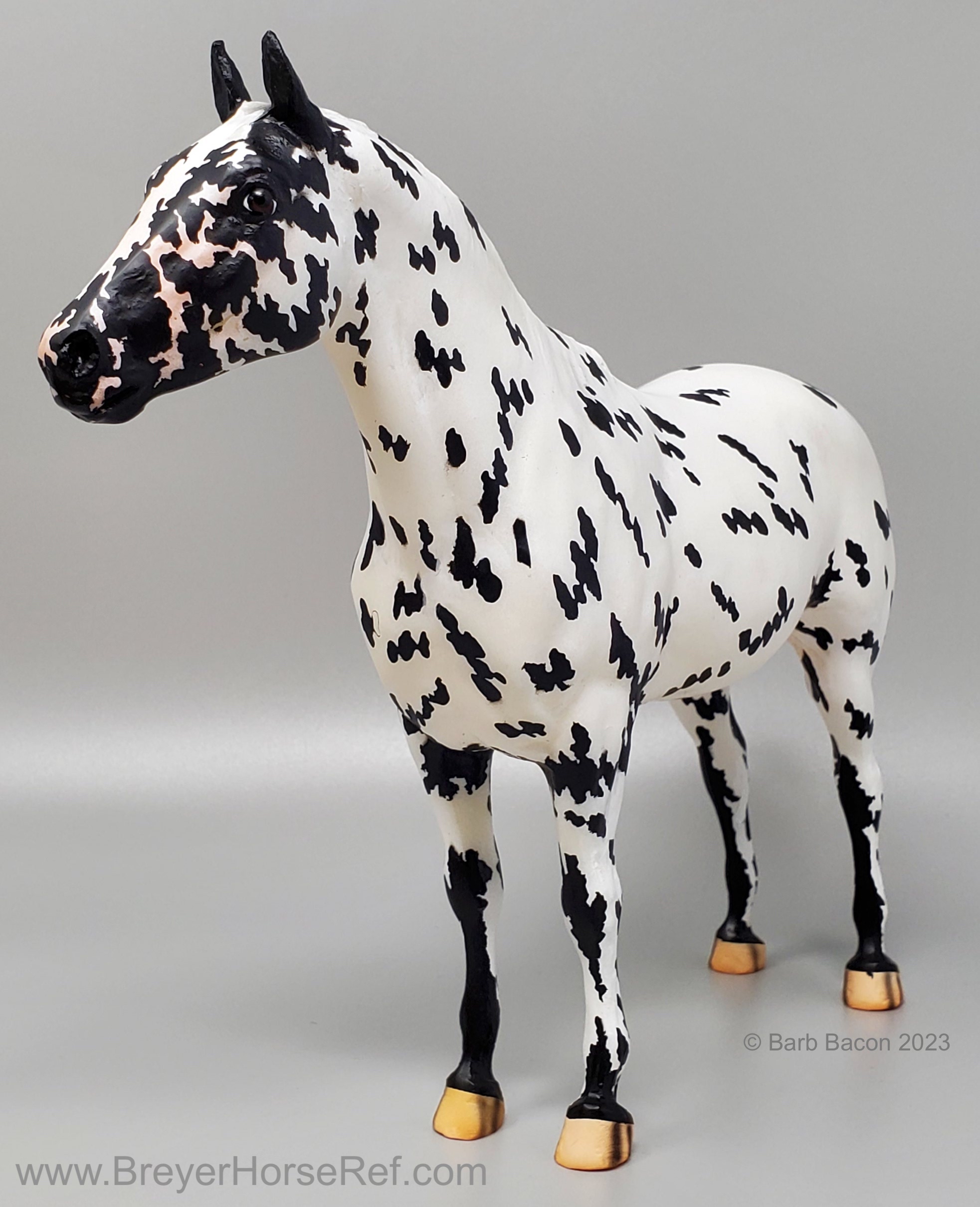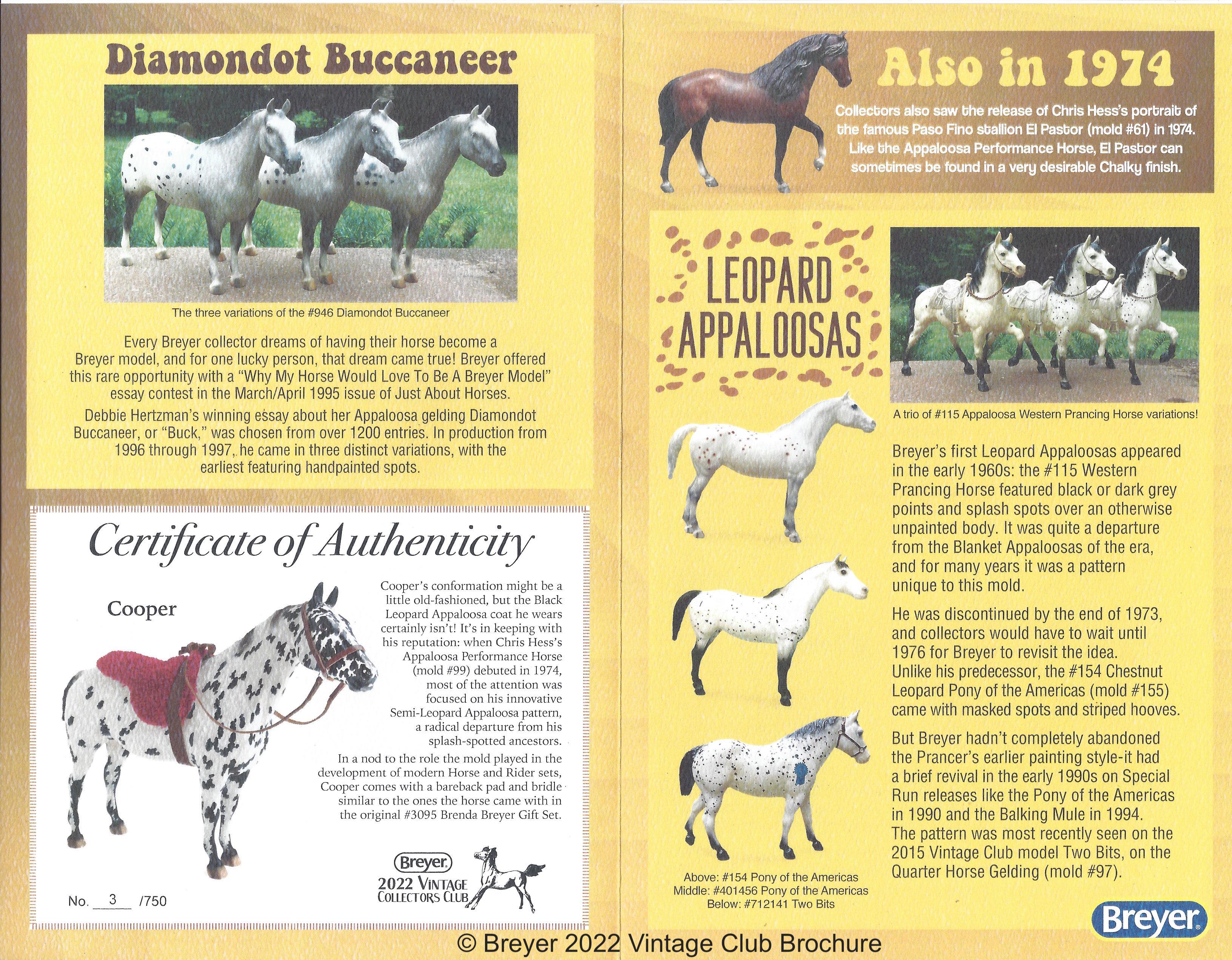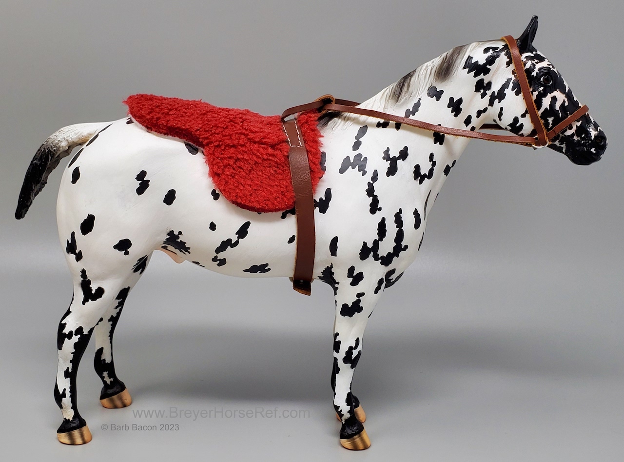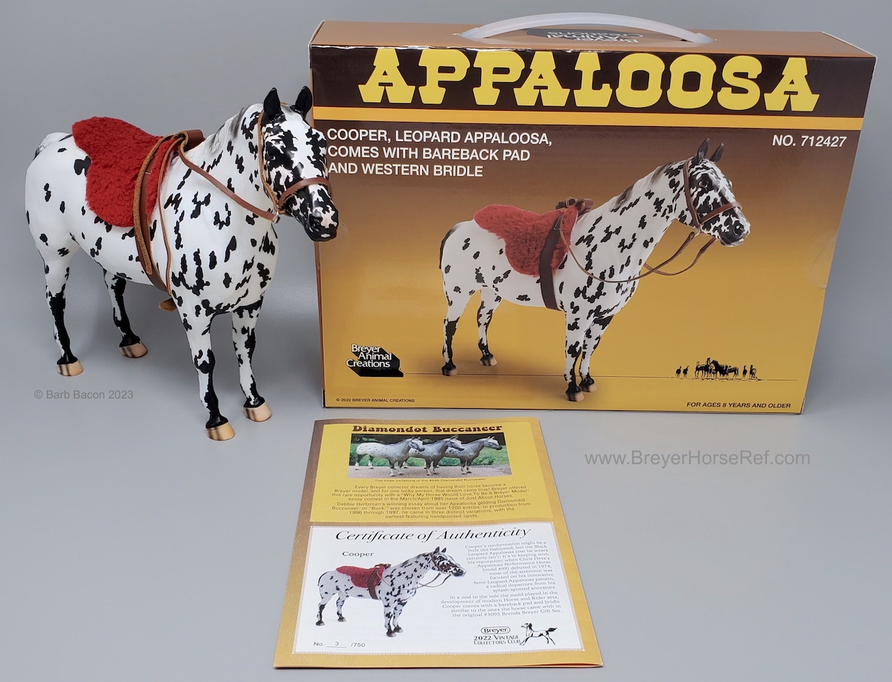 "The first release of 2022 - Cooper! Inspired by the original Brenda Breyer Gift Set from 1980, Cooper includes an era-accurate bareback saddle and bridle set. This vintage throwback is paired with an ultra-modern leopard appaloosa paint job, bringing some new life into the beloved Appaloosa Performance Horse. Cooper includes a certificate of authenticity booklet and retro-style box." www.breyerhorses.com.