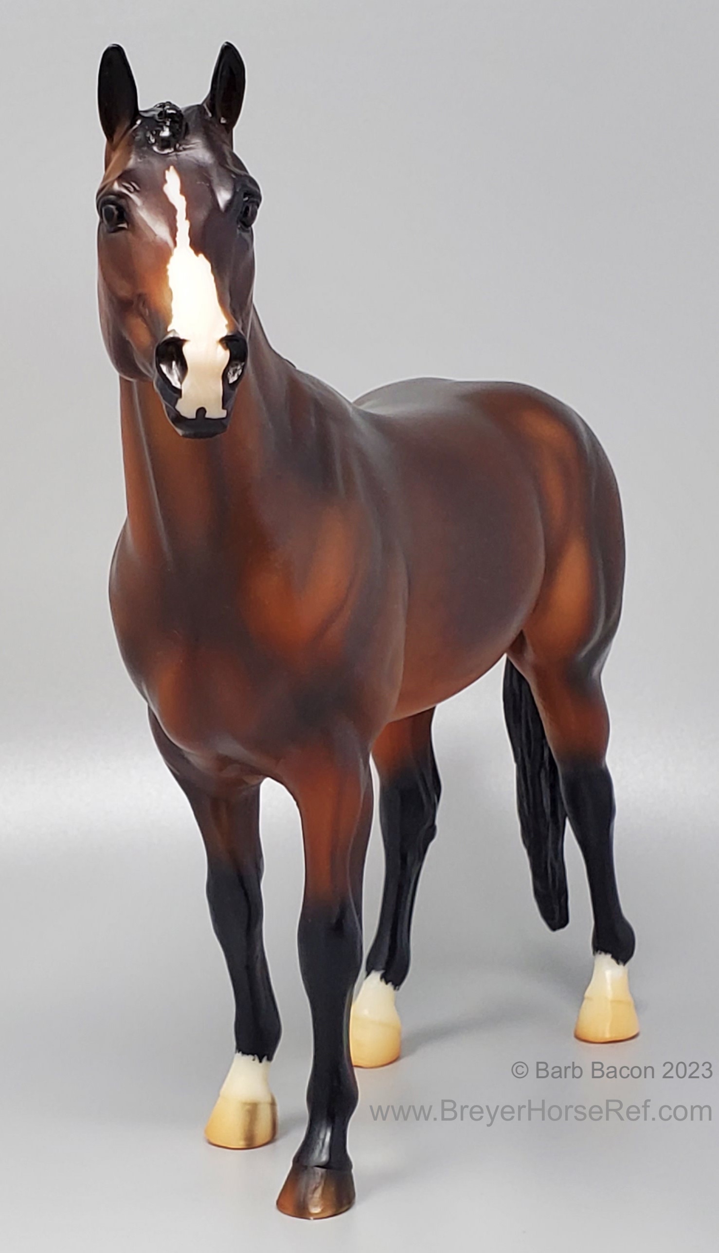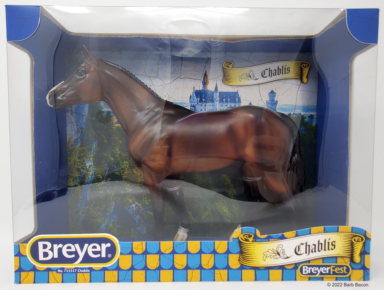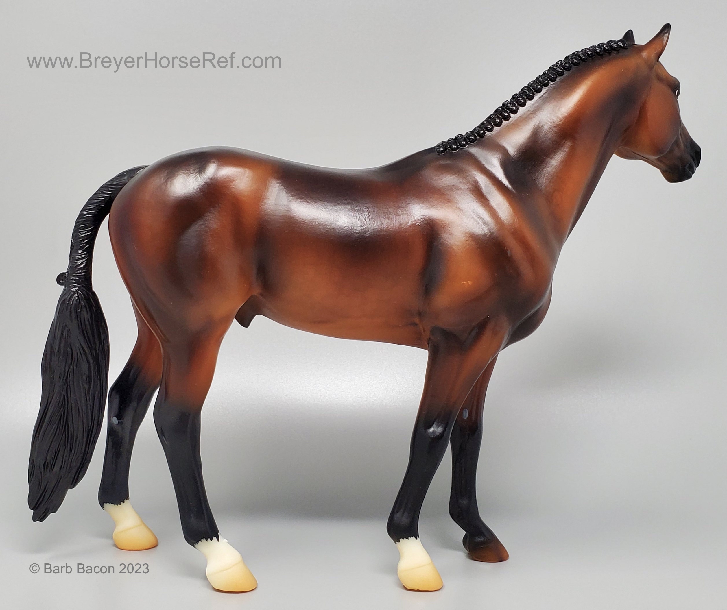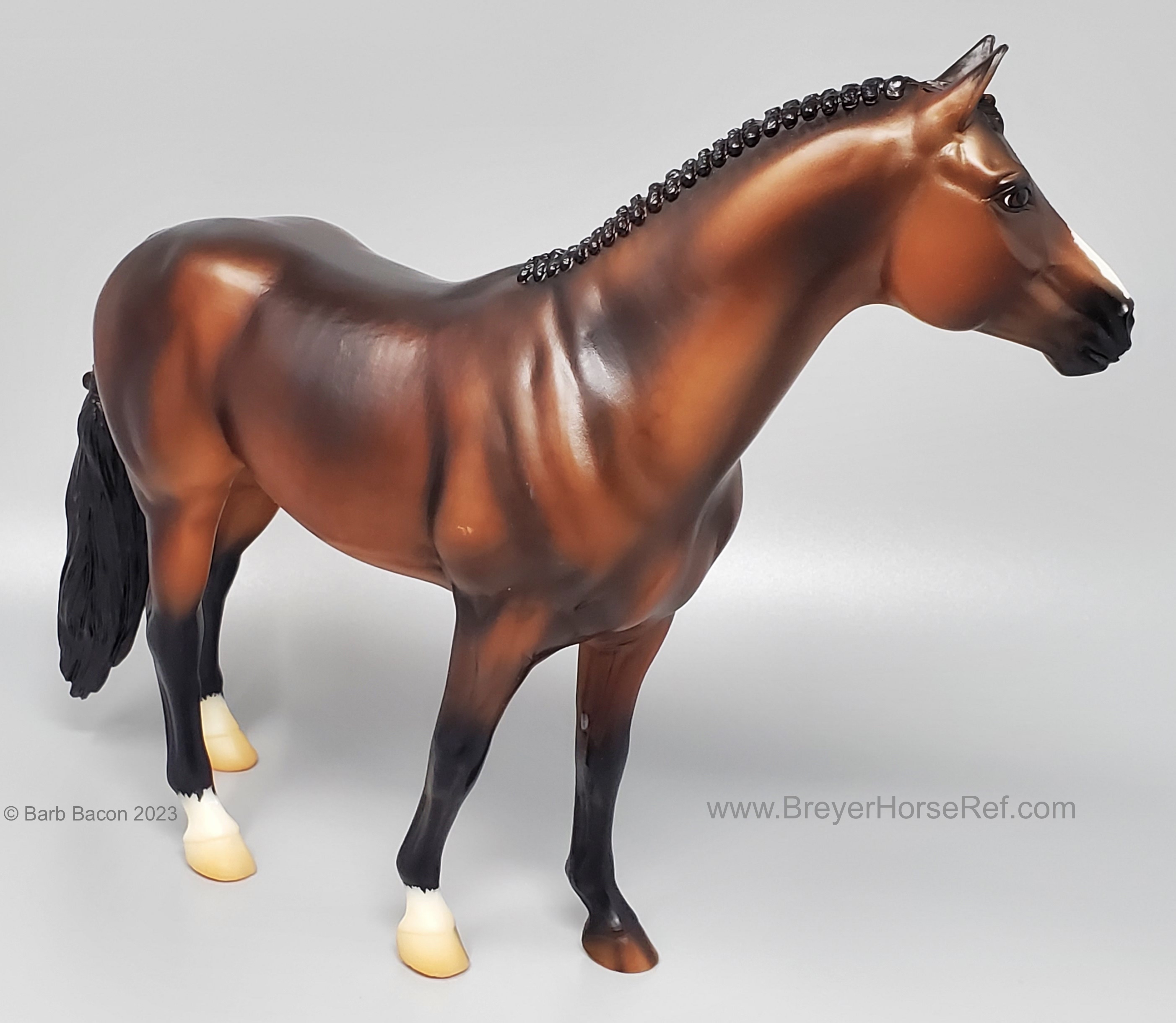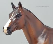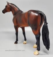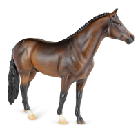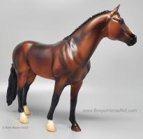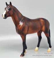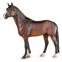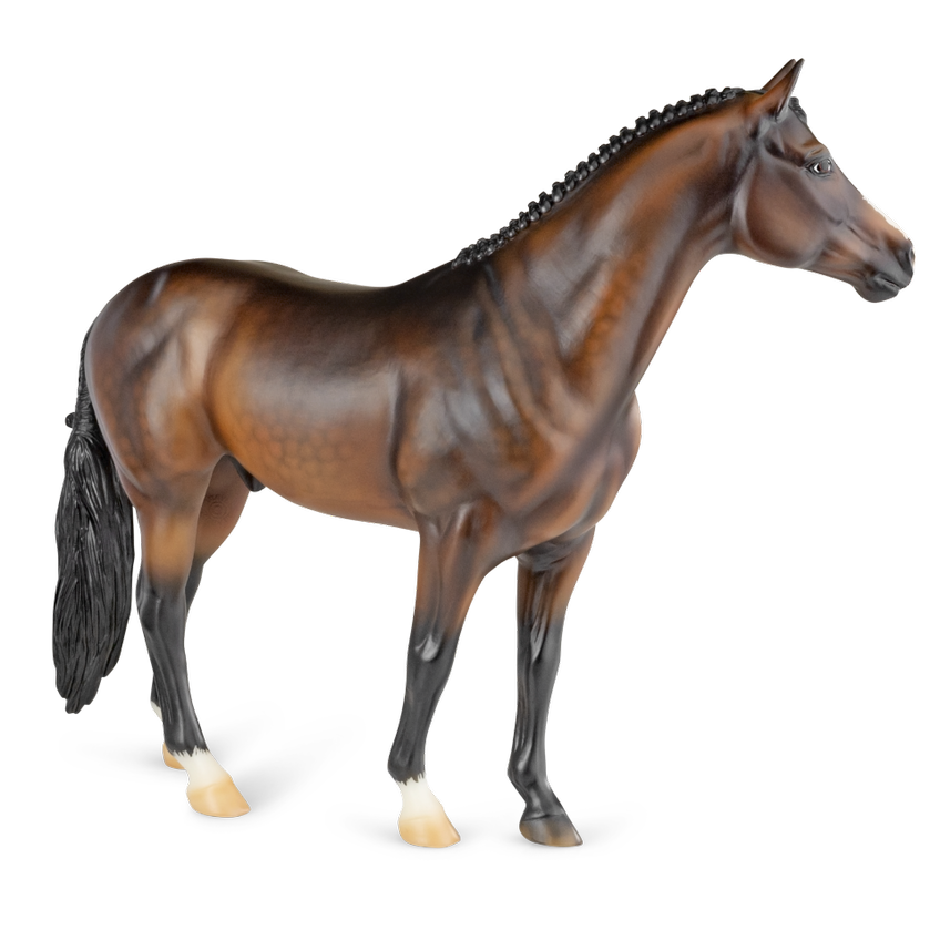 At BreyerFest this summer, we are so excited for fans to meet Chablis, a multi-champion Württemberger hunter. He has been immortalized as one of BreyerFest’s Limited Edition Traditional models, available to all BreyerFest: Prost! ticket holders, whether you’re joining us in person or online. Done on Susan Carlton Sifton’s Warmblood Stallion, mold #711, Chablis is a stunning dark bay with dappling and three white socks. Chablis is a Württemberger gelding who knows he’s turning heads in the hunter ring for more than one reason. The stunning dark bay with an equally stunning jump is owned by Libertas Farm, LLC, and ridden by Kelly Tropin. As a young horse Chablis showed promising talent and a natural affinity towards the hunters. Together the pair has won numerous championships and high score awards in the 3’6 Amateur Owner division at the National Horse Show, Pennsylvania National Horse Show, Washington International Horse Show, WCHR week at the Winter Equestrian Festival, and at the Hampton Classic. On top of his many championships, Chablis was named the 2020 WCHR Hunter of the Year. His long list of achievements prove Chablis is no stranger to the spotlight!" www.breyerhorses.com.