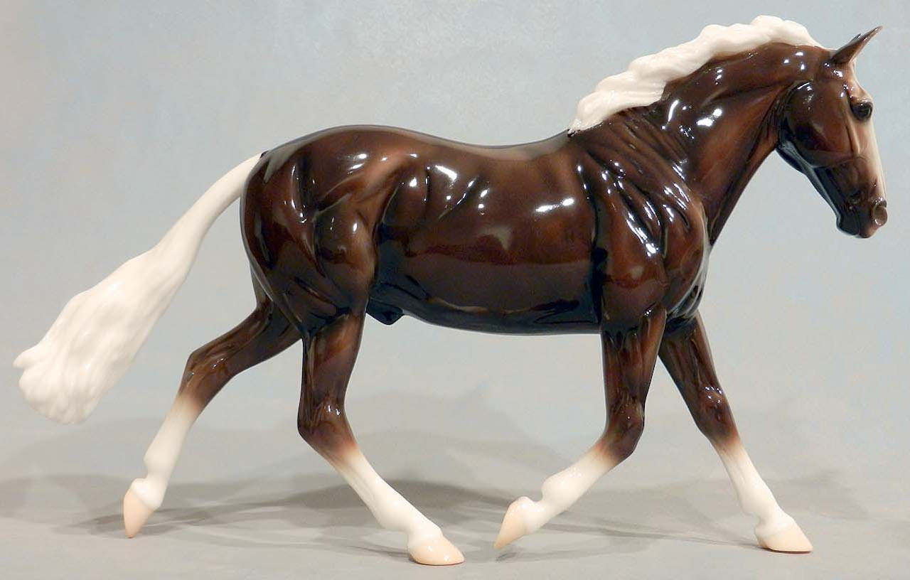 Glossy charcoal Cleveland Bay. This model was originally sculpted by Karen Gerhardt, and also painted by her at Breyer HQ in New Jersey in September 2013. Comes with a COA. Documented test painted by the Breyer painting staff and gifted to Karen.