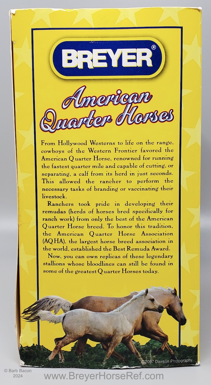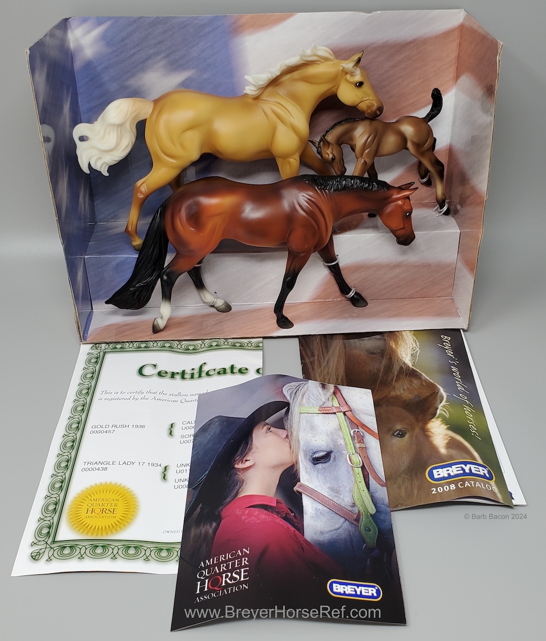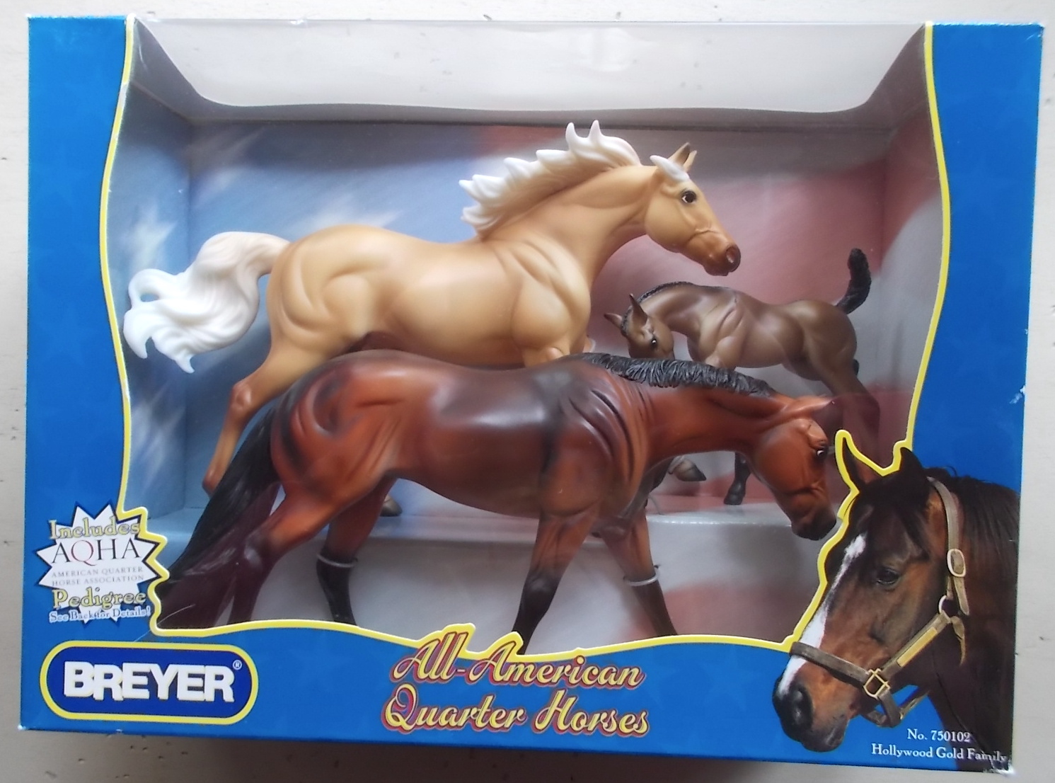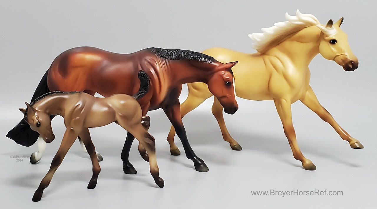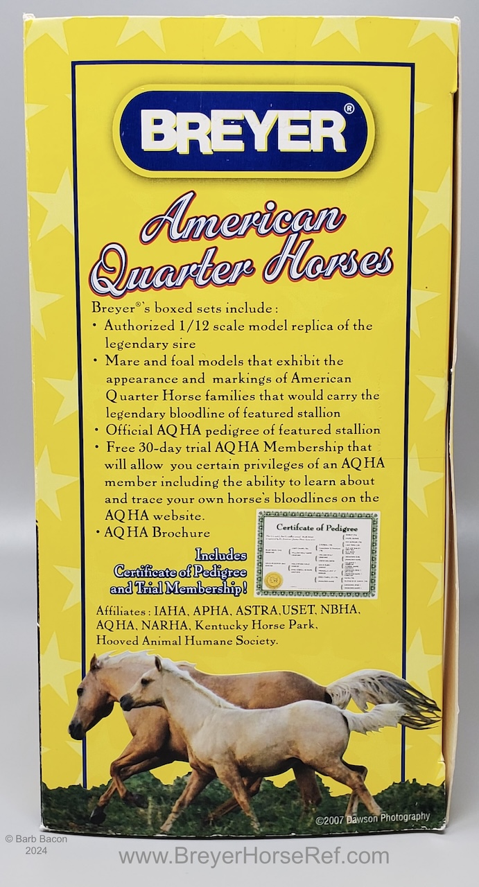 Set included a palomino dun American Quarter Horse Stallion, bay Mare and grulla Foal. Included a Certificate of Pedigree and an AQHA brochure.