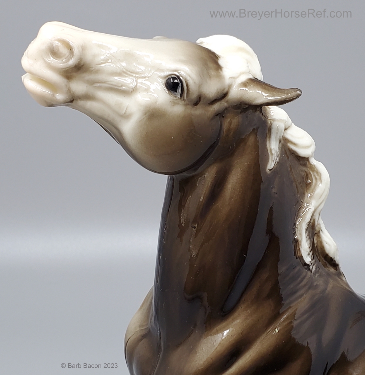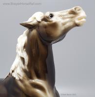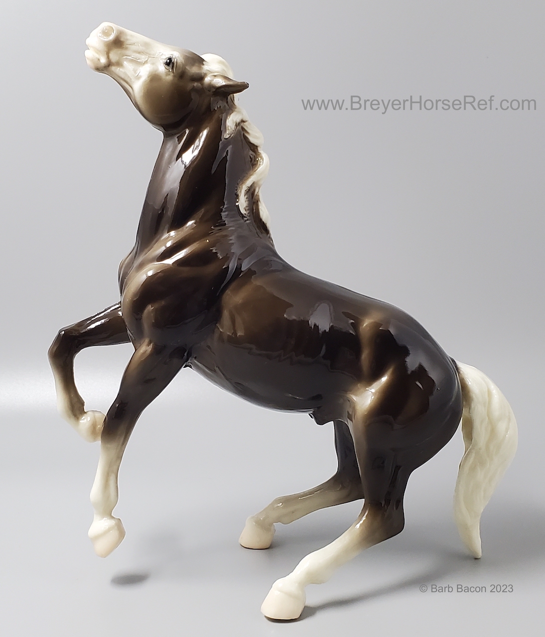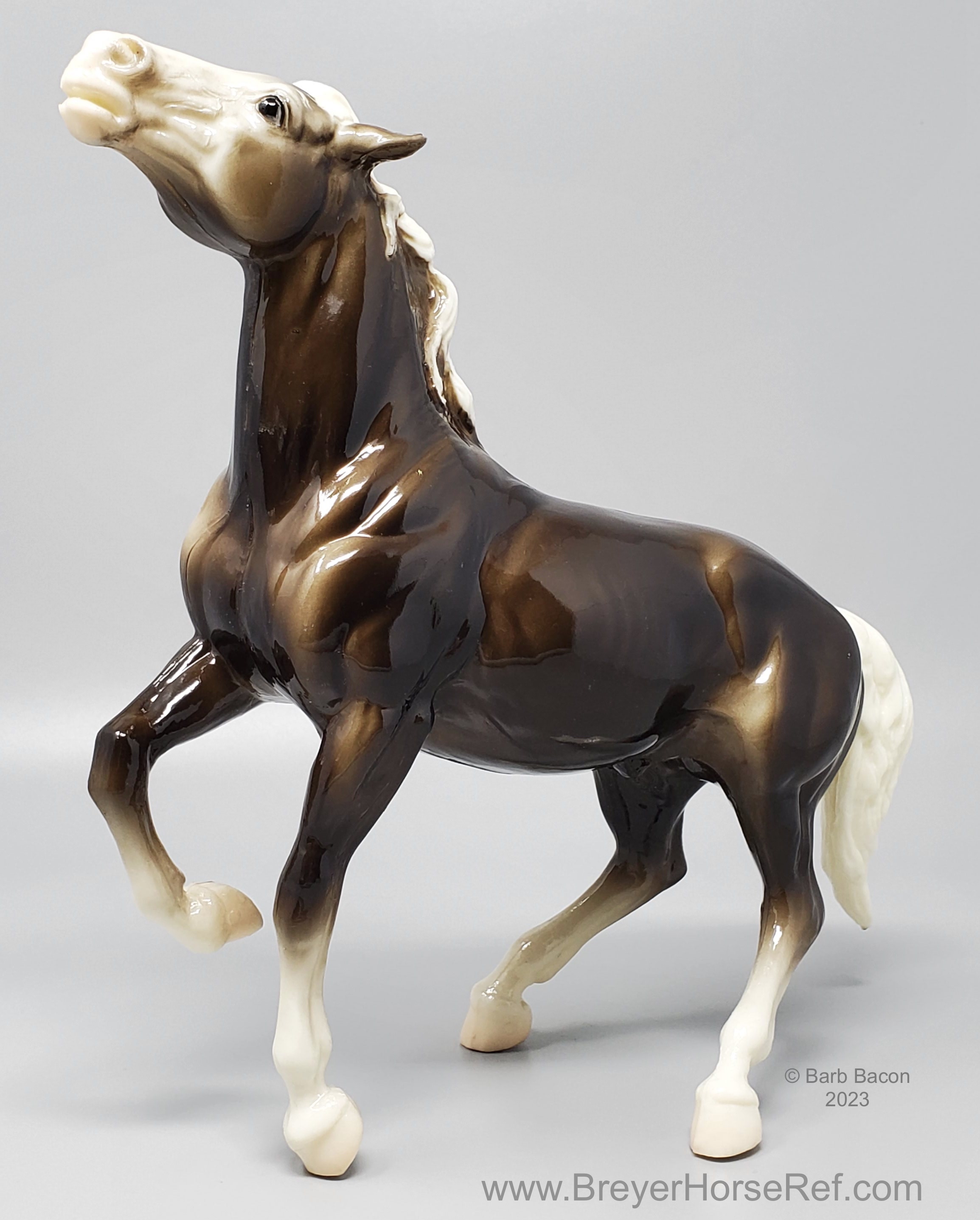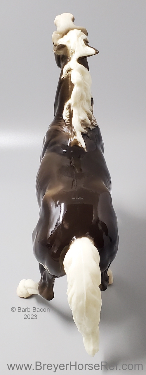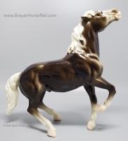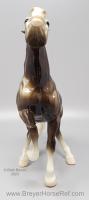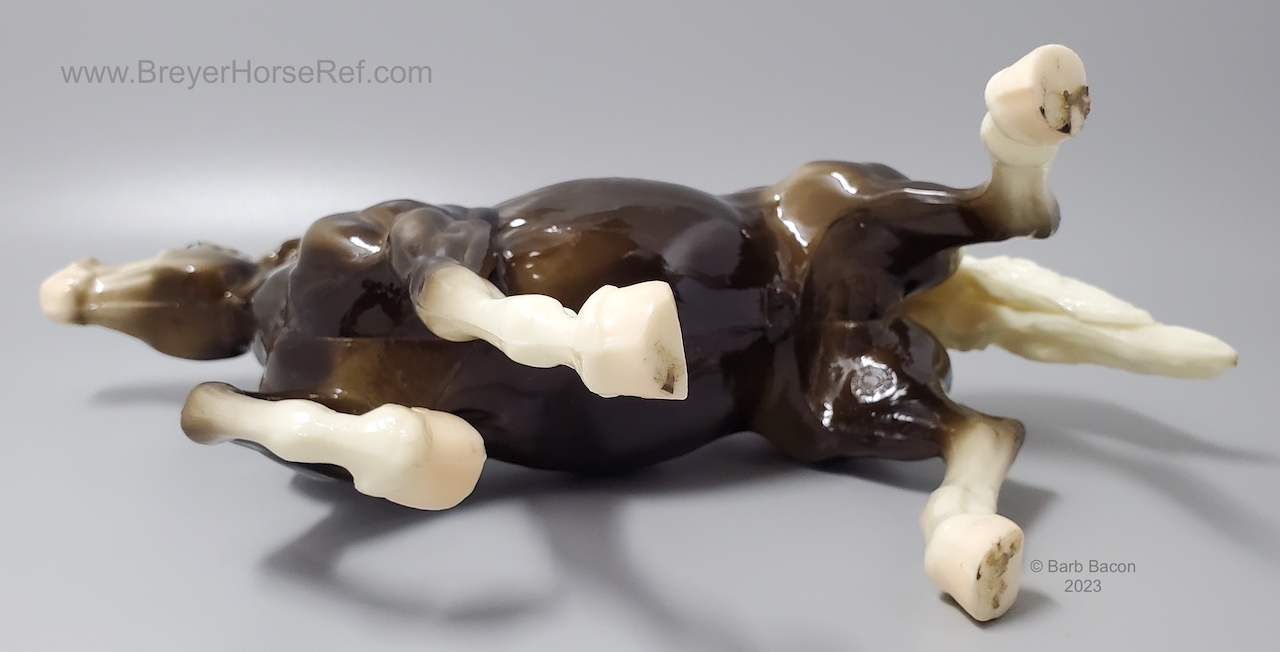 Glossy Charcoal with color varying from dark brown to black, white points with pink or white hooves, and bald face. Early models had eye whites (most eye whites had ended by 1969). Has the round Breyer Molding Co Copyright Stamp, and around 1970, the USA Stamp was added. Through the 60's, the left front hoof was pared down to help with stability. From 1961-1968, this mold was called 'Diablo - The Mustang'.