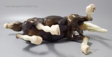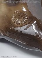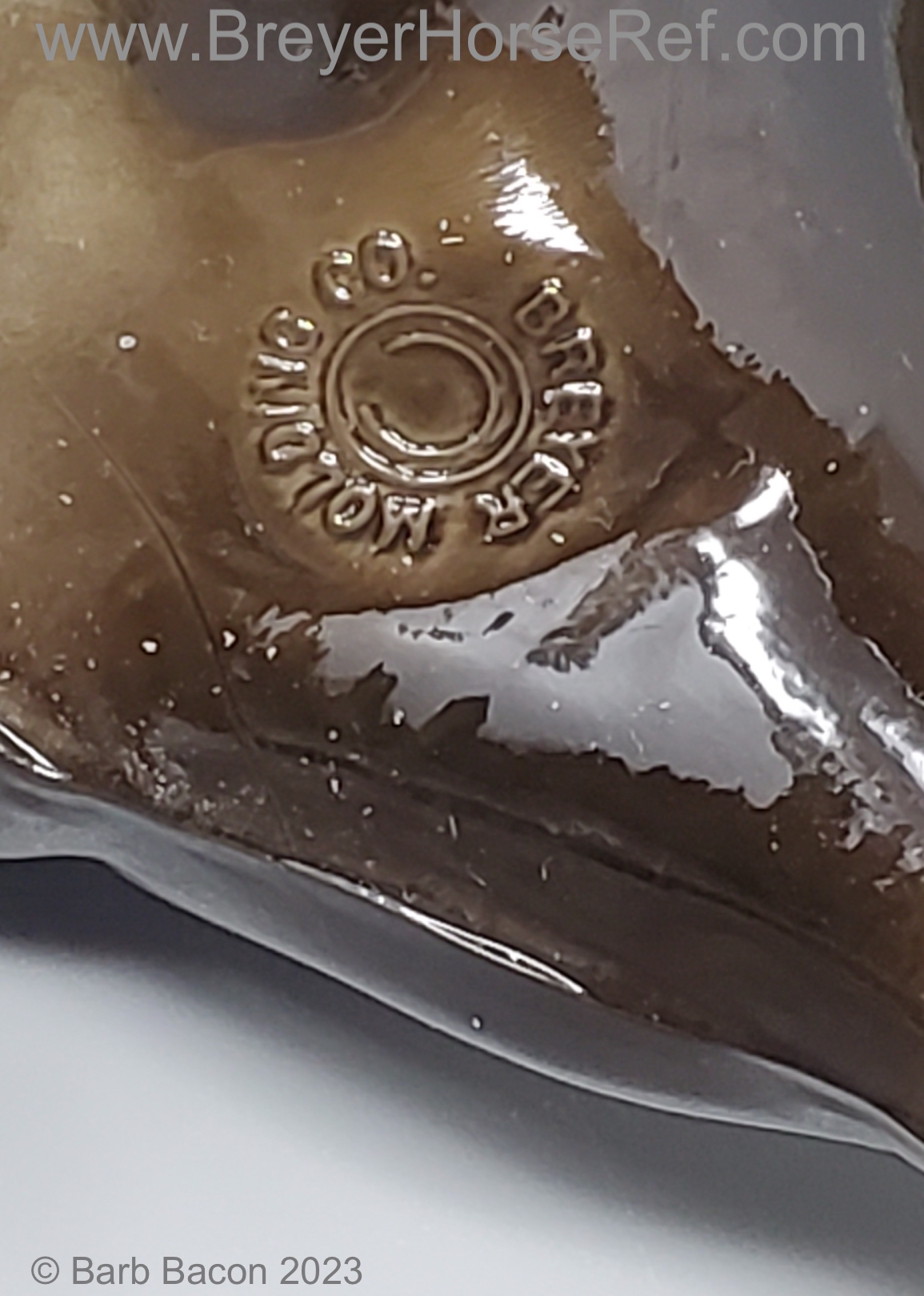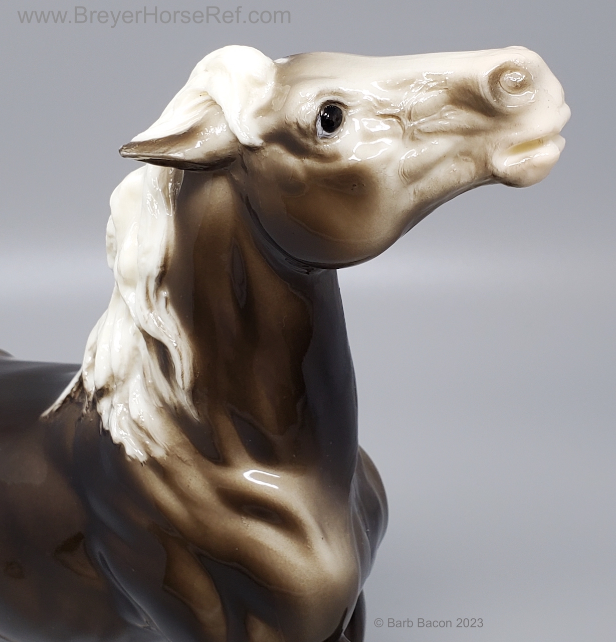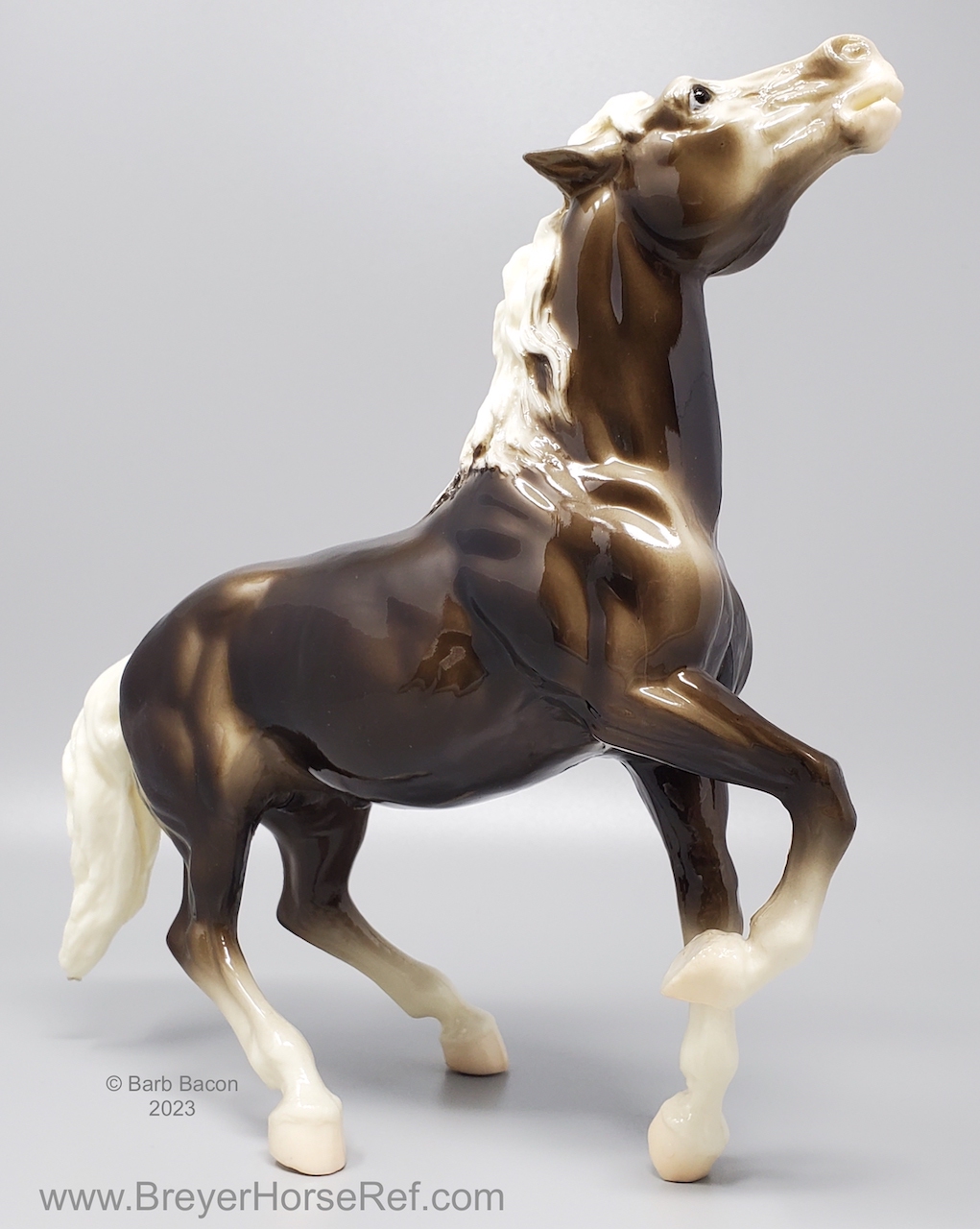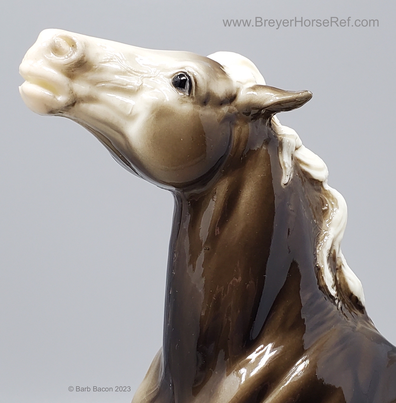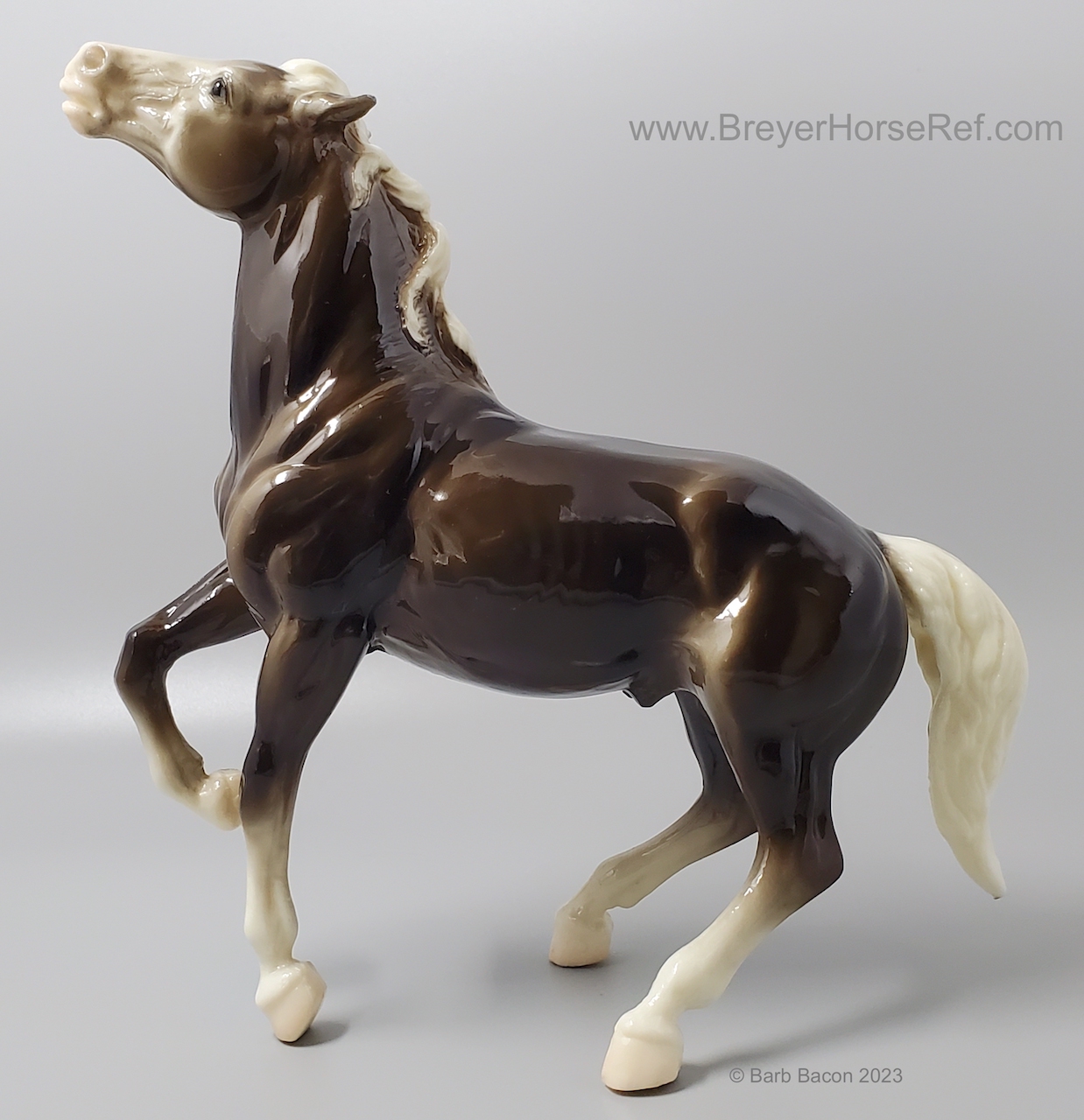 Glossy Charcoal with color varying from dark brown to black, white points with pink or white hooves, and bald face. Early models had eye whites (most eye whites had ended by 1969). Has the round Breyer Molding Co Copyright Stamp, and around 1970, the USA Stamp was added. Through the 60's, the left front hoof was pared down to help with stability. From 1961-1968, this mold was called 'Diablo - The Mustang'.