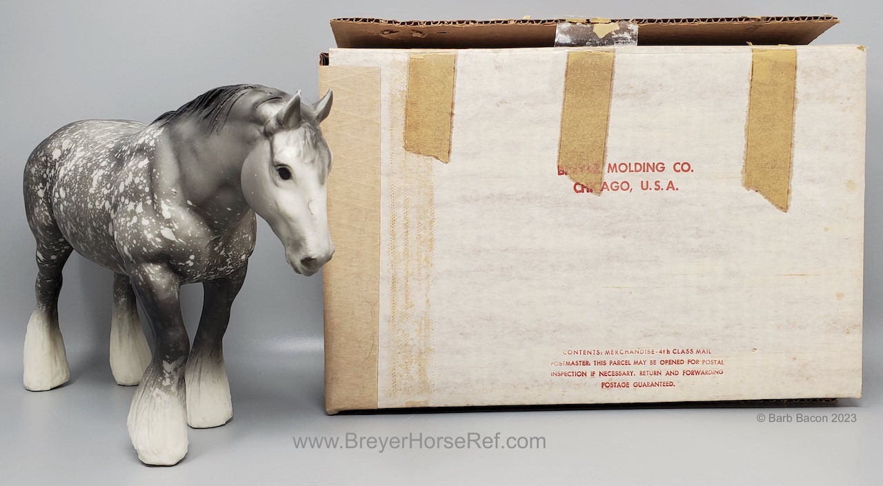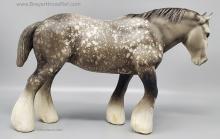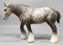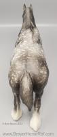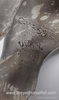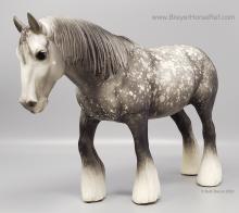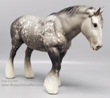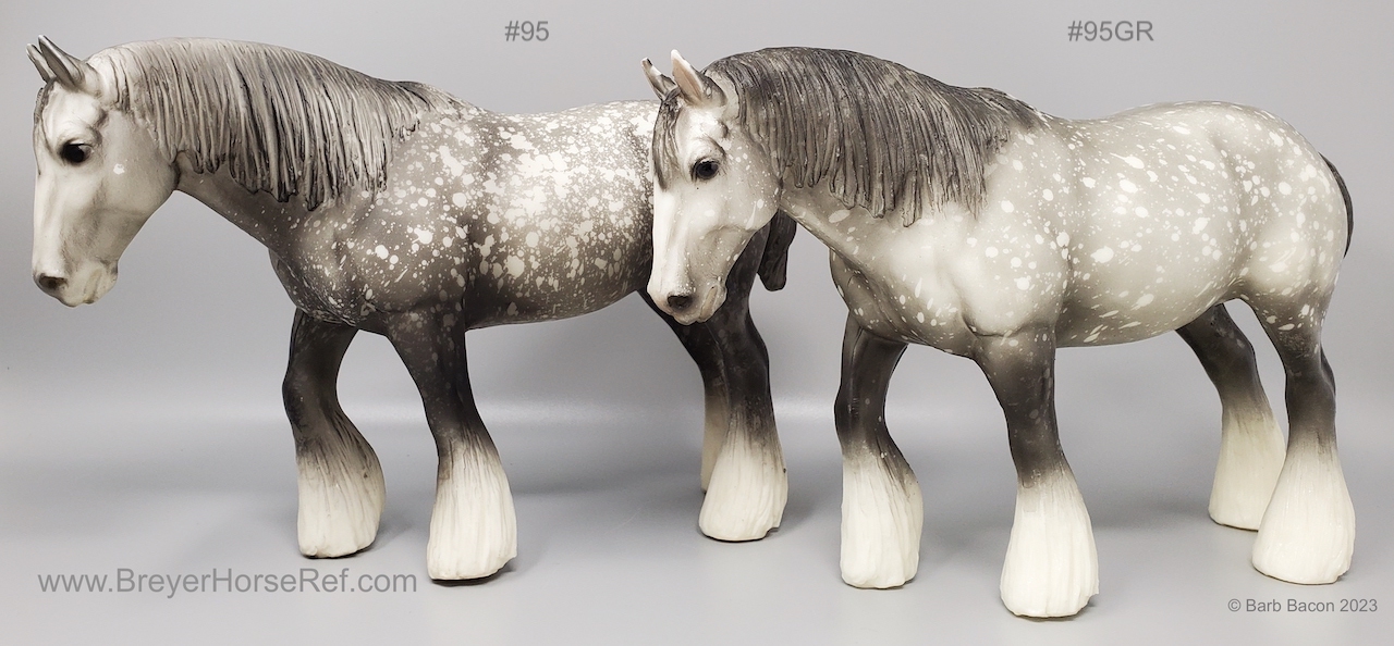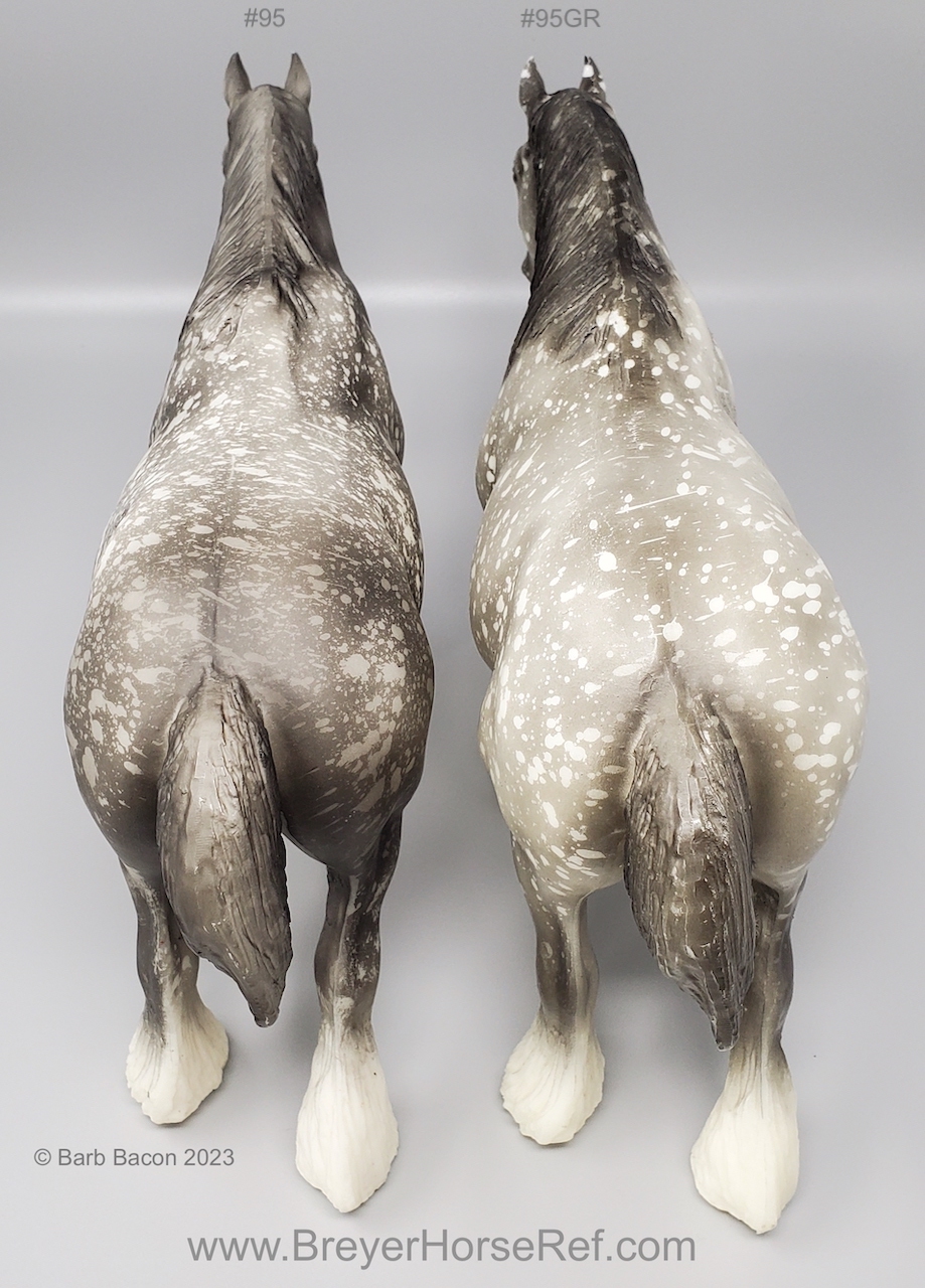 Dapple Grey with darker mane and tail, dark grey shading, white feathers, some models had a dorsal stripe, bald face with grey nose and ears, and sparse dapples on head and upper neck.