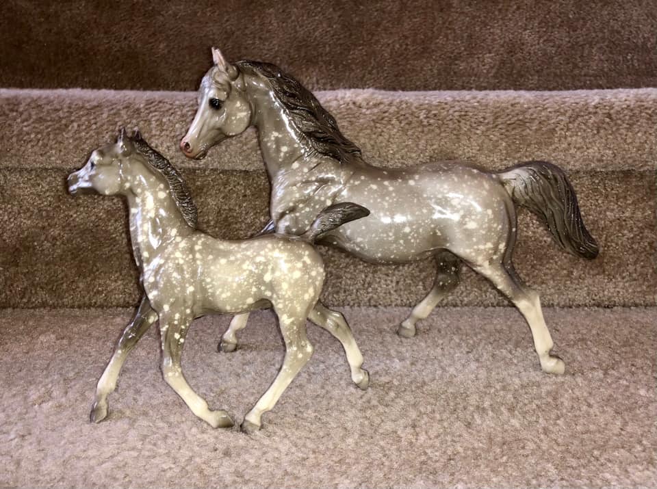 Glossy dapple grey, grey mane and tail, 4 stockings with grey hooves, with dappling that covers the neck and head. This model appears to be a separate run from the Glossy Dapple Grey Mare that was discontinued in 1973. There was a #123 sticker on the box. Estimated small release in 1977 or 1978, with unknown small quantity. A set of these models was also found in the Francis Collection. These models were released several years before the 1982 release of the Matte Dapple Grey Running Mare.