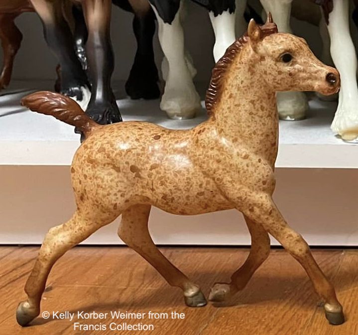 This model came from the Francis Collection, which dates it to 1977-1978 timeframe. The special run of Red Roan Running Foals did not happen until 1982. So it is assumed this model was specially painted to match the regular run Red Roan Running Mare. Only one known to exist at this time. Pictured with a mare that appears to be from the regular run.