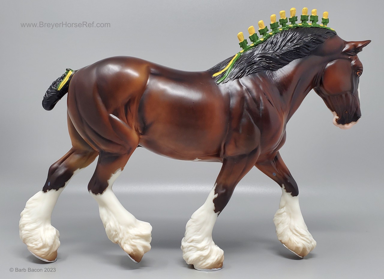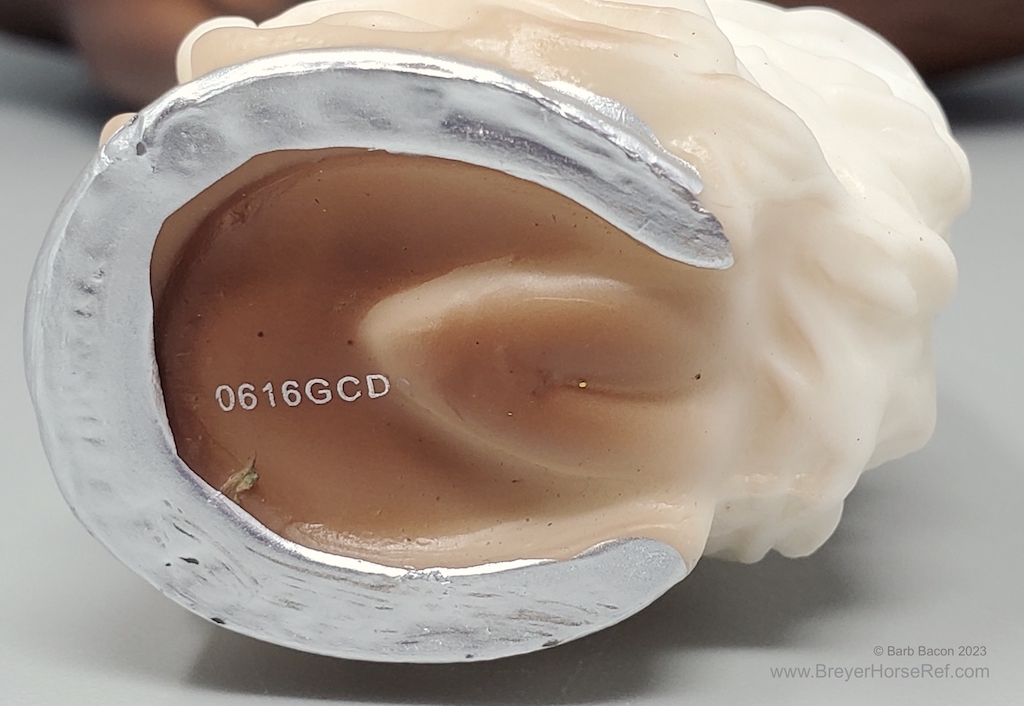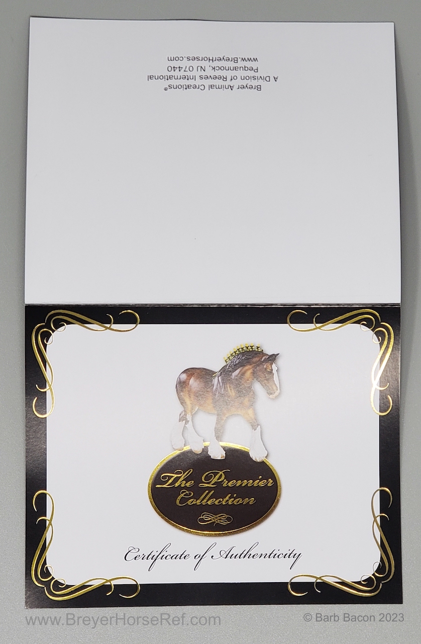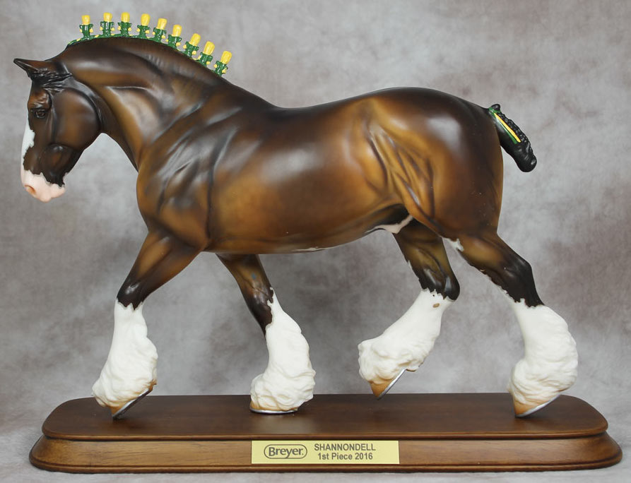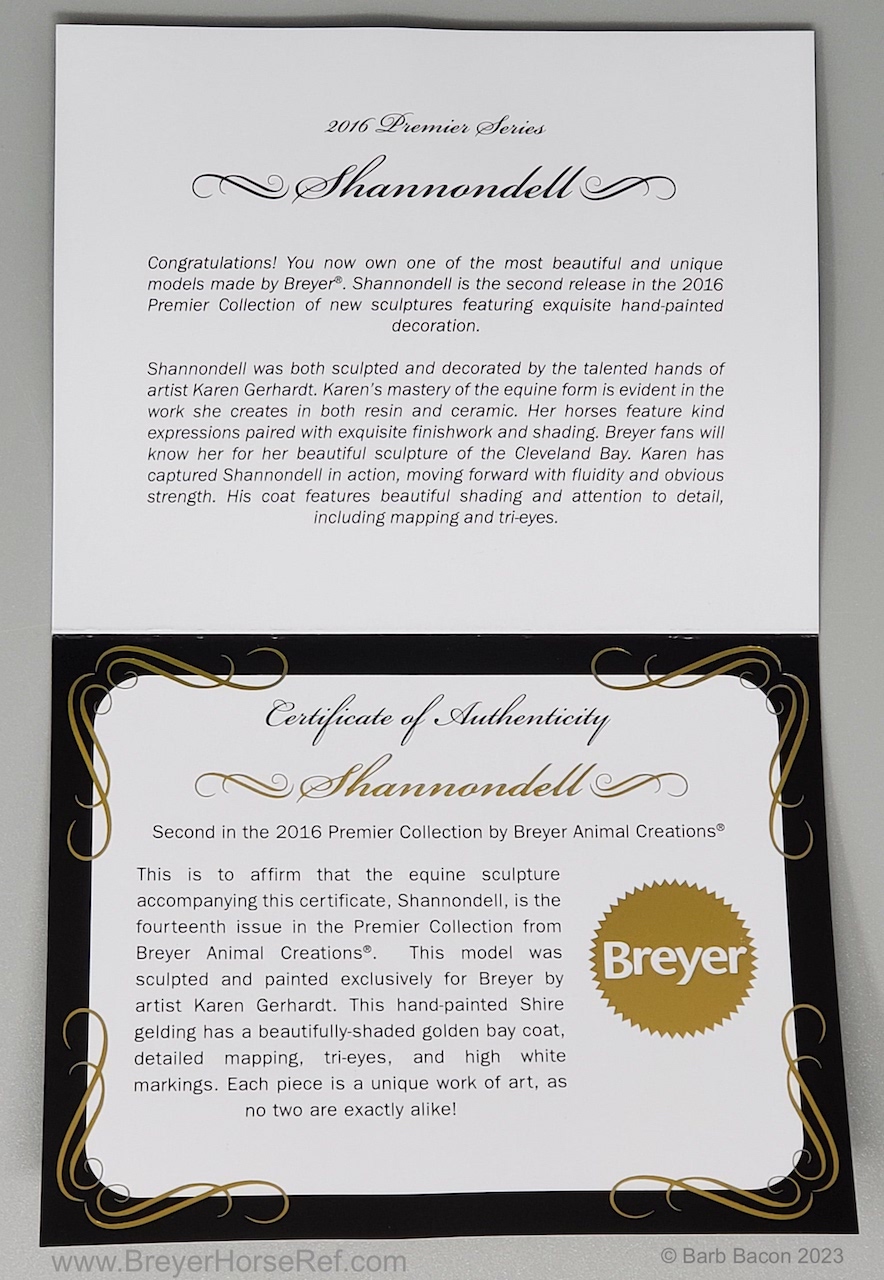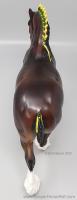 Bay Sabino with COA. The first model of this production run was attached to a base with a brass plate with the model's name and year released. This model had two versions, one with mane bobs and short braided tail (90180), and the other had a loose mane and tail (90183). Unknown how many of each were made.