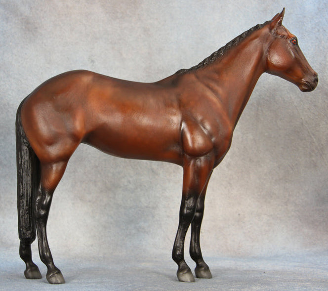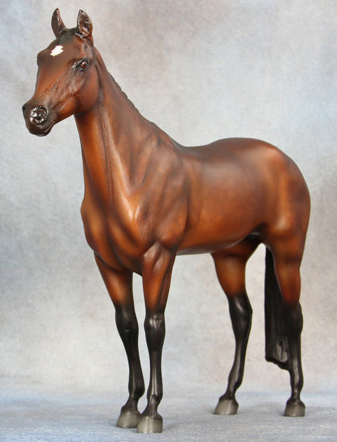 "To this day there is one horse that has held the record for the most gold medals won from the Olympic Games since 1960: that horse is Hans Günter Winkler’s Halla. This talented and quirky Standardbred mare defied all odds and became one of Germany’s most decorated show jumpers. After 125 recorded jumping competition wins, Halla retired in 1960, the same year she won her third gold medal at the Rome Olympics. To honor the amazing mare, a statue was erected in front of the German Olympic Equestrian Committee headquarters in Warendorf, Germany. It was also decided by the Equestrian Federation that no competition horse is to compete under the name Halla again. To honor this incredible German mare, Breyer’s original Halla design has been given a modern makeover specially for BreyerFest: Prost! Done on mold #63, sculpted by Chris Hess, this beautiful girl has been re-done in a rich bay with subtle dappling, just like the real mare she was sculpted after. This Halla portrait is extra-special as mold #63 is no longer in use. First released in 1977, the metal tool was permanently altered in 1992 to create Bolya the Akhal-Teke. As such, only a finite number of unpainted Halla models are available for Breyer artists to use, adding an extra layer of collectibility to this beautiful model!" www.breyerhorses.com.