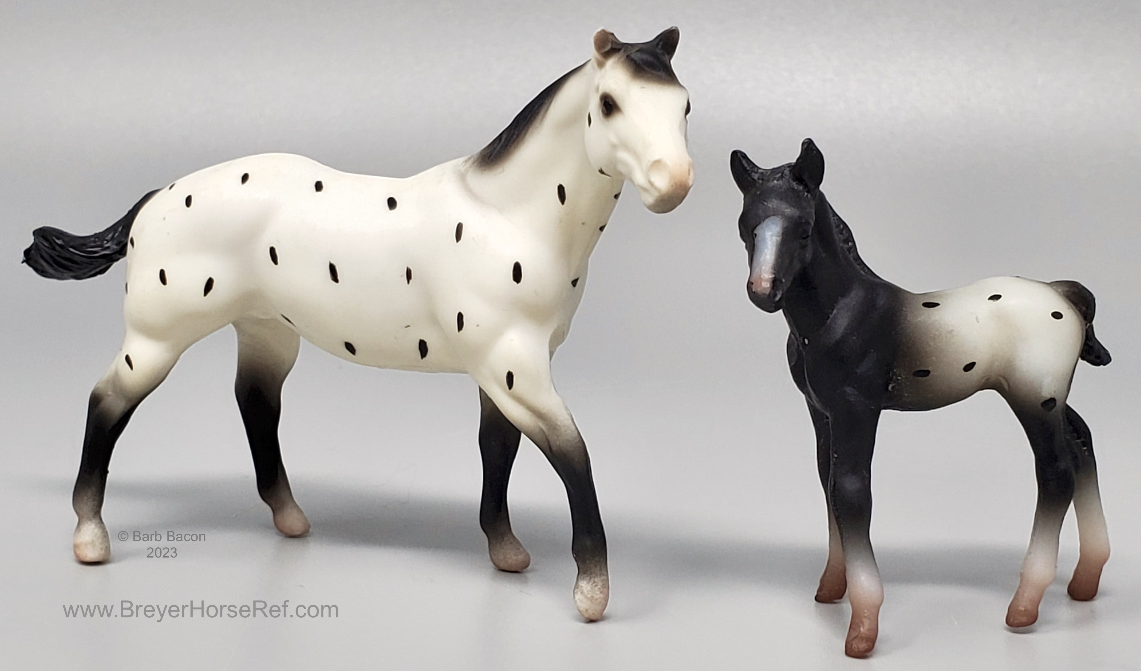 Black Leopard Appaloosa with black points. Advertised as a Mare, but the Quarter Horse Stallion was used, with the TB Standing Foal. #5997 was the assortment number for these sets. On the 1999 Retired List. There were problems with this mold, so many of these models had a lumpy belly with a stamp that wasn't there or was very washed out.