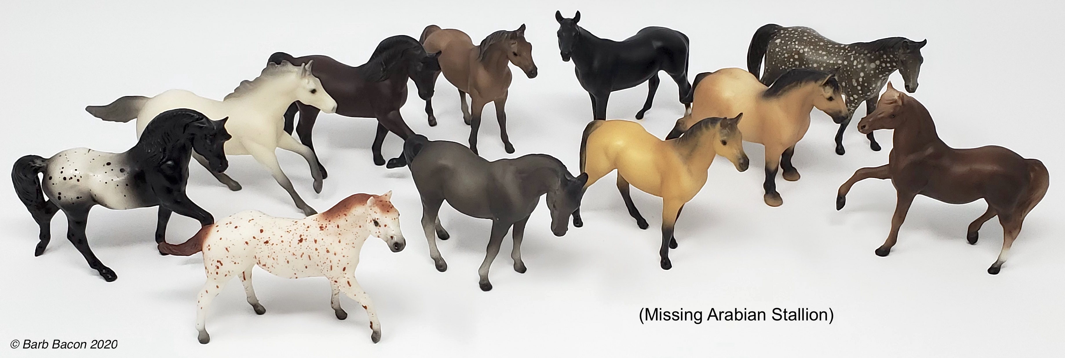 This set included a steel grey Arabian Mare, dapple chestnut Arabian Stallion, dapple grey Citation, buckskin Draft Horse, chocolate sorrel Morgan Mare, black blanket appaloosa Morgan Stallion, seal bay Morgan Stallion, black Native Dancer, red leopard appaloosa Quarter Horse Stallion, alabaster Seabiscuit, rose grey Silky Sullivan and a buckskin Swaps.